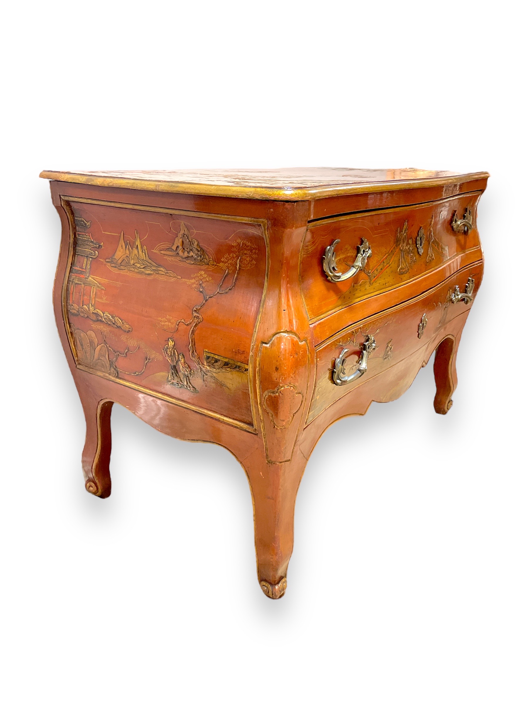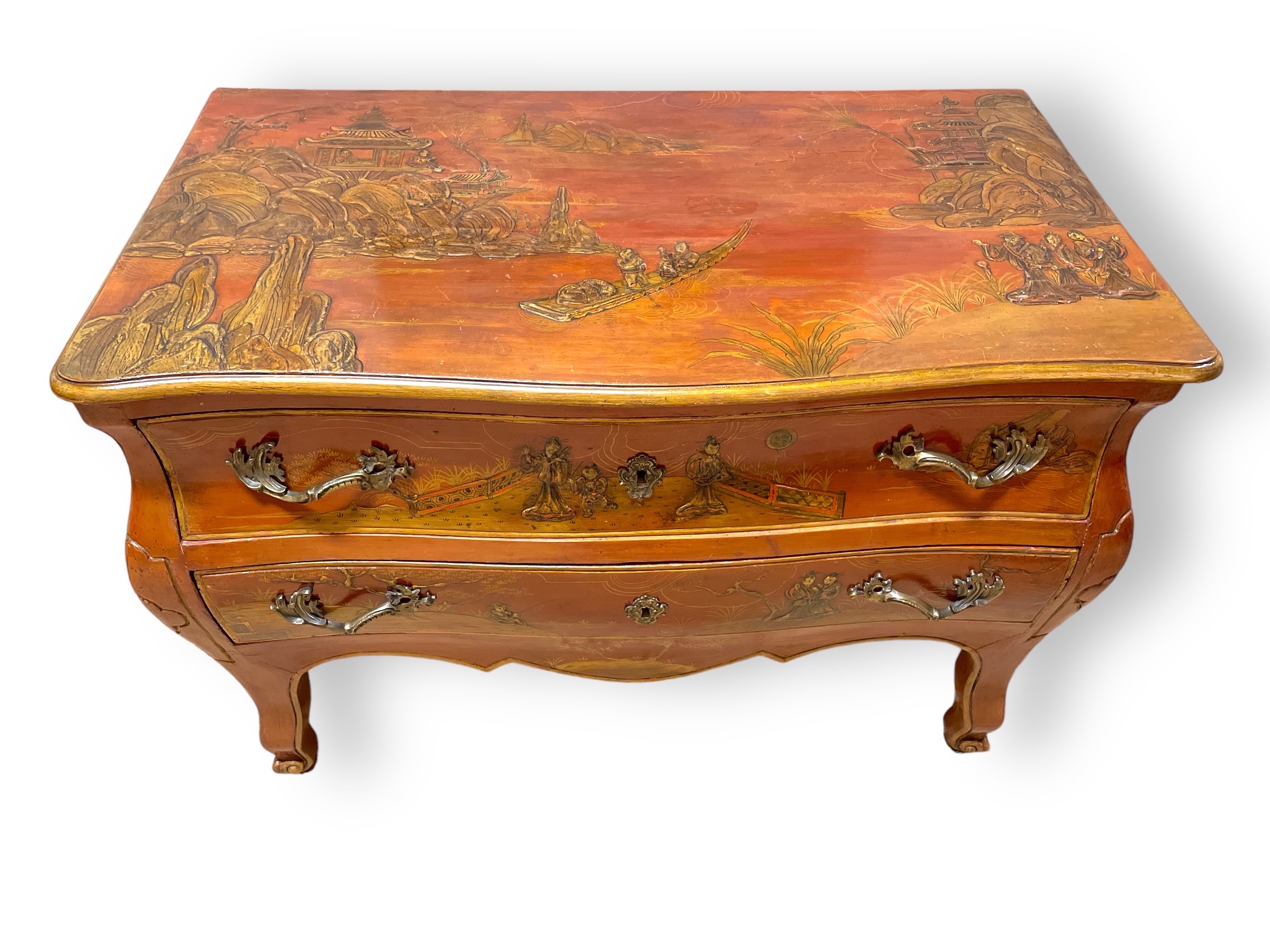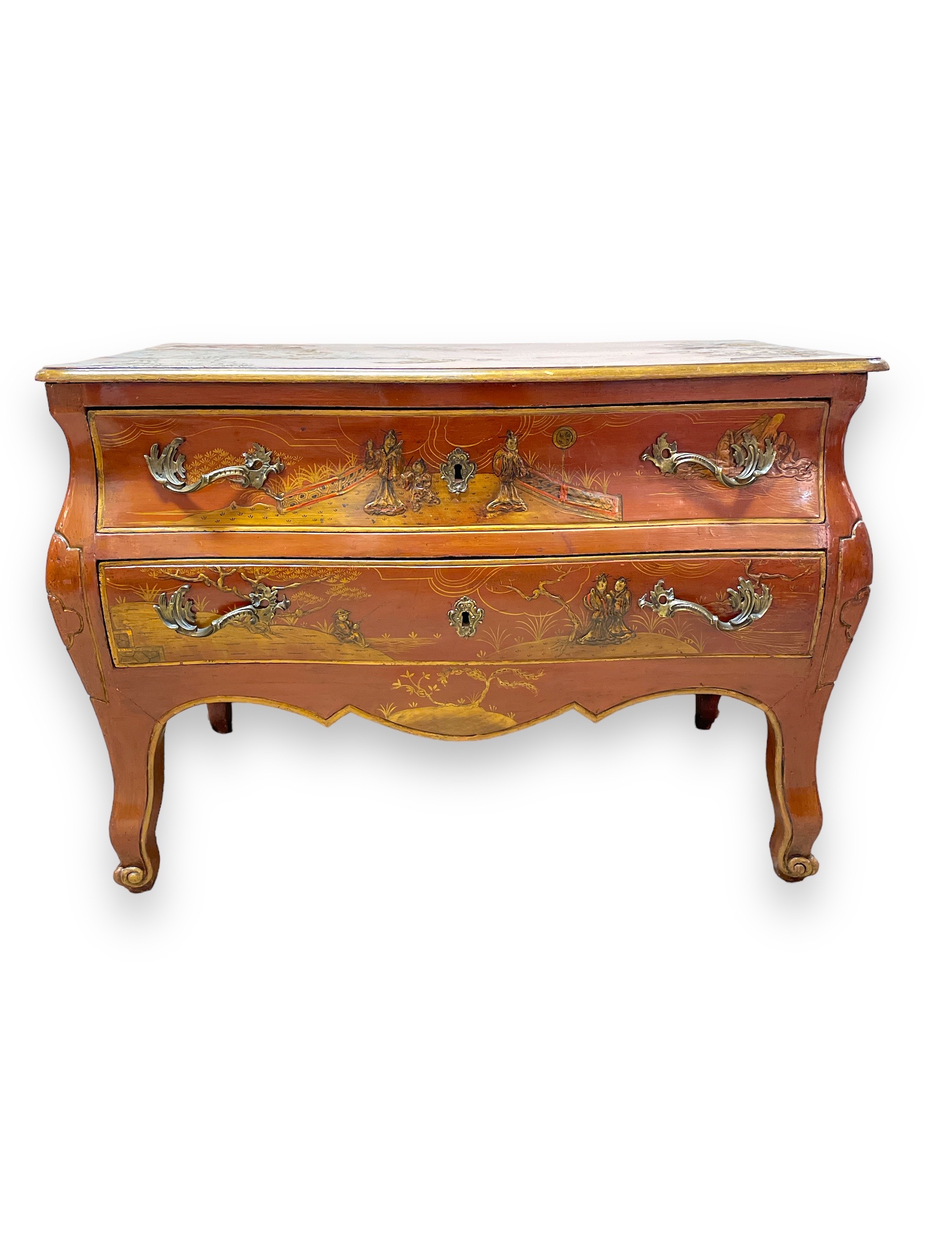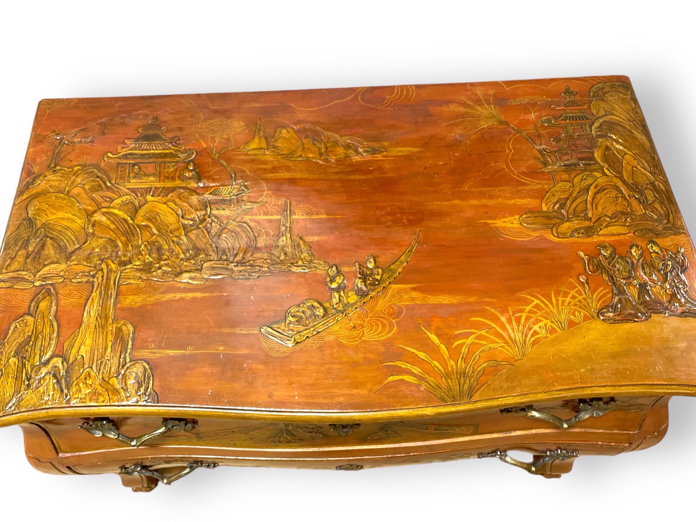 18th C French commode with later chinoiserie decoration in a lovely faded red.