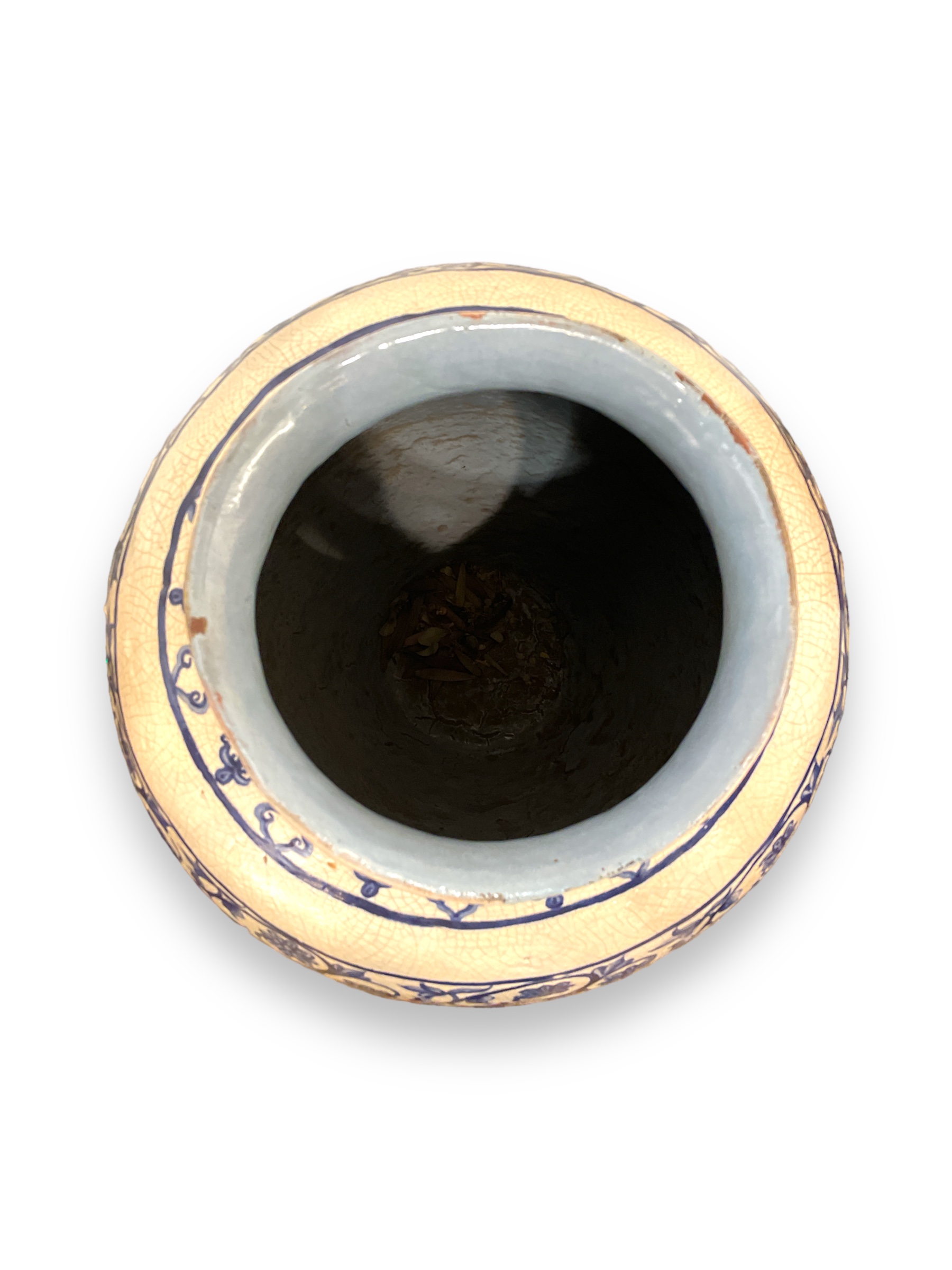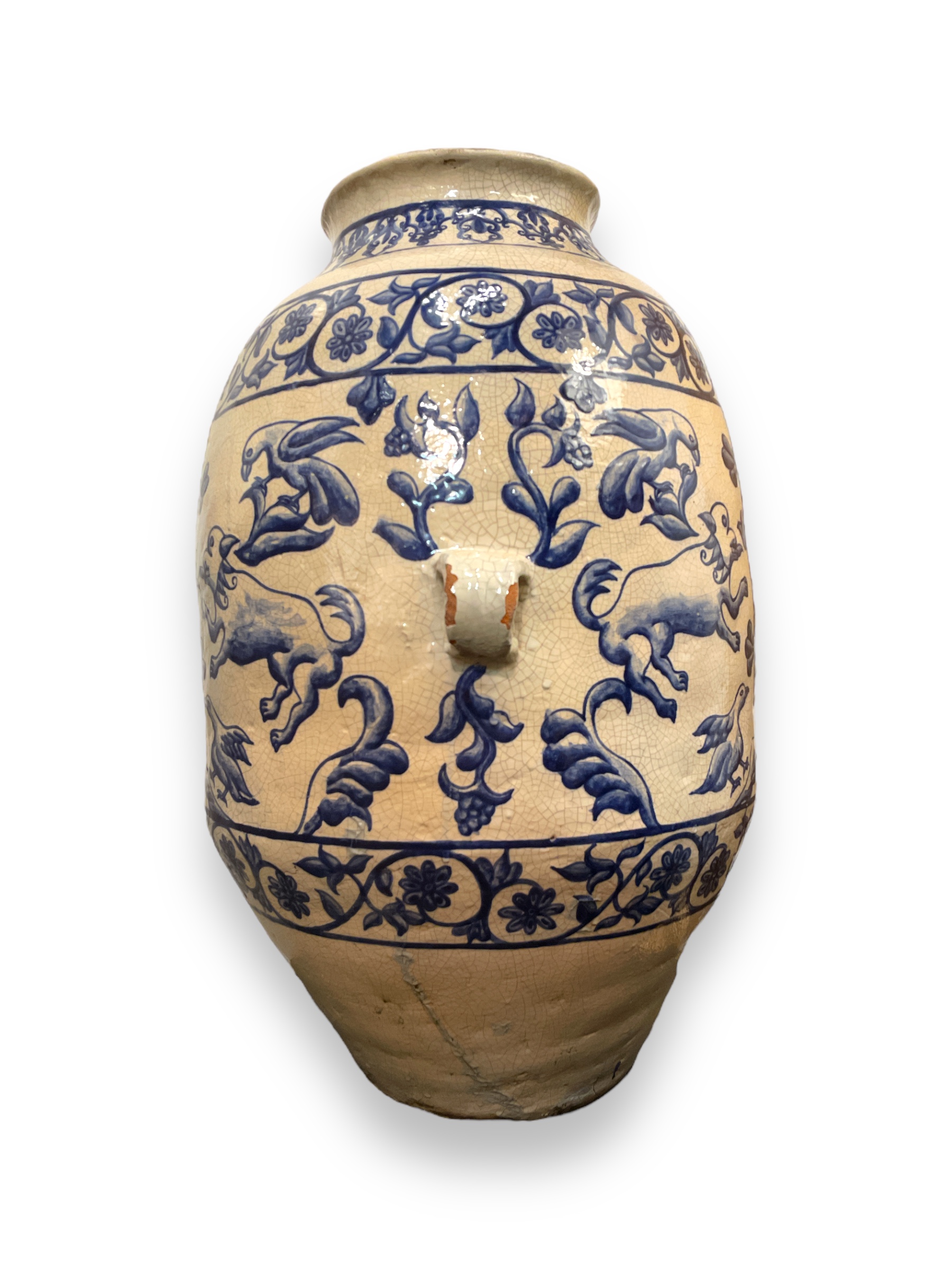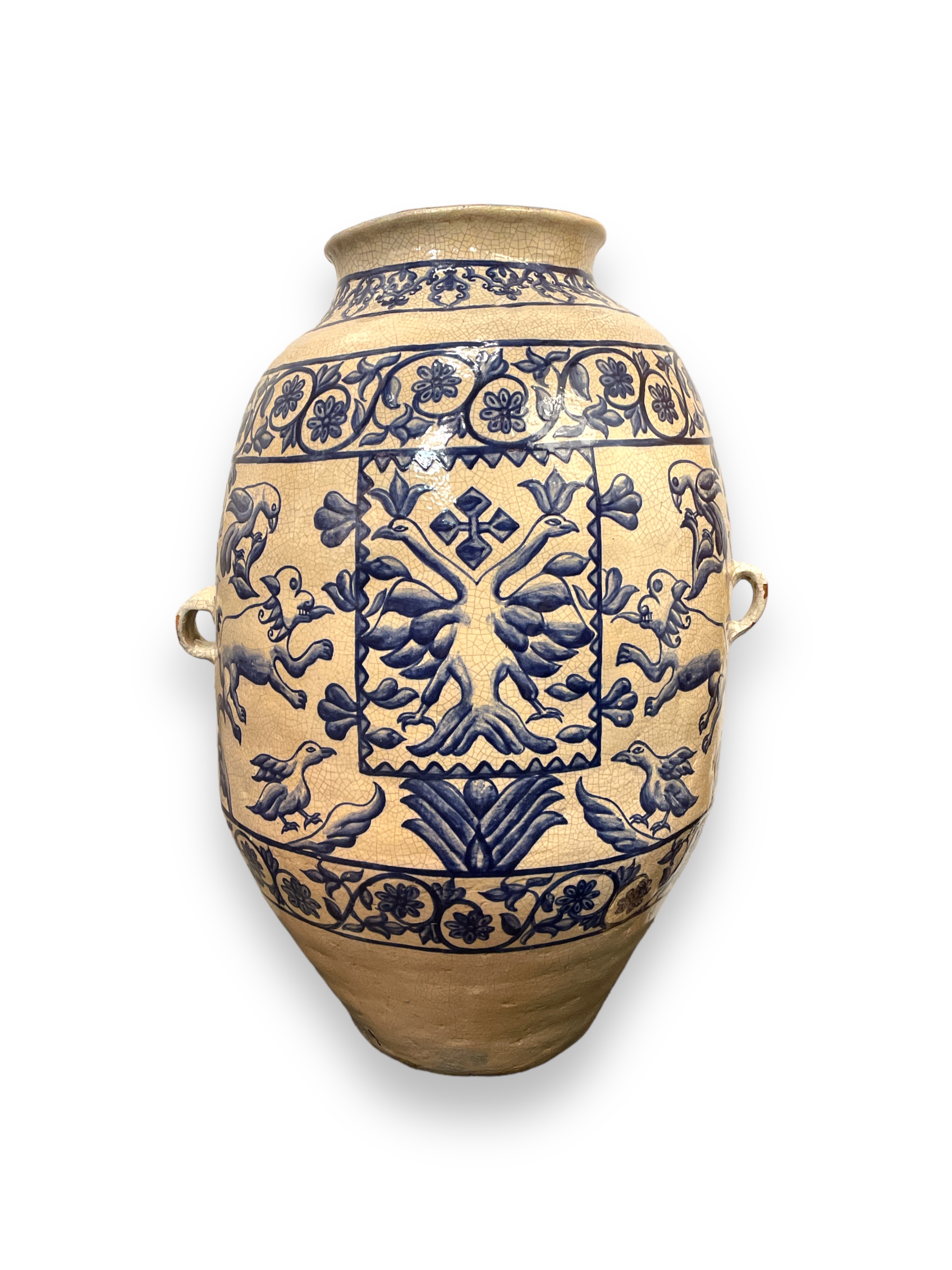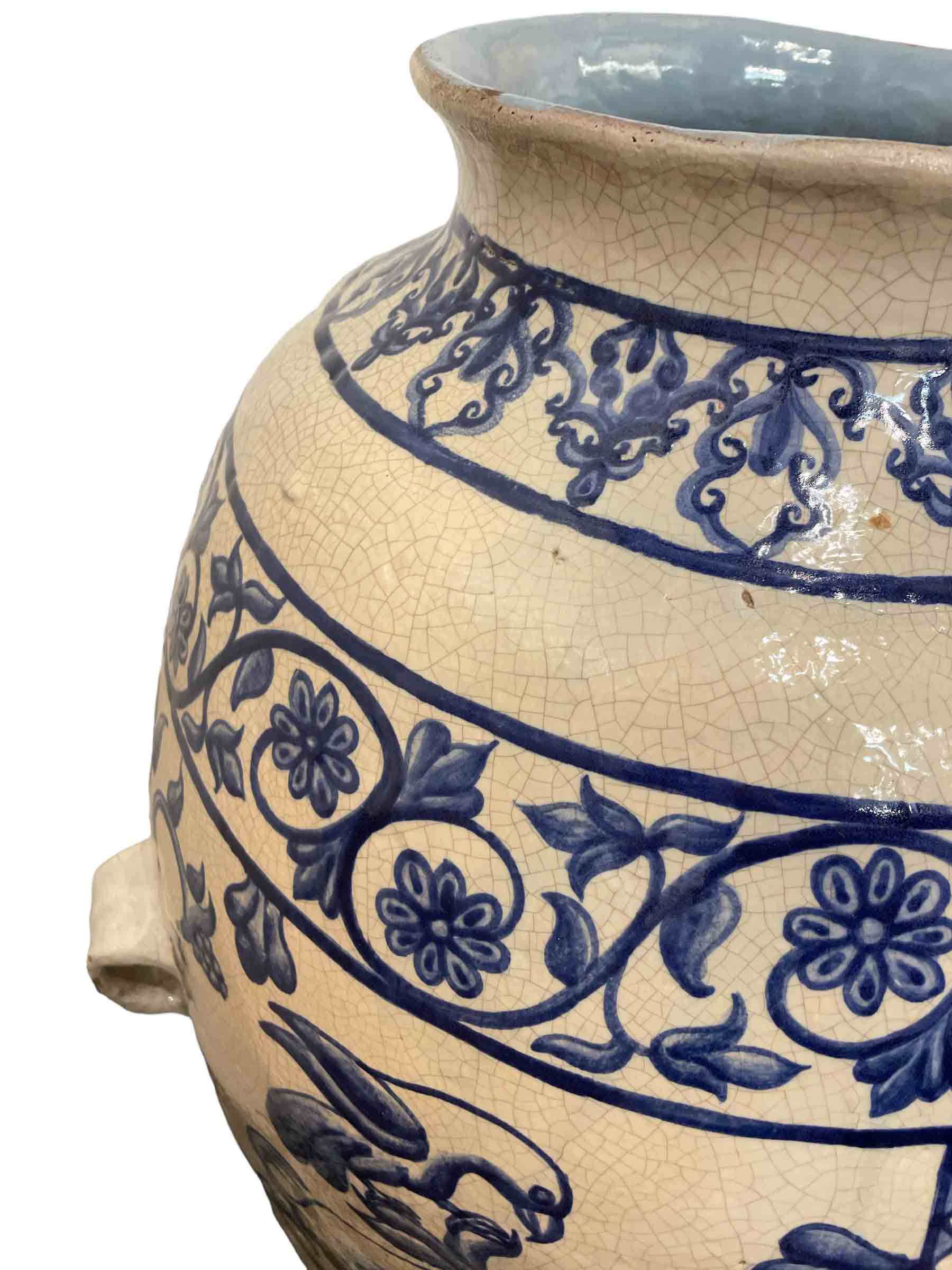 19th C blue and white chomba jar from the Peruivan Andes with painted design of griffins and eagles