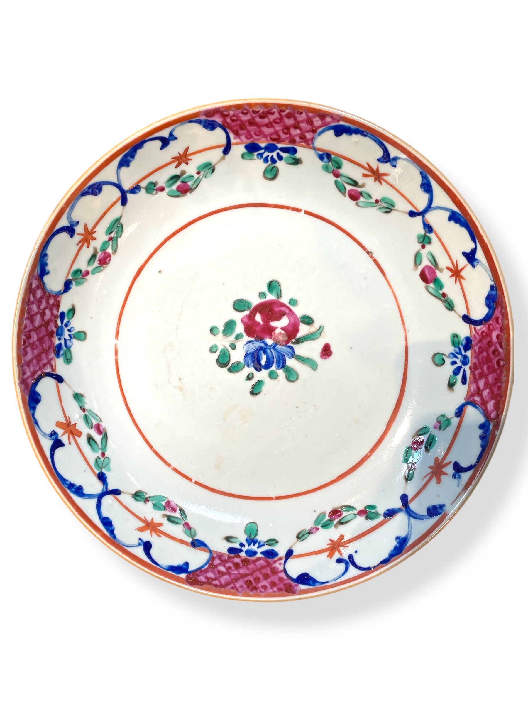 19th C Chinese porcelain plate (1825-1850). The central character is "shou," which symbolizes longevity and good fortune.