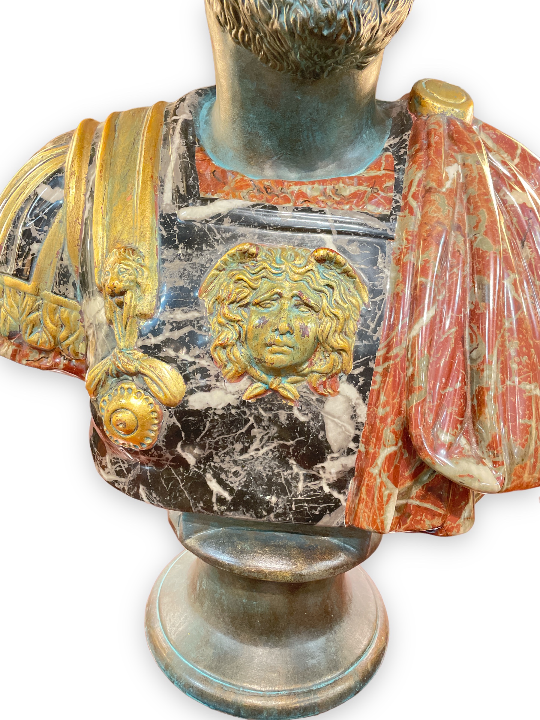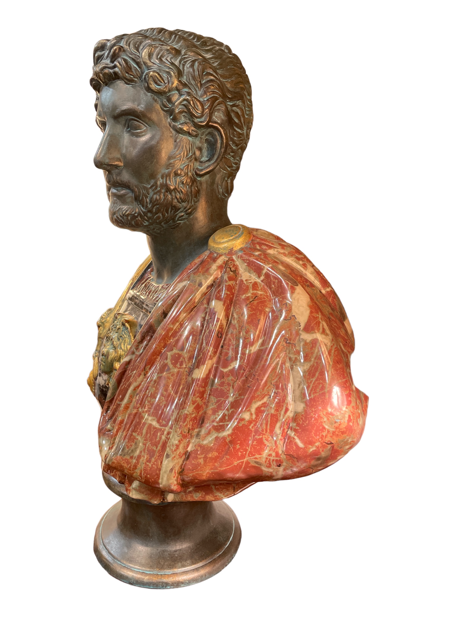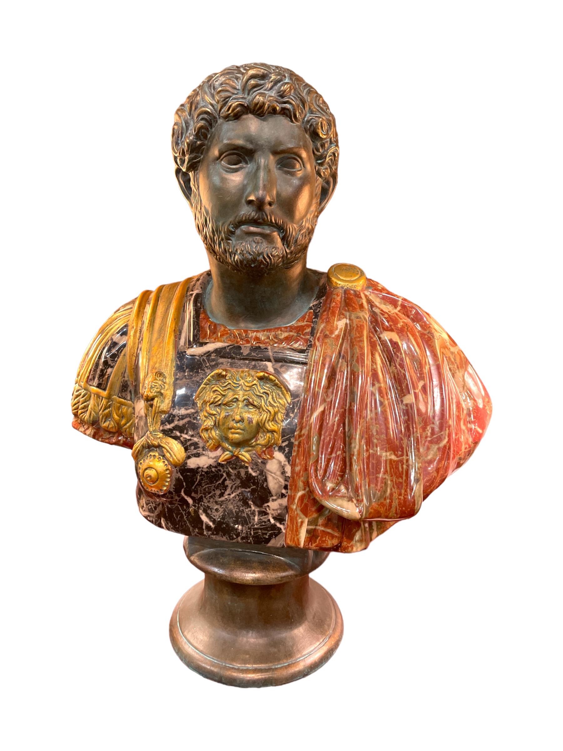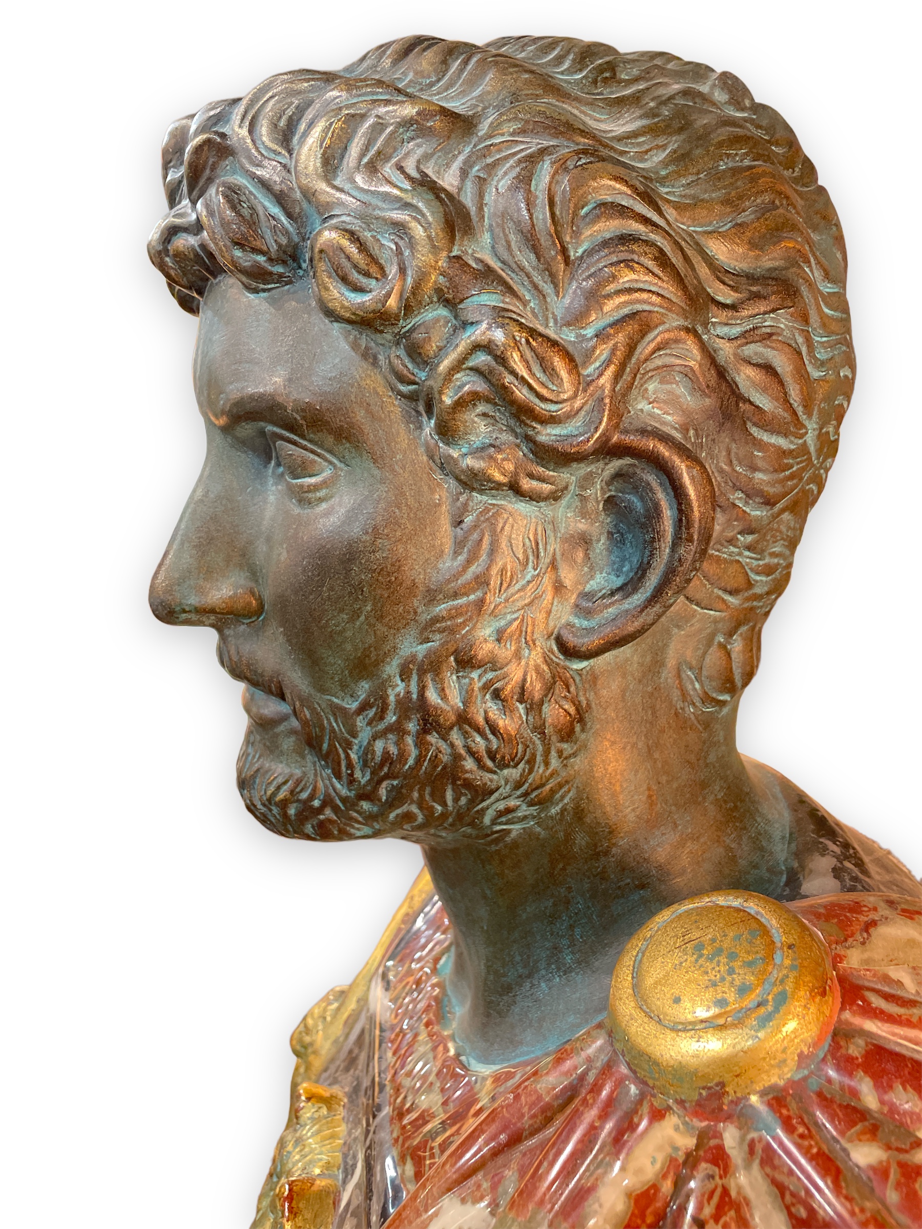 Italian painted terra cotta bust of Roman Emperor Hadrian w/ ornate armor. It is a reproduction of a marble bust excavated at the archaeological site of Los Torreones, in Murcia, Spain.