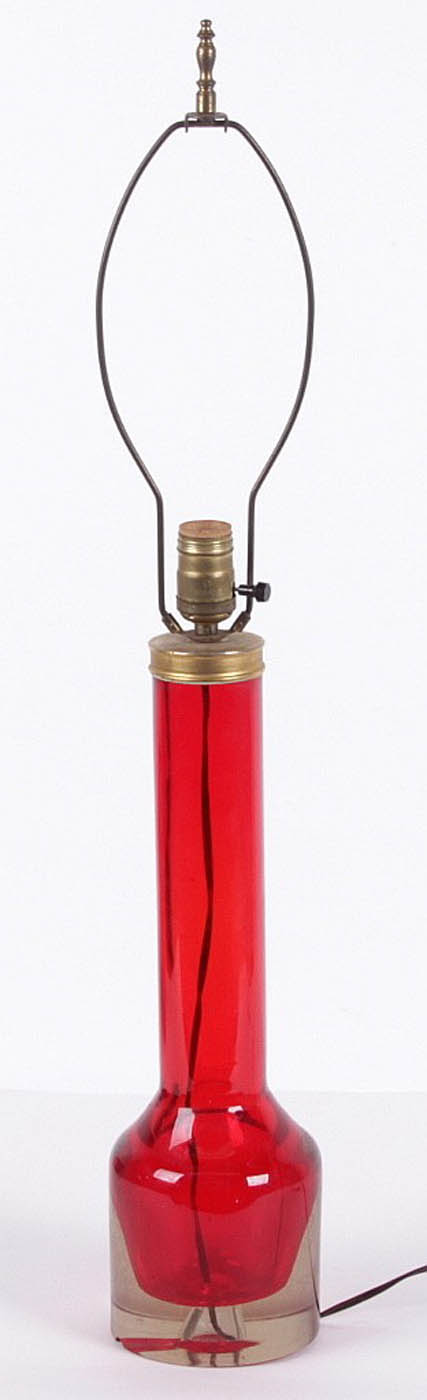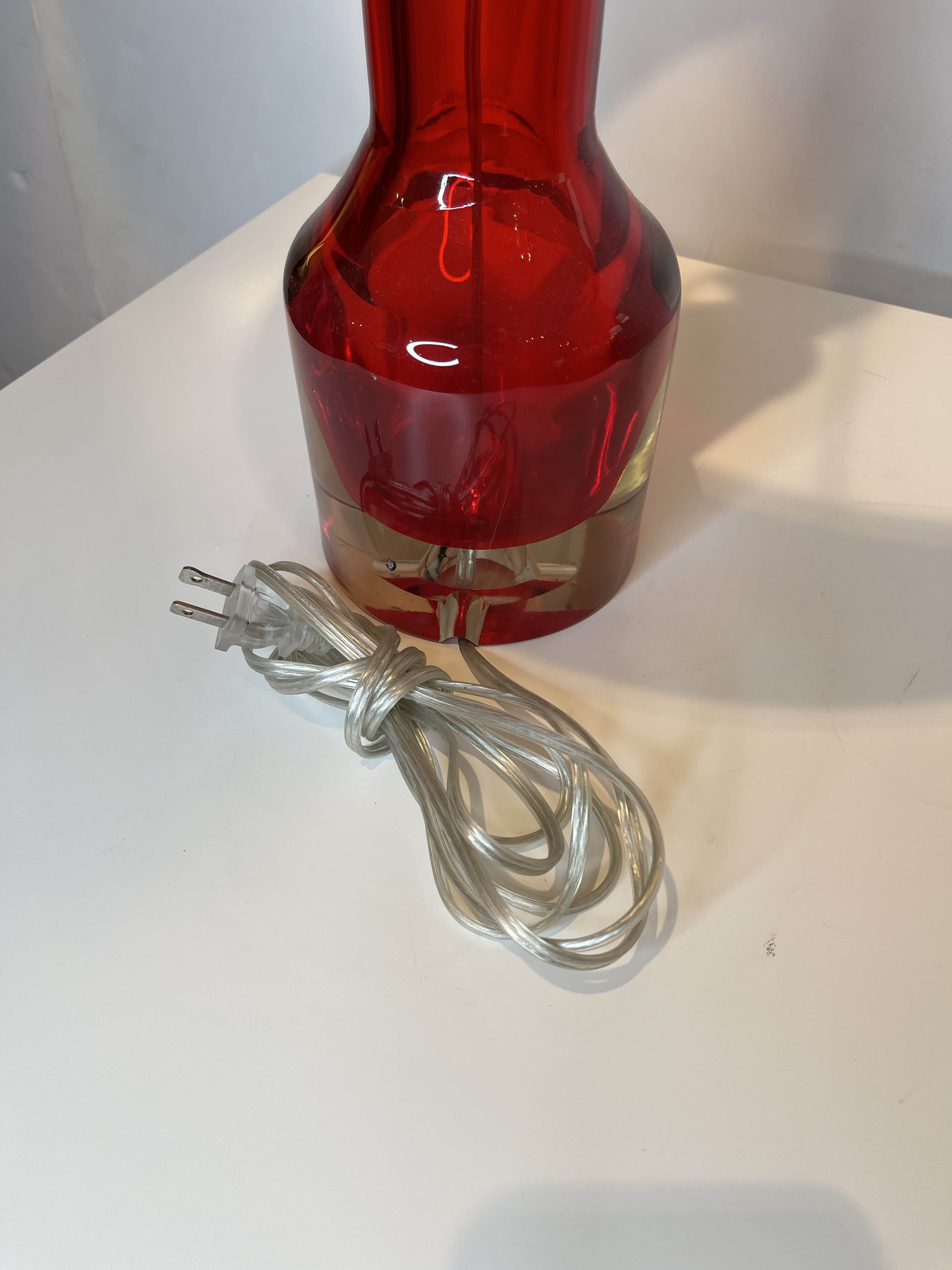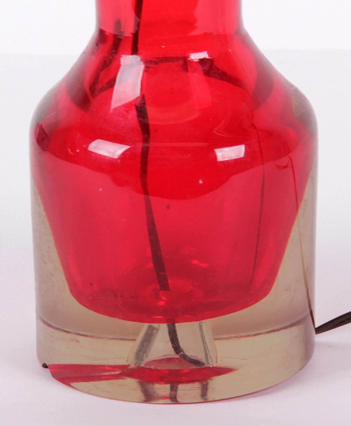 Mid century modern art glass lamp, heavy red and colorless glass, unsigned, made for use as a lamp.