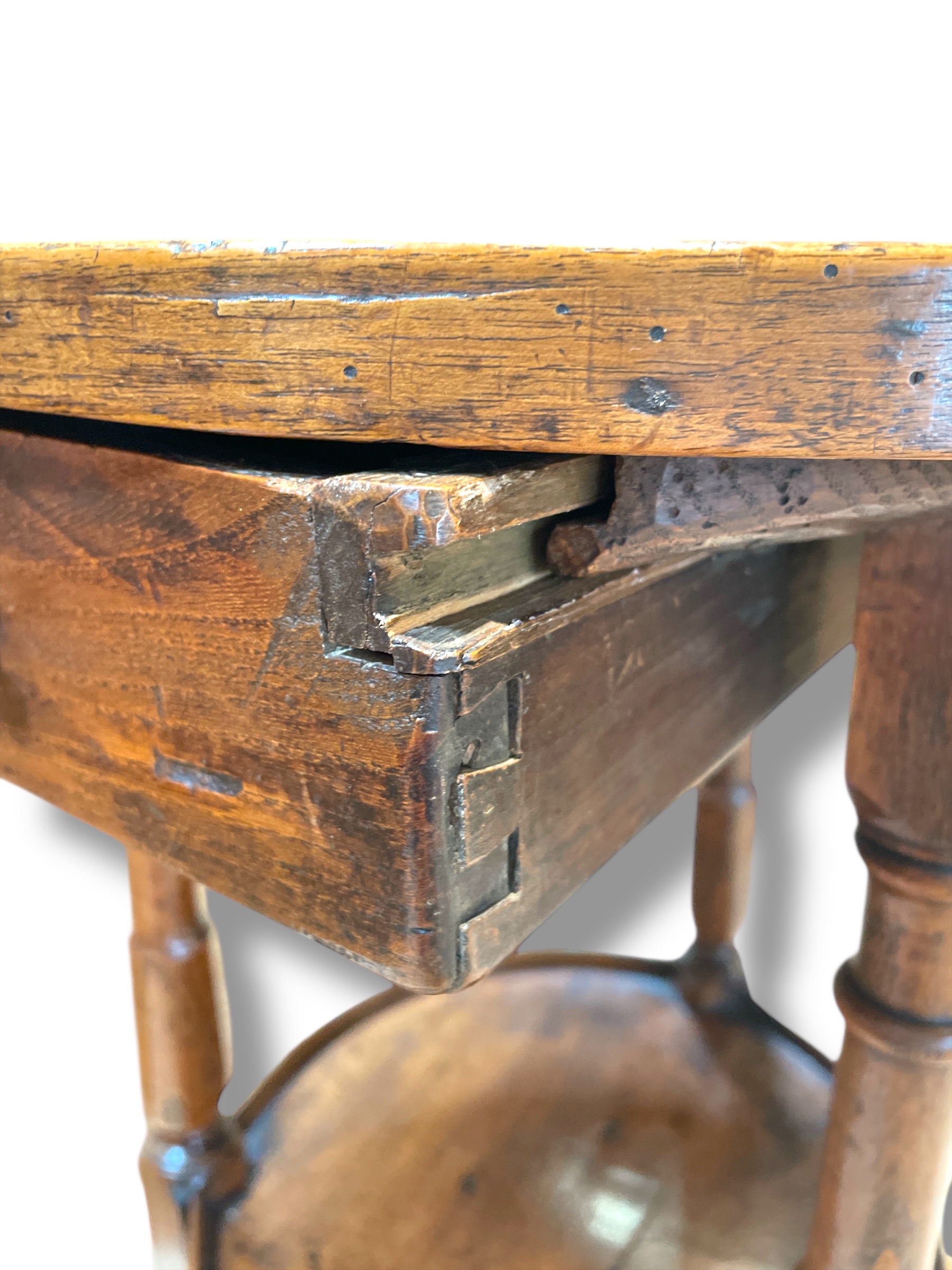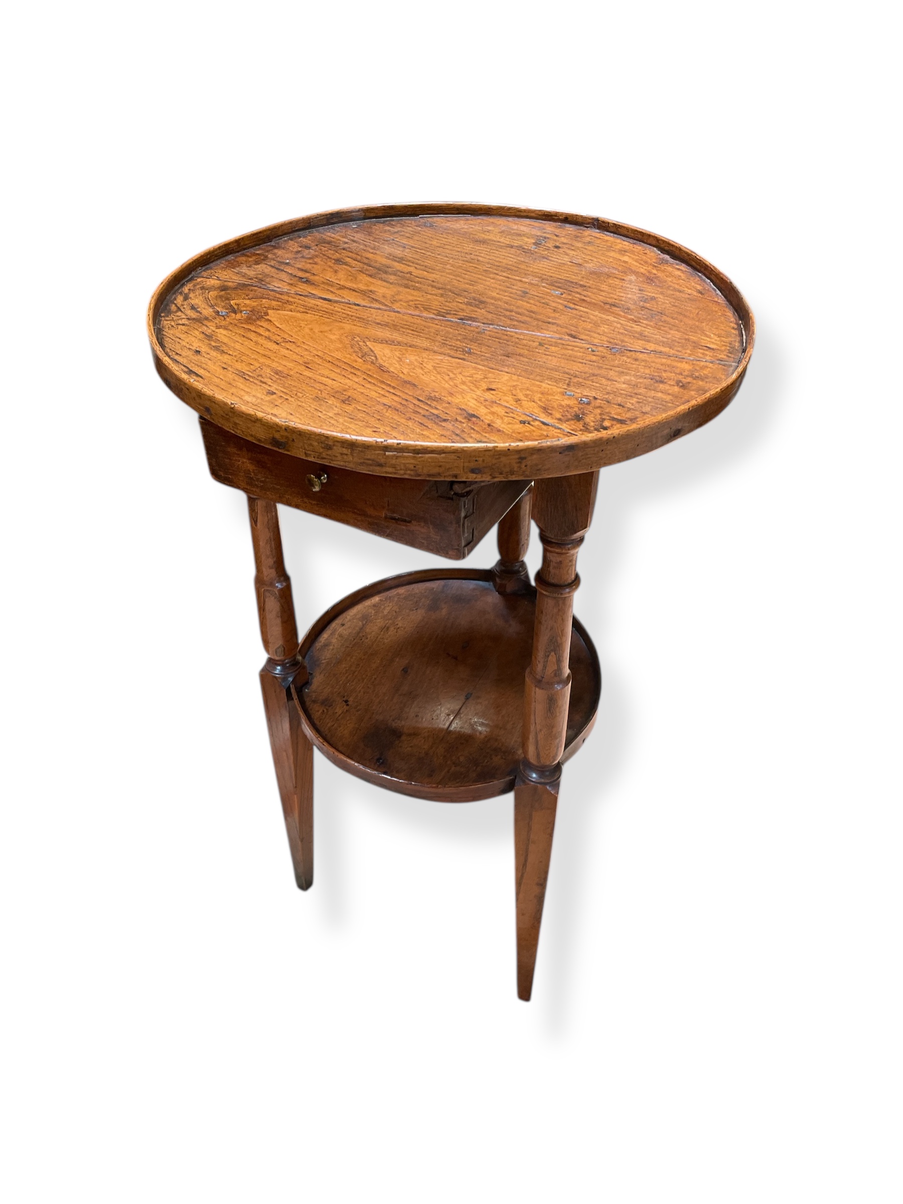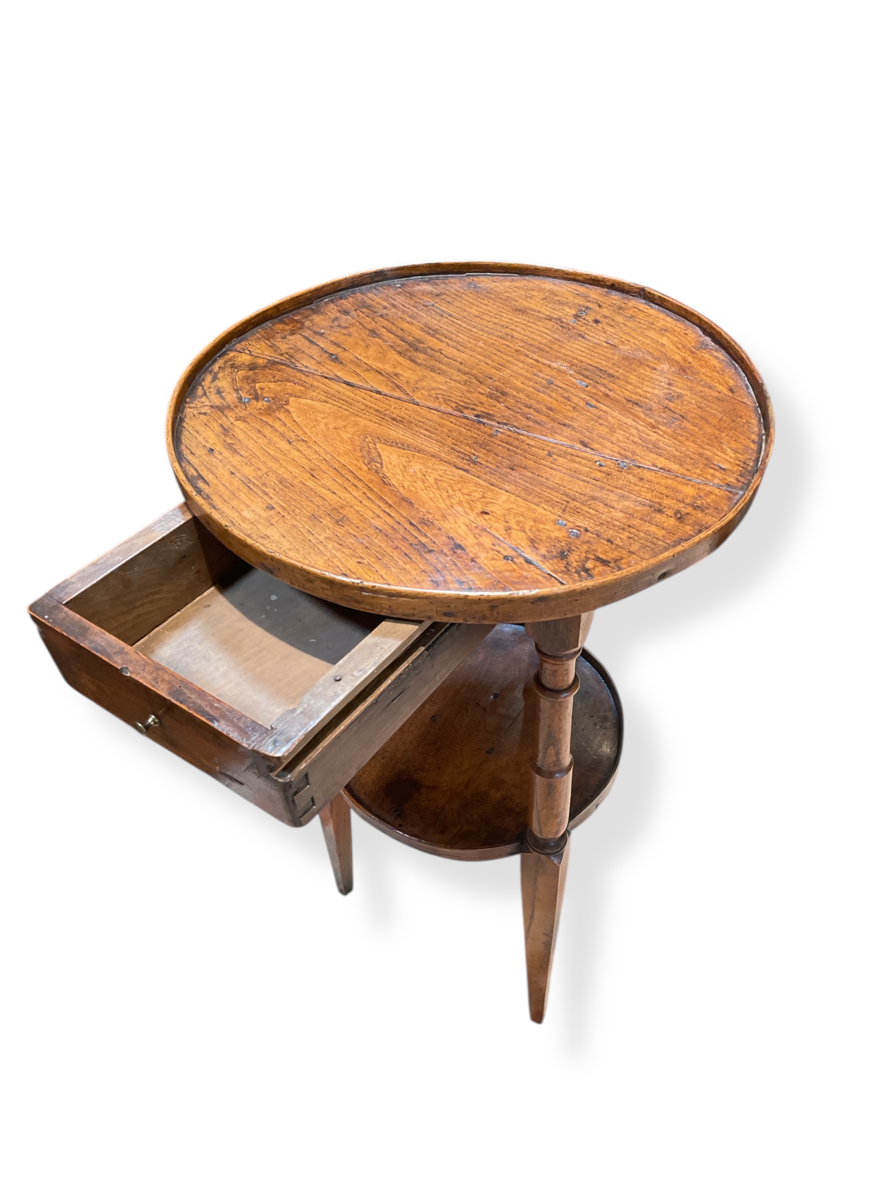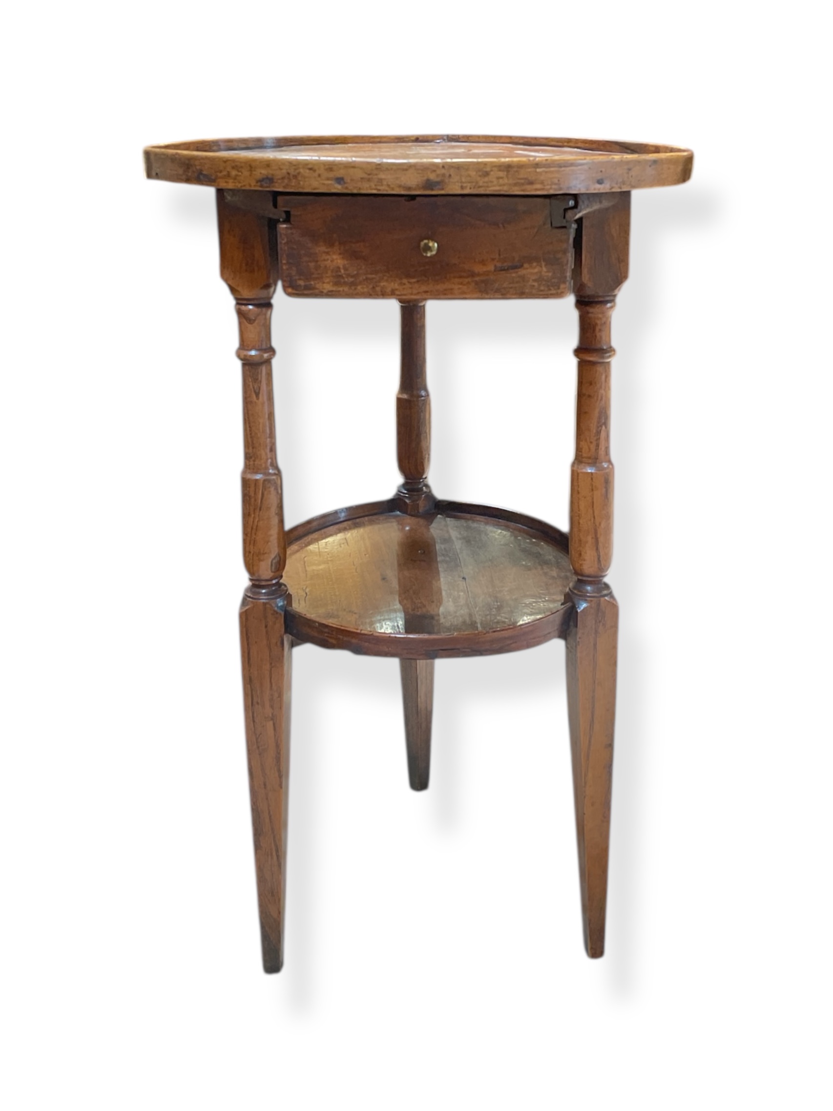 Early 19th C small French walnut round table with single drawer.