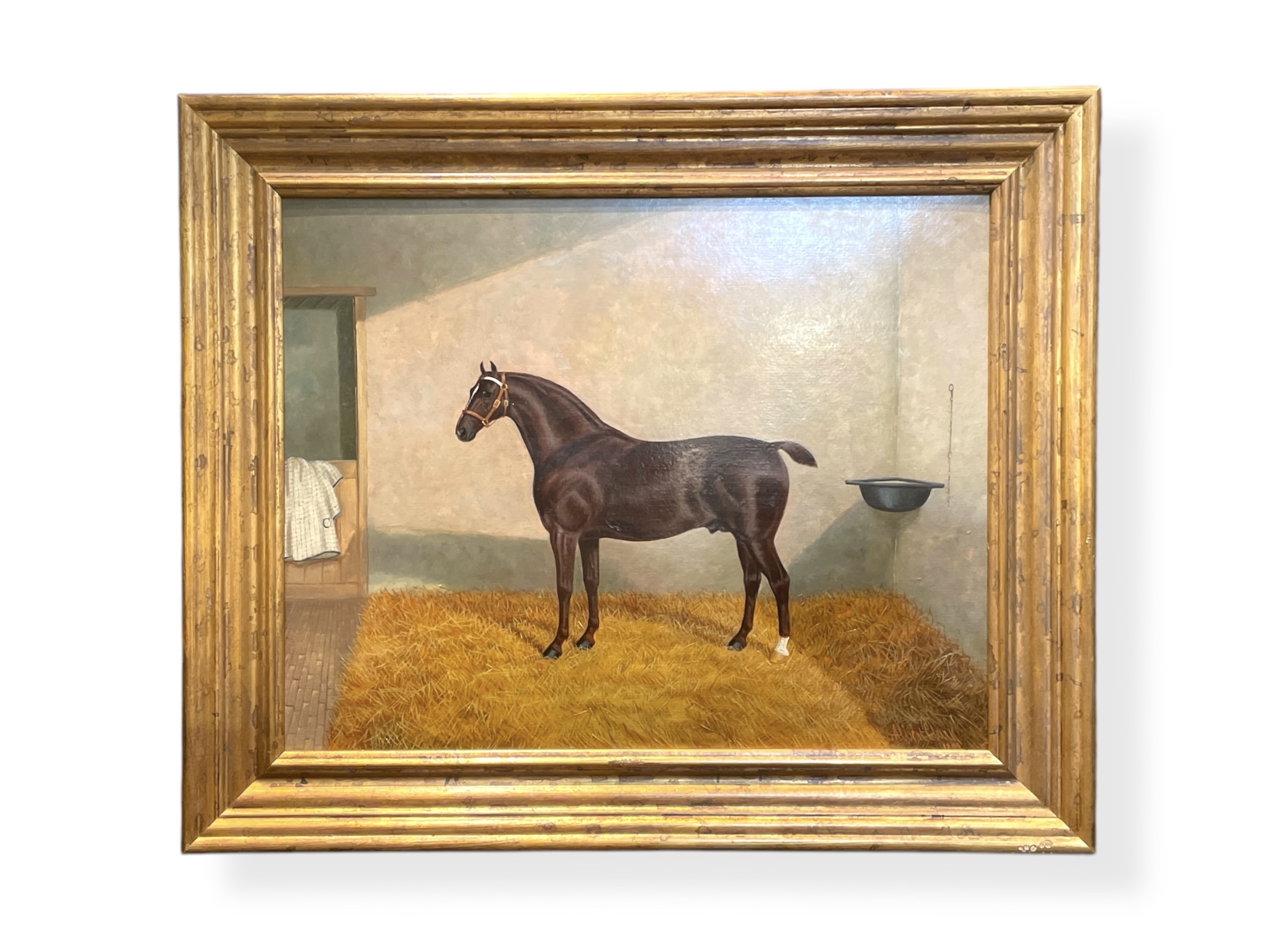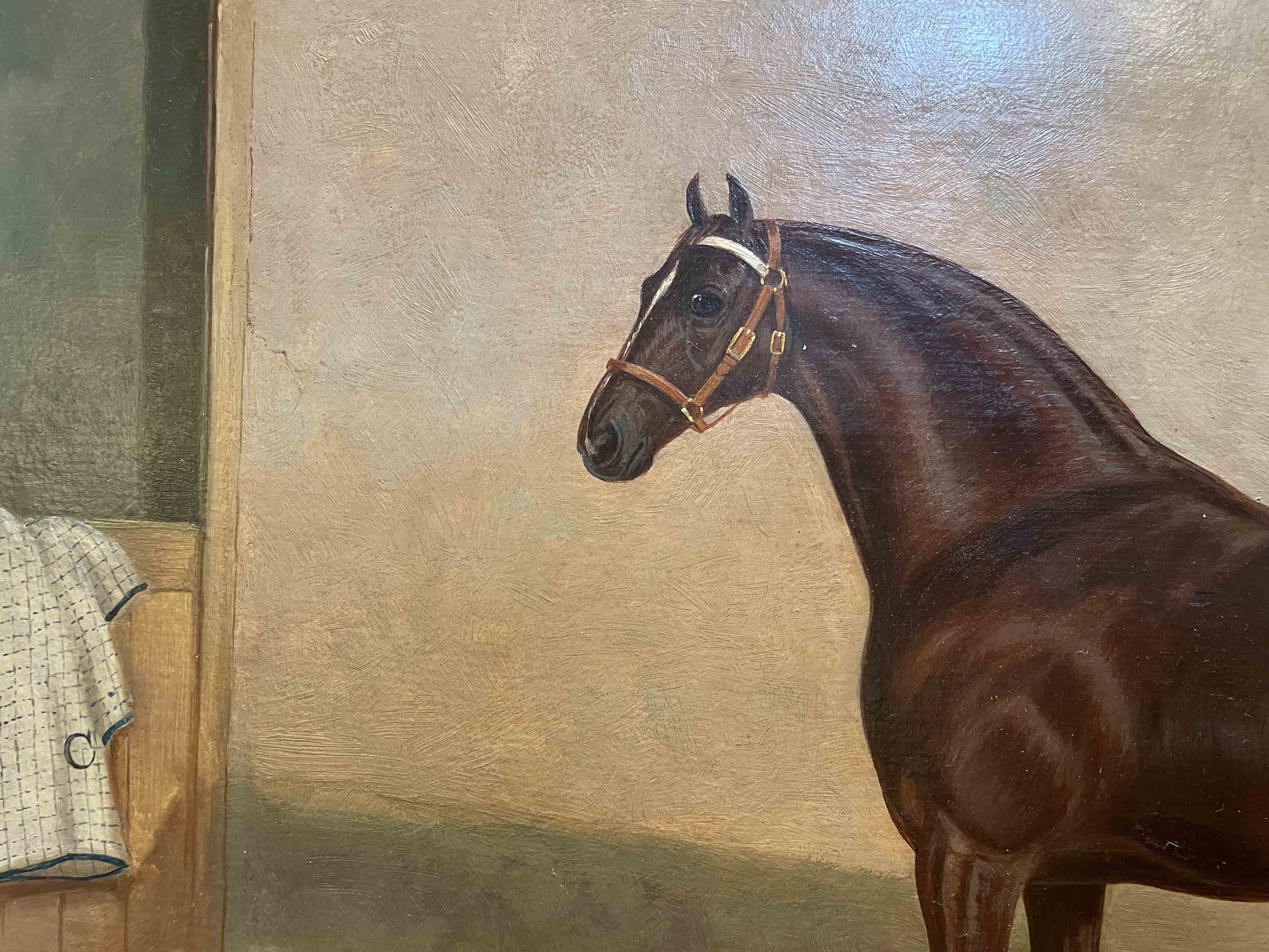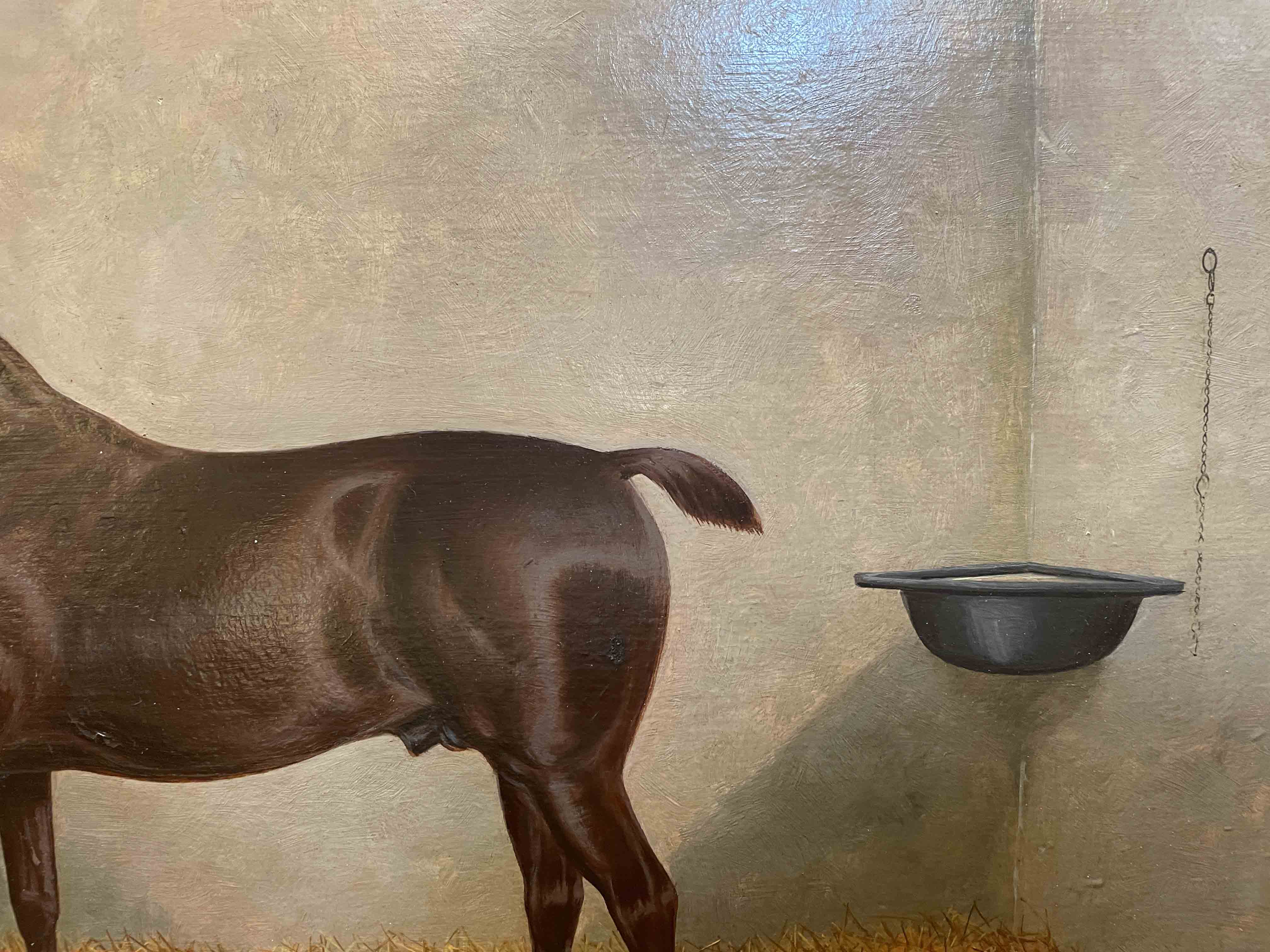British oil on board painting of a dark bay horse in stable by Albert Clark, dated 1899. Signed and dated lower right of front.