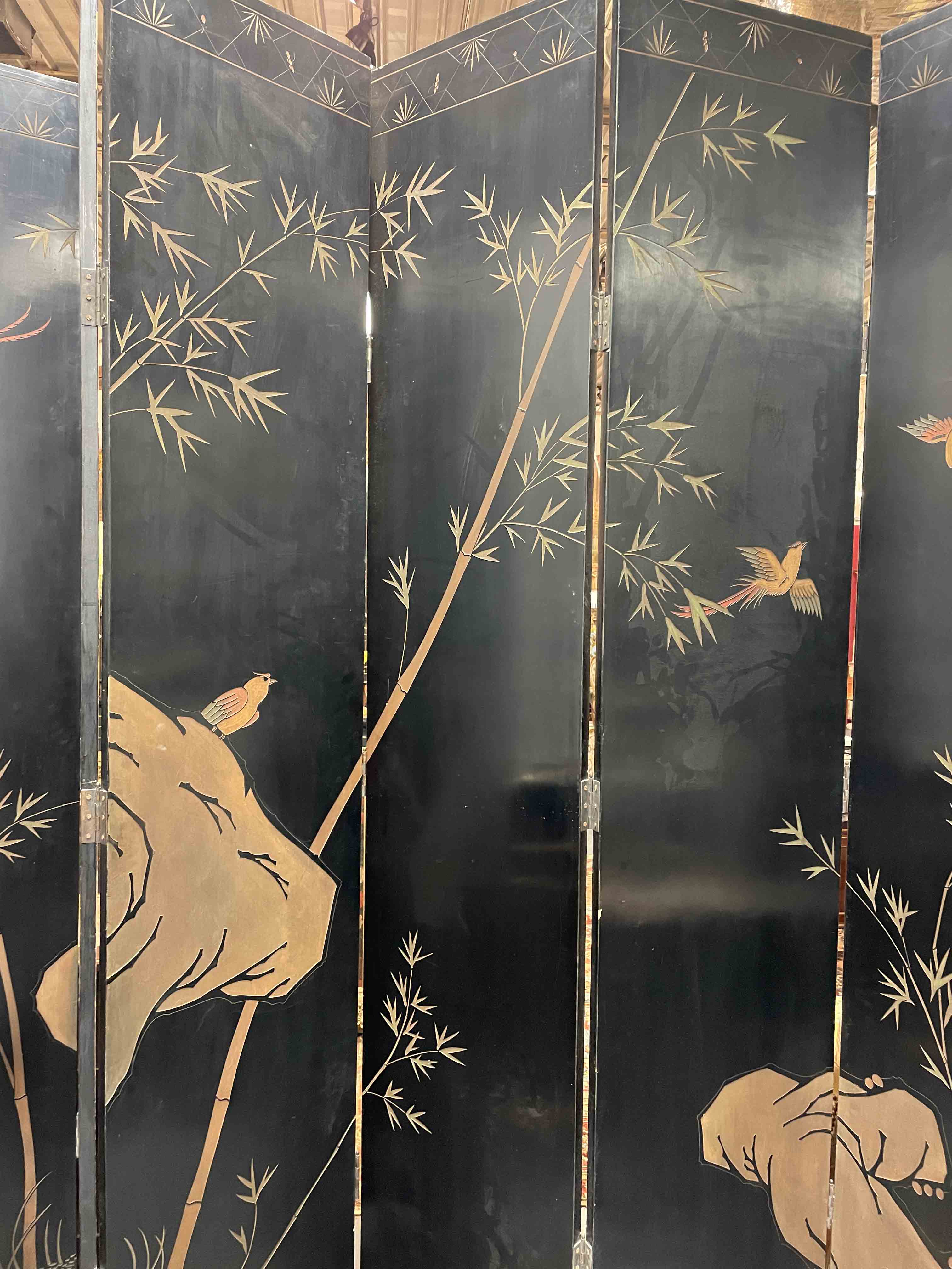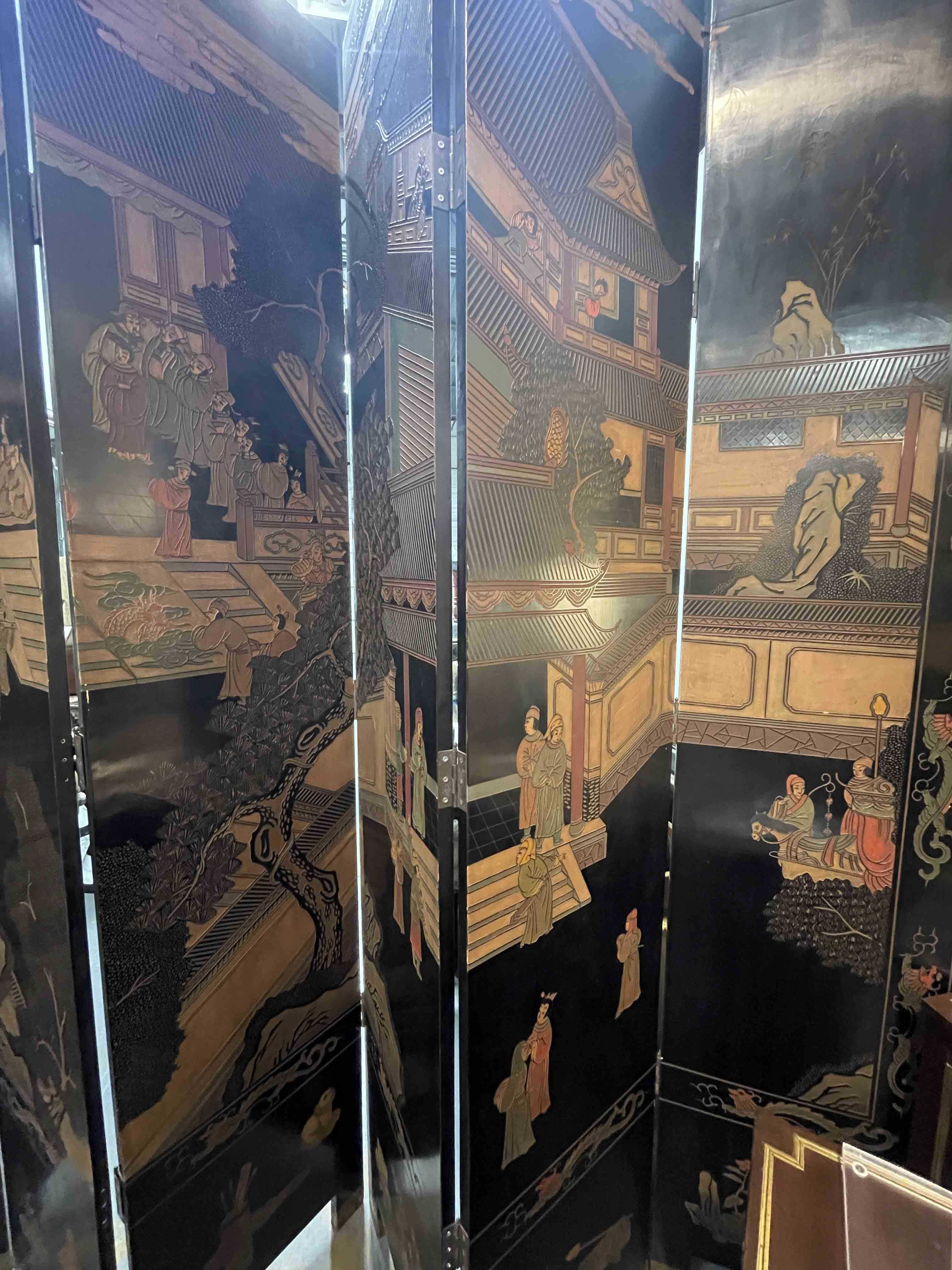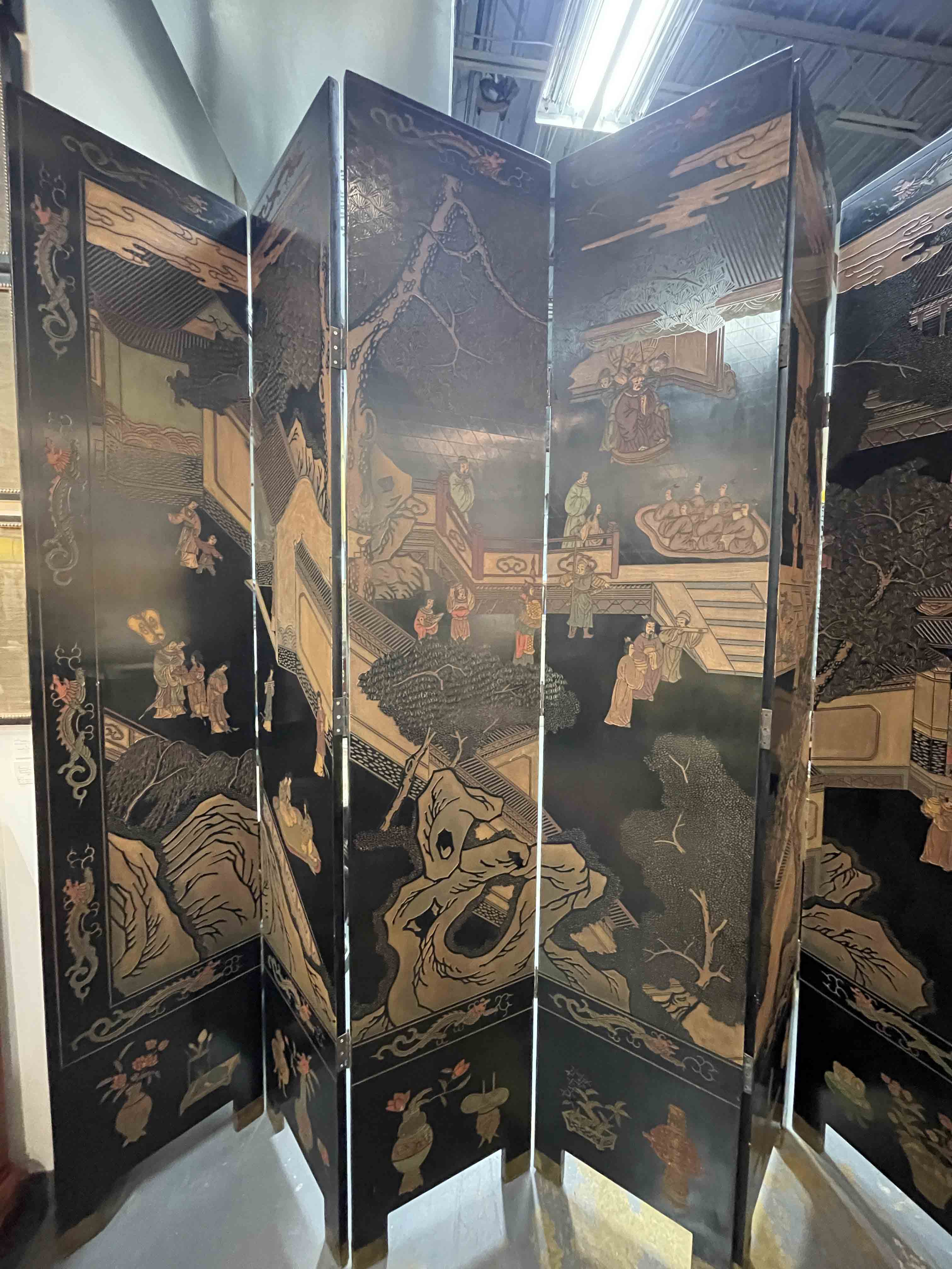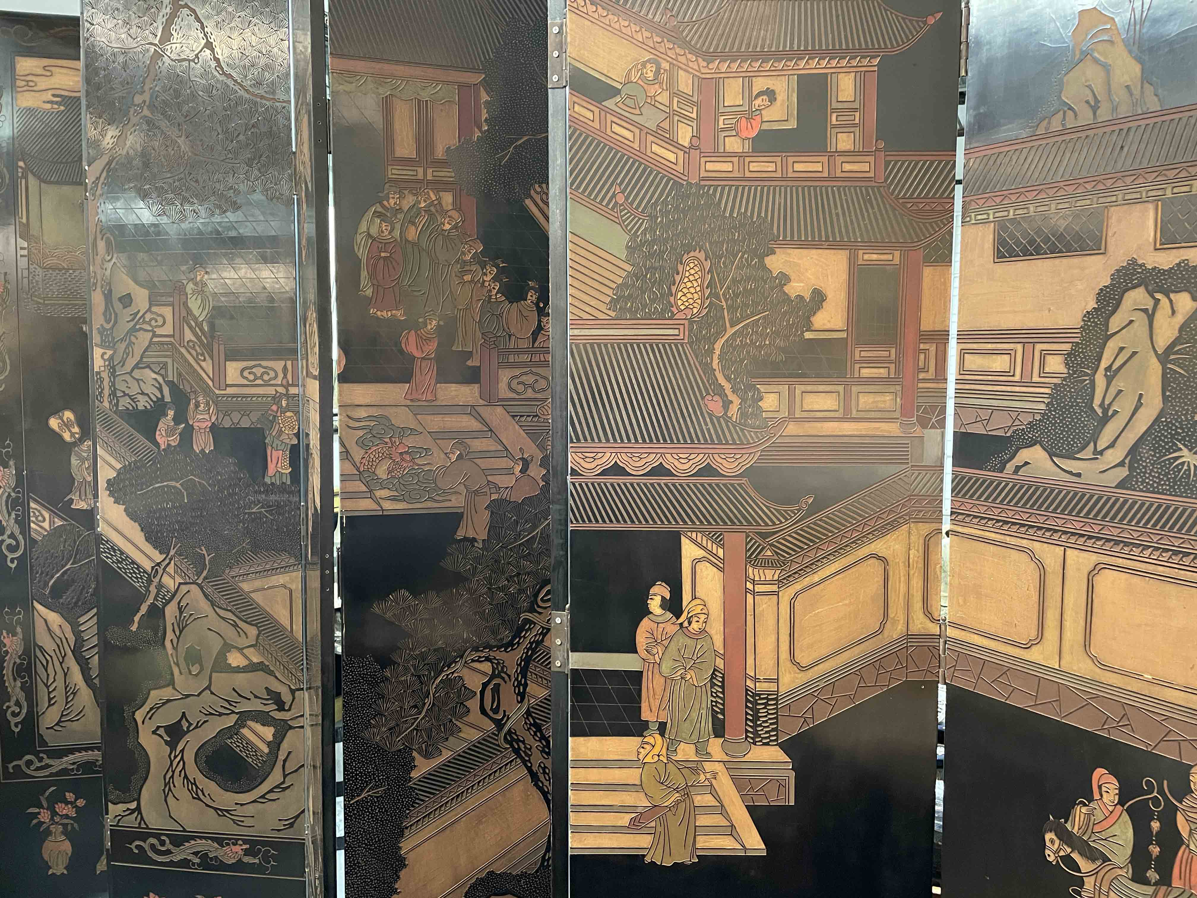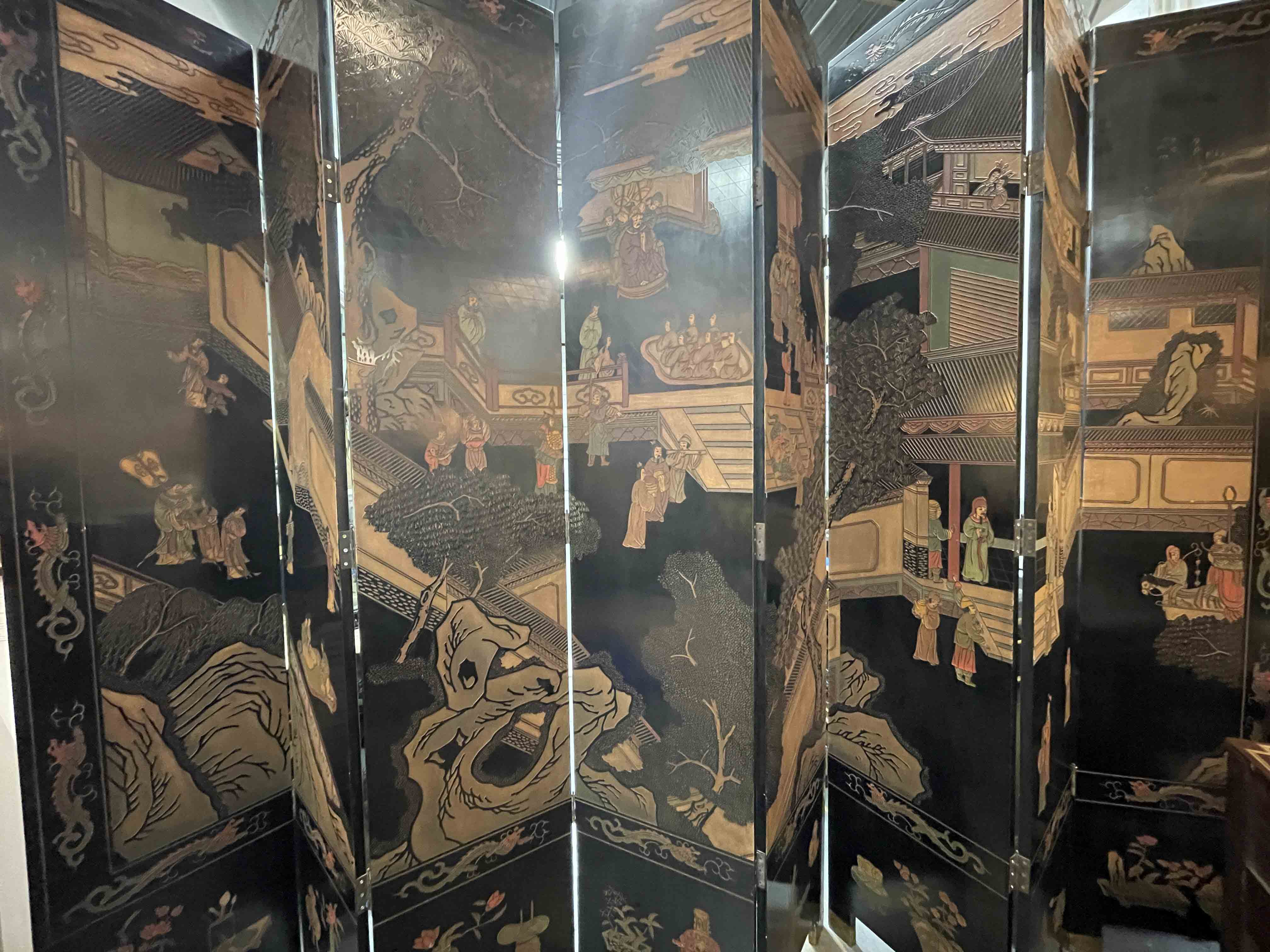 Early 20th C Chinese eight panel polychrome and black lacquered screen.