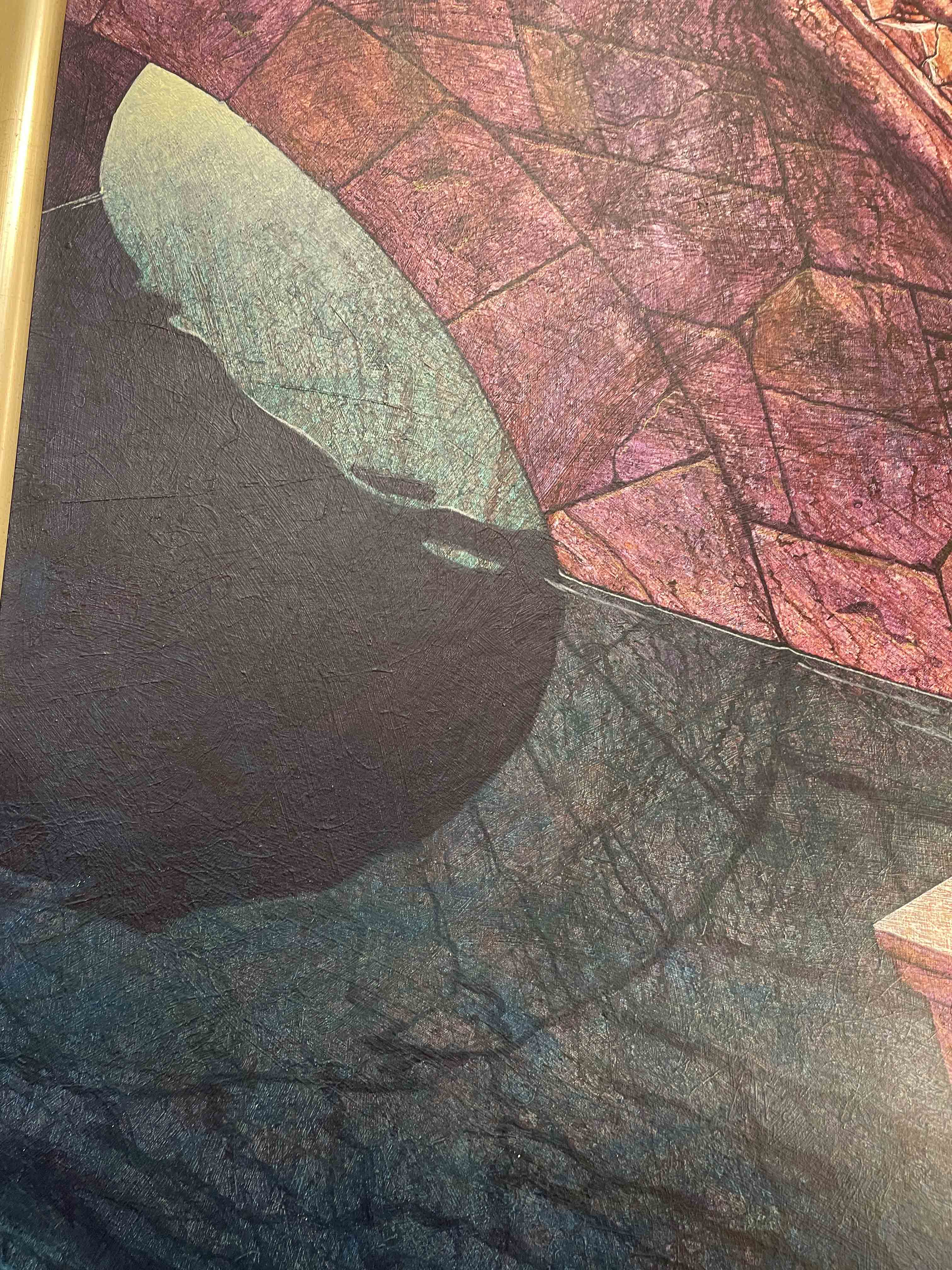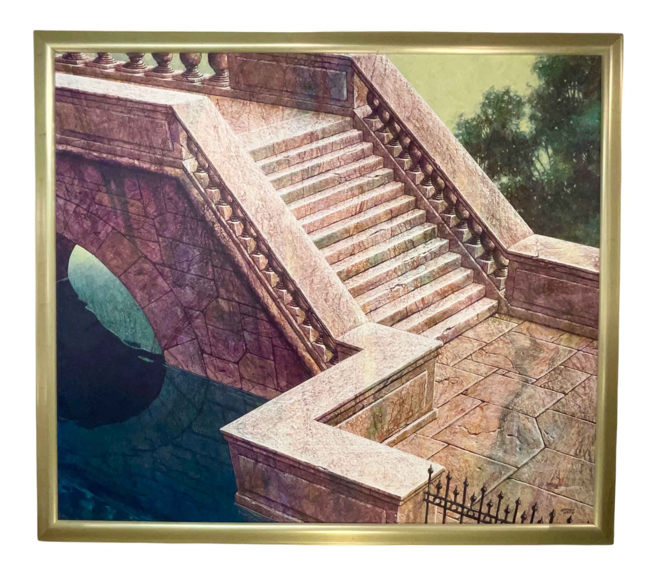 Oil on canvas painting by George Kozman of an architectural staircase in a custom frame; commissioned by Gardere for its offices. Original paid price by Gardere was $9936.14.