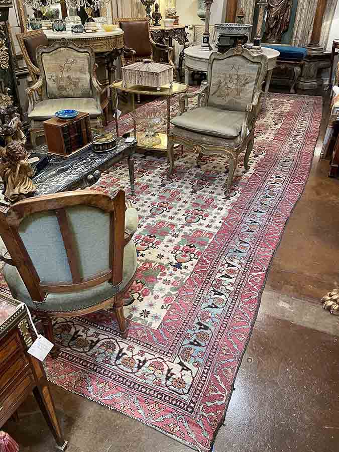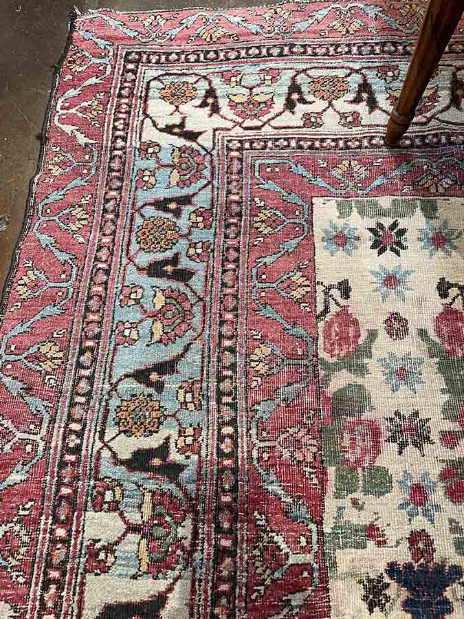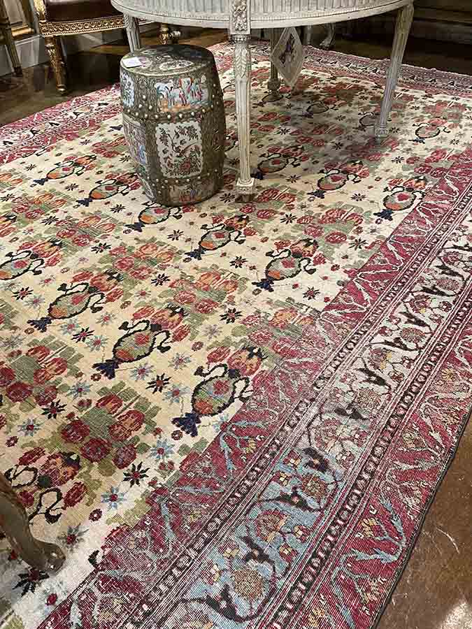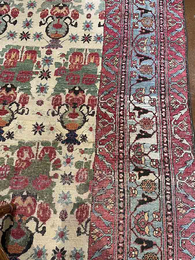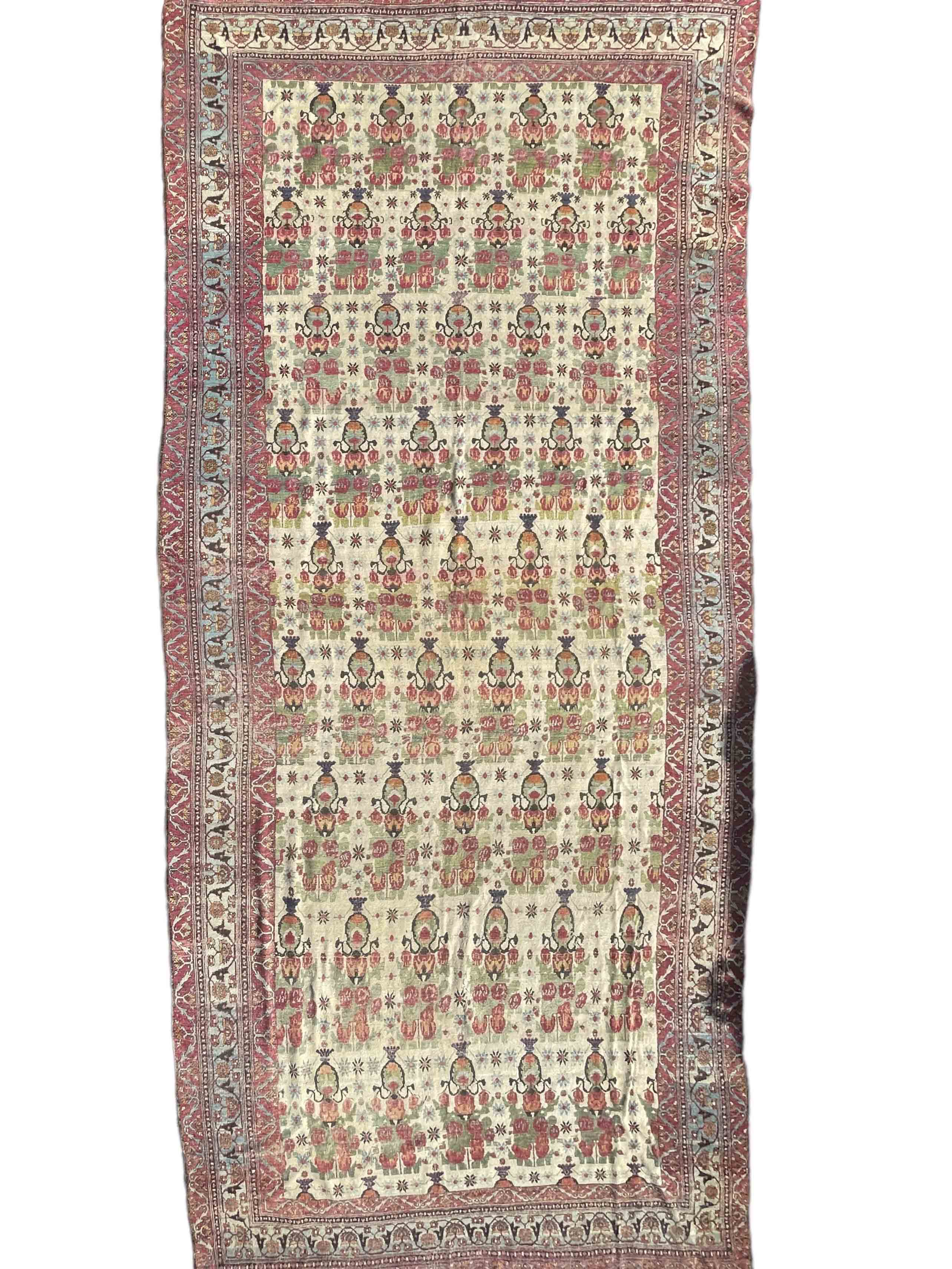 19th C Kerman Lavar Persian rug designed with vases and flowers.