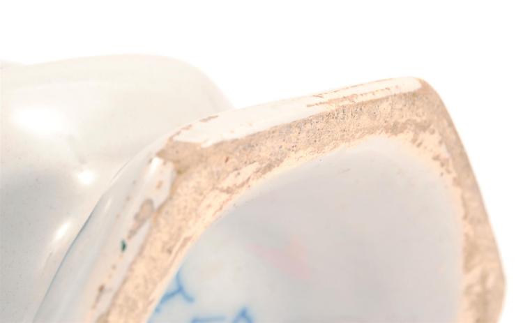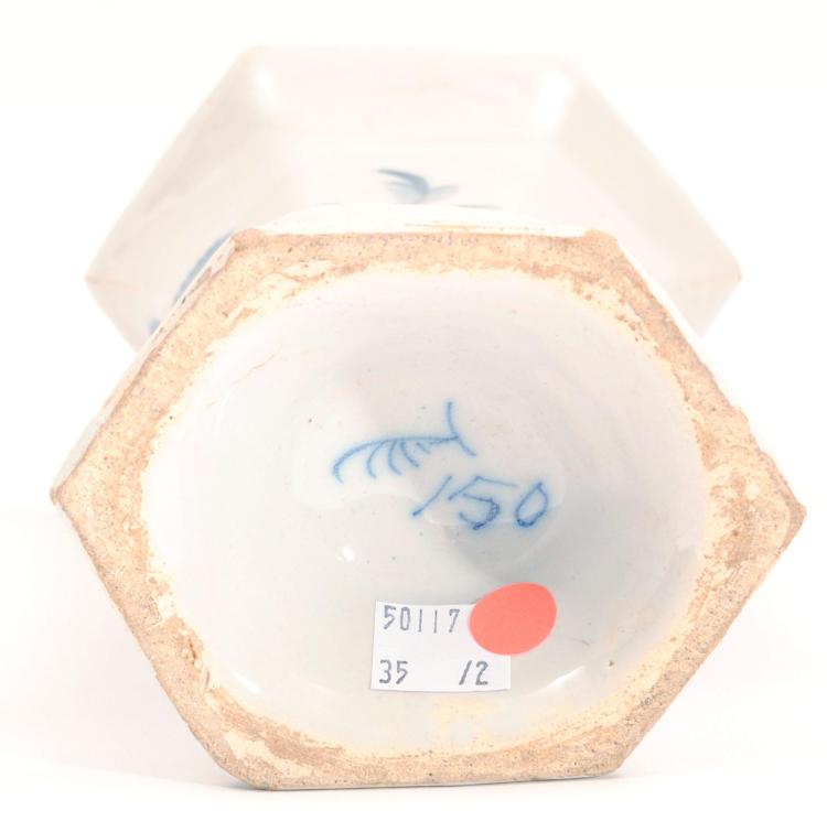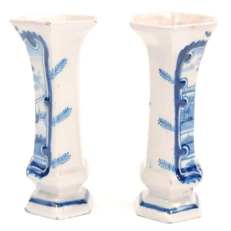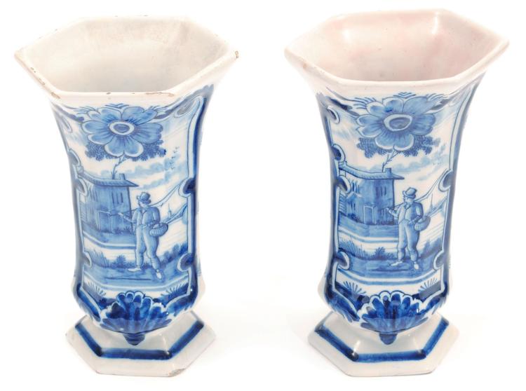 Pair of late 18th C/early 19th C Dutch Delft blue and white sleeve vases with a male figure holding a fishing pole, from the Porceleyne Claeuw factory.