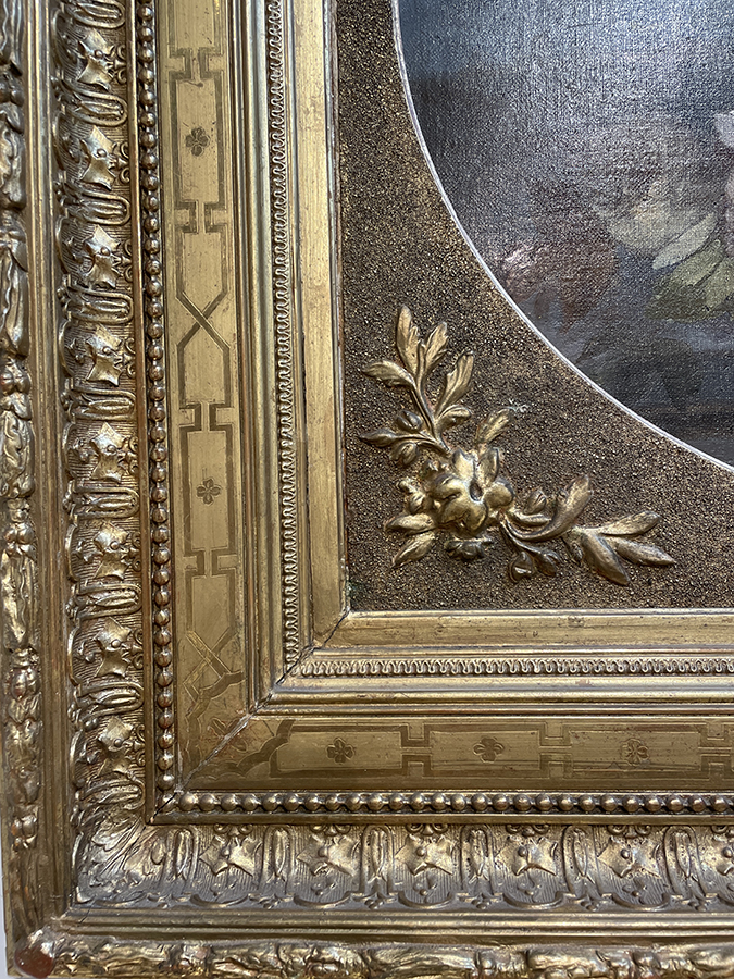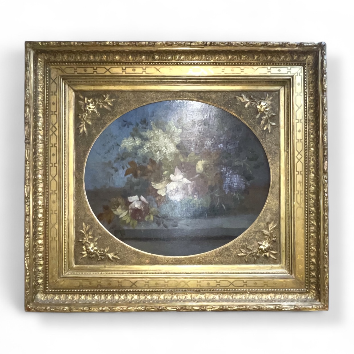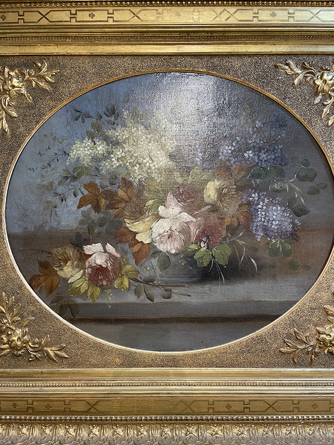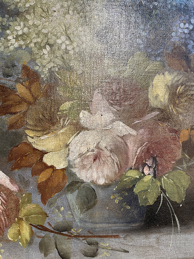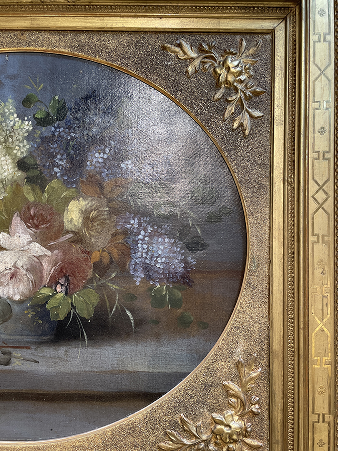Large 19th C British oil on canvas still life painting of flowers in a period gold gilt frame.