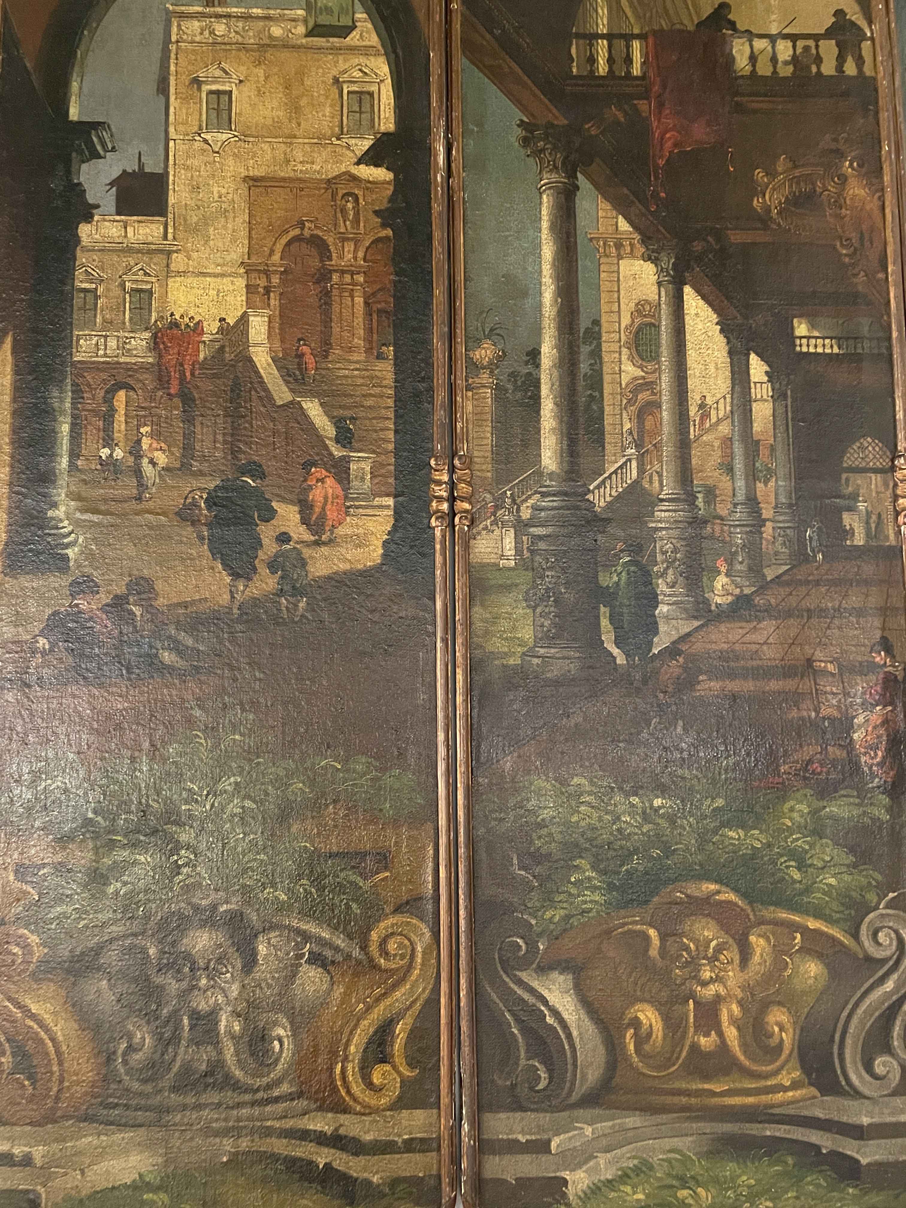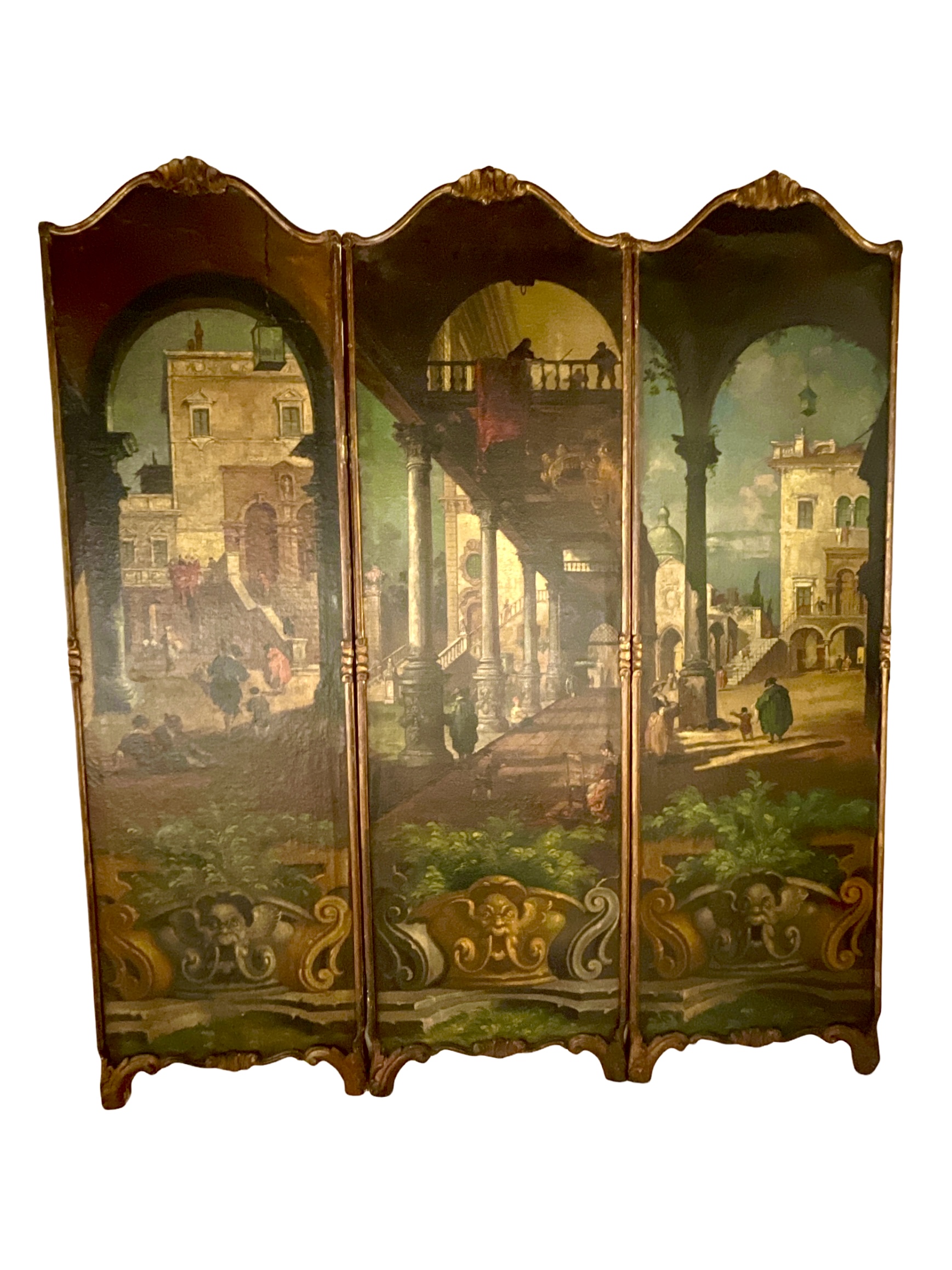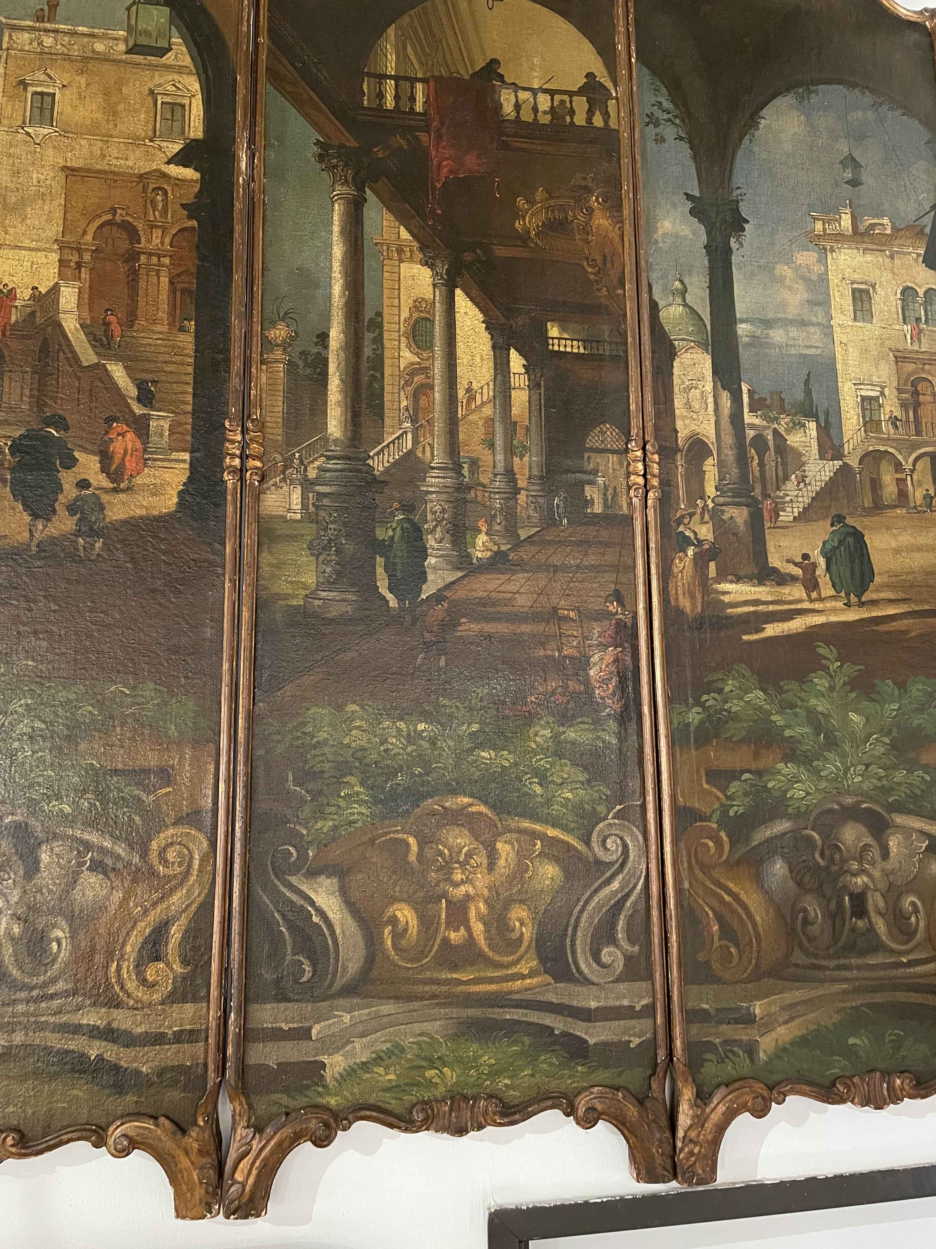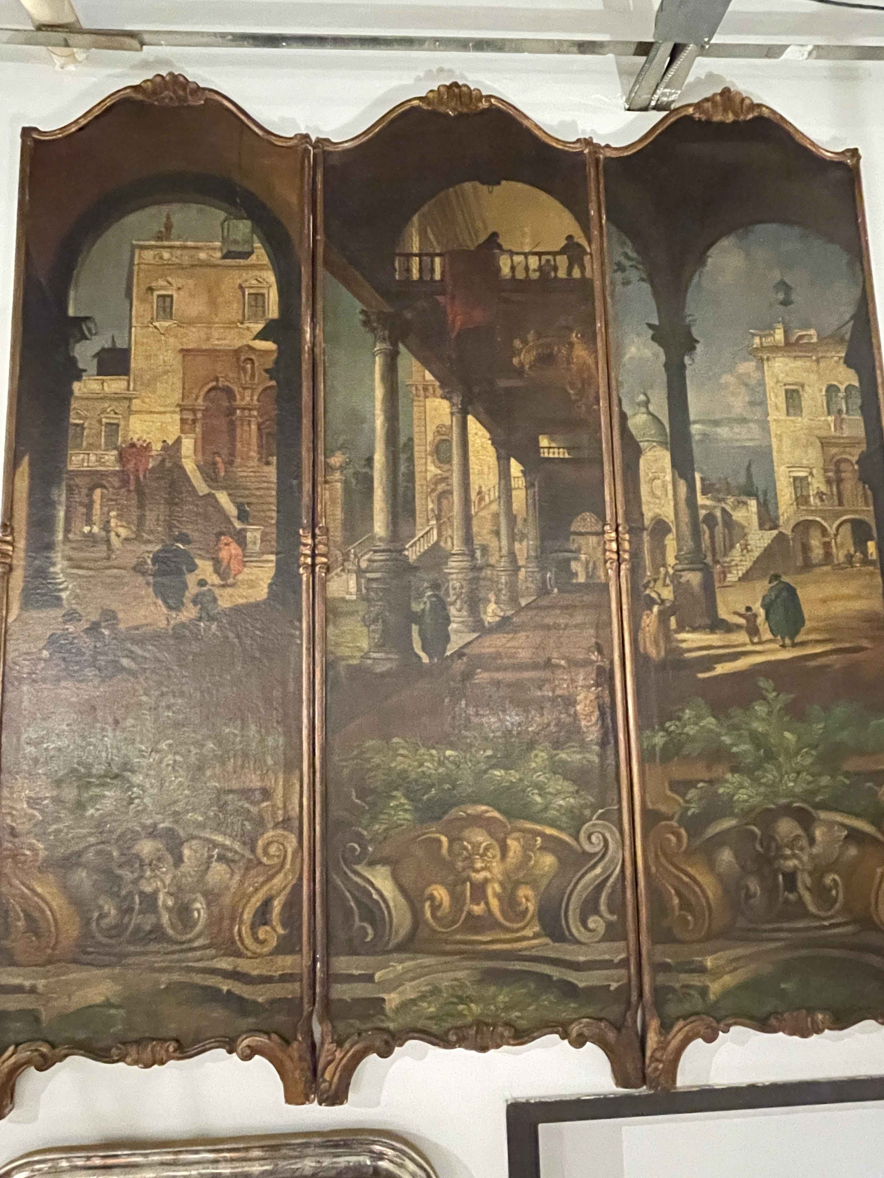 Three panel Grand Tour oil on canvas, framed screen. Italian 1840-1850.