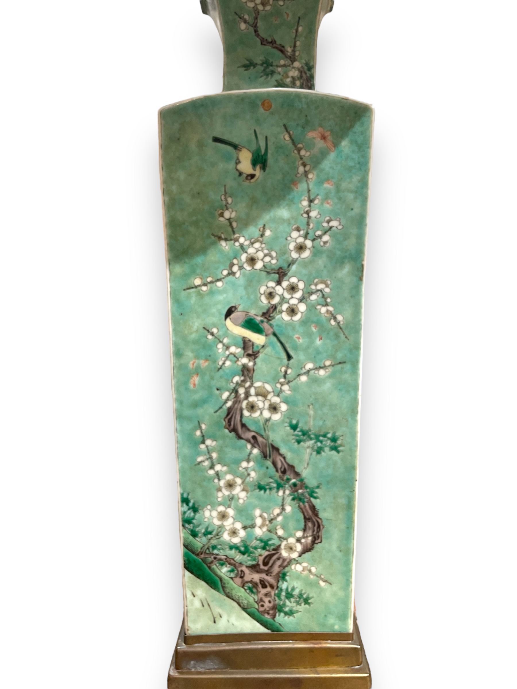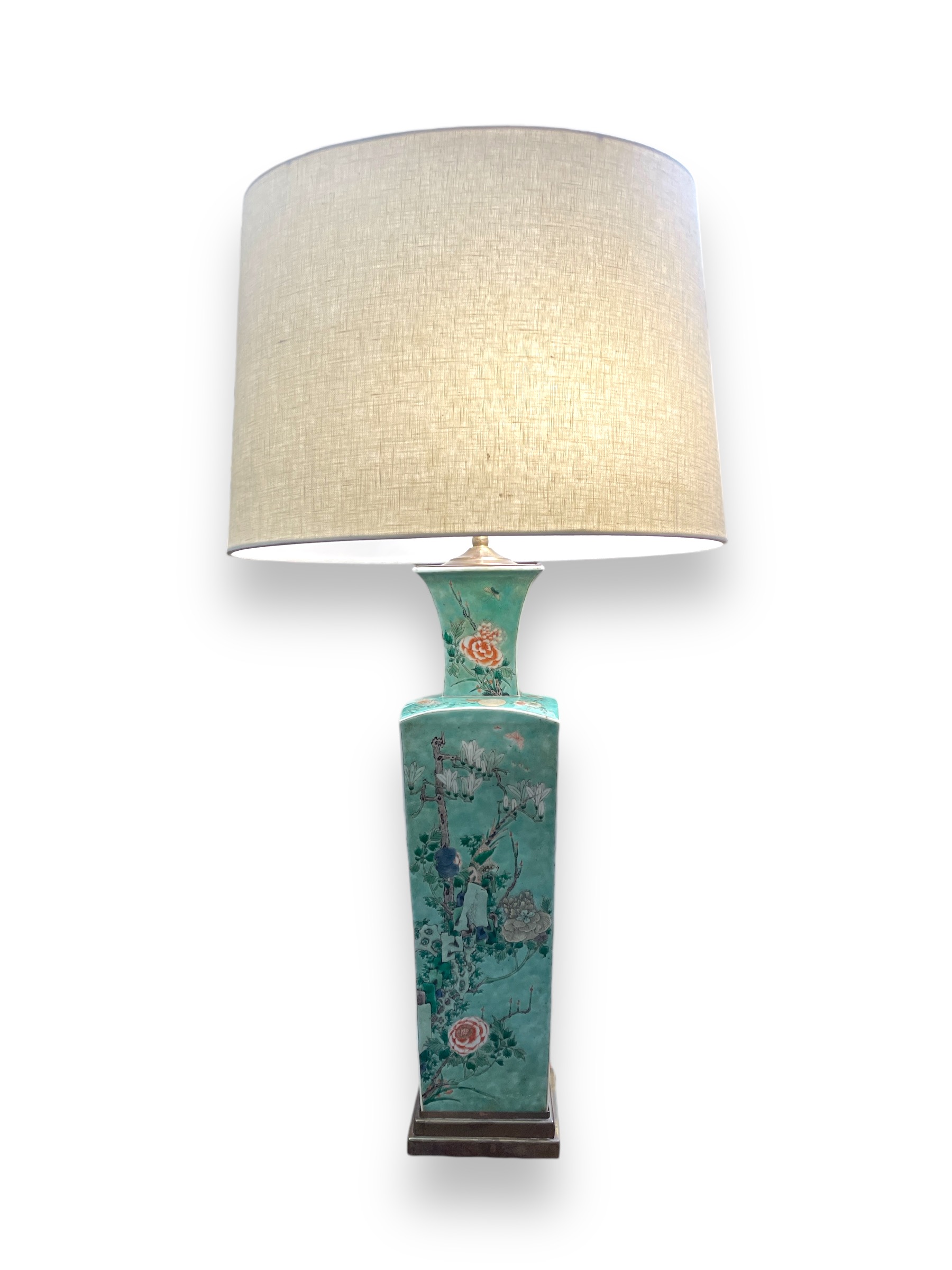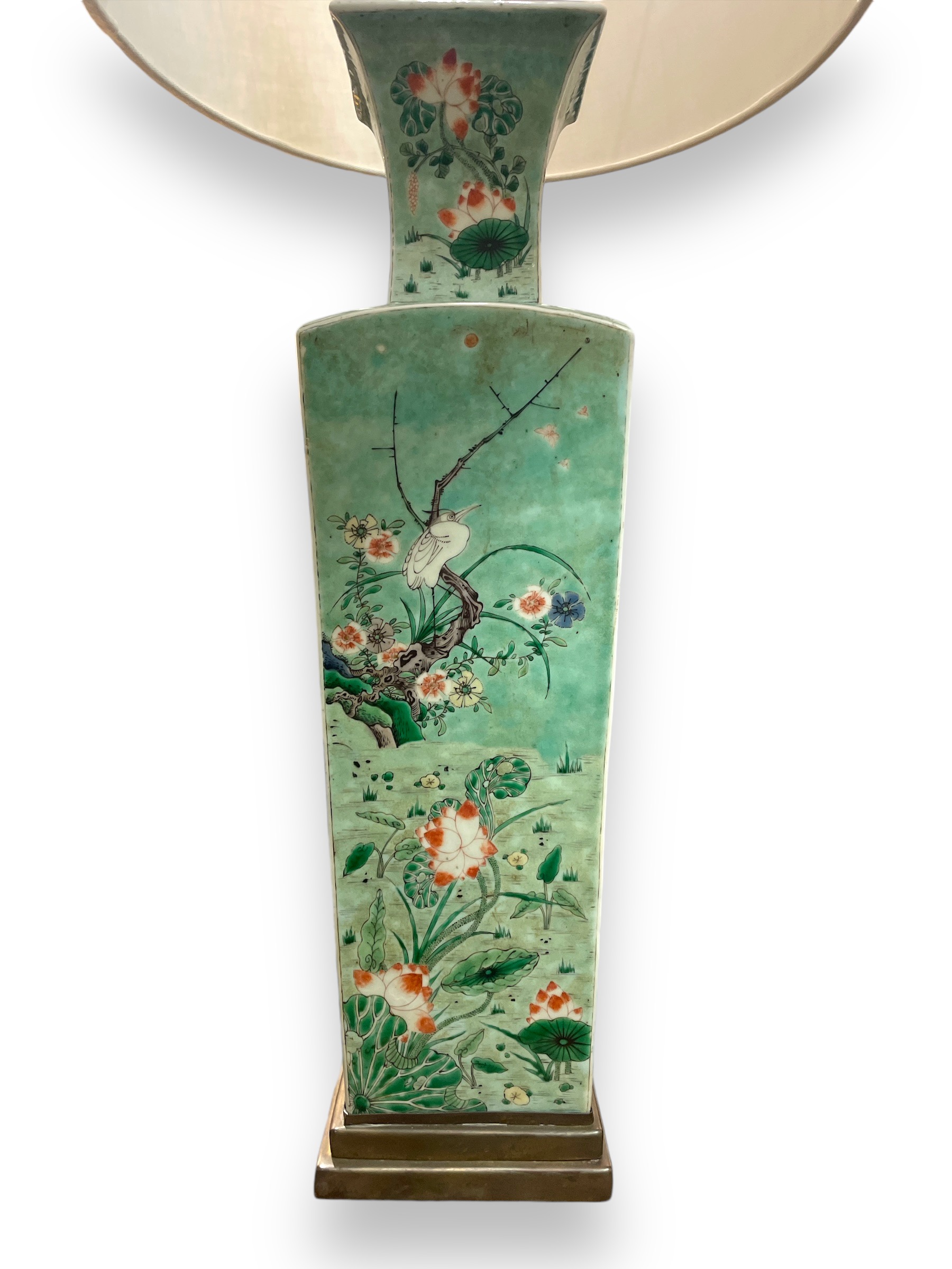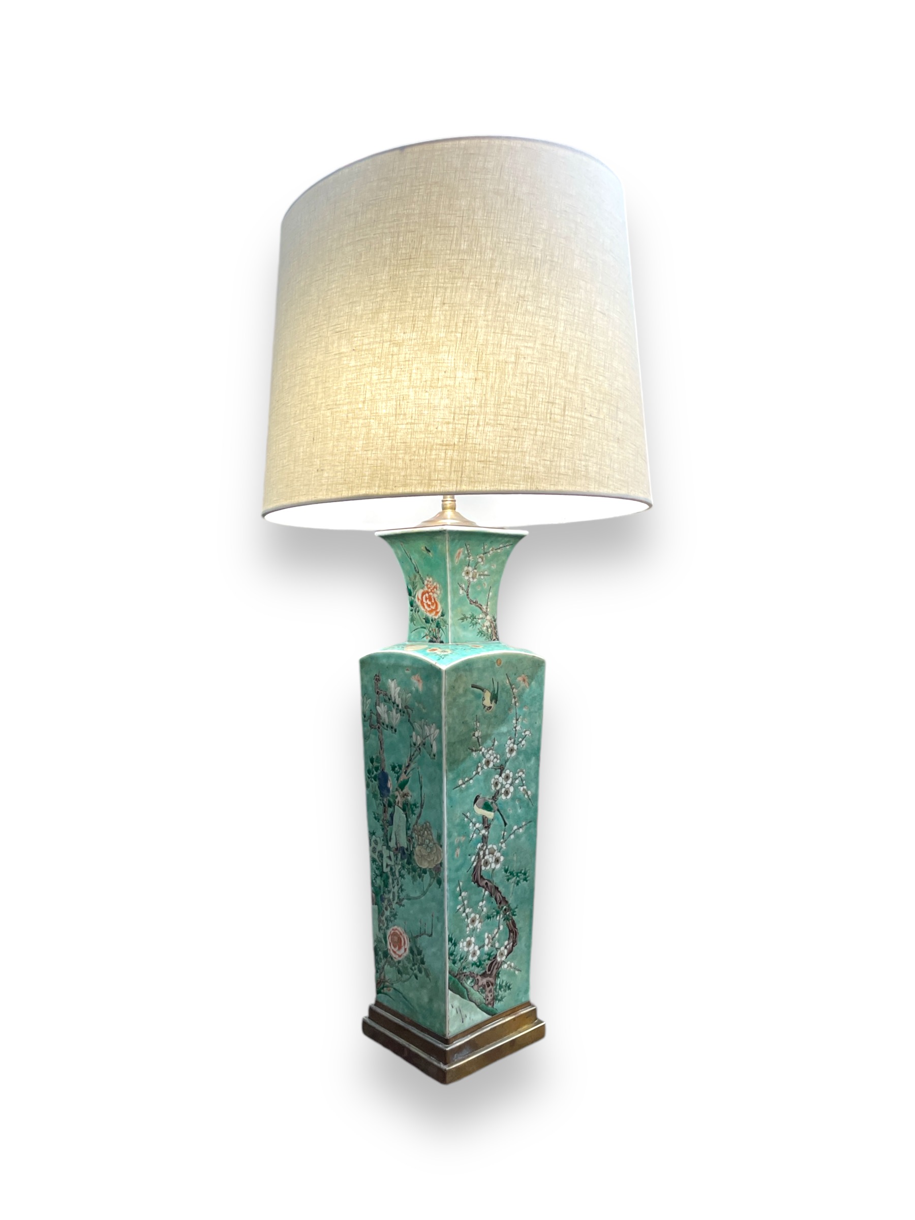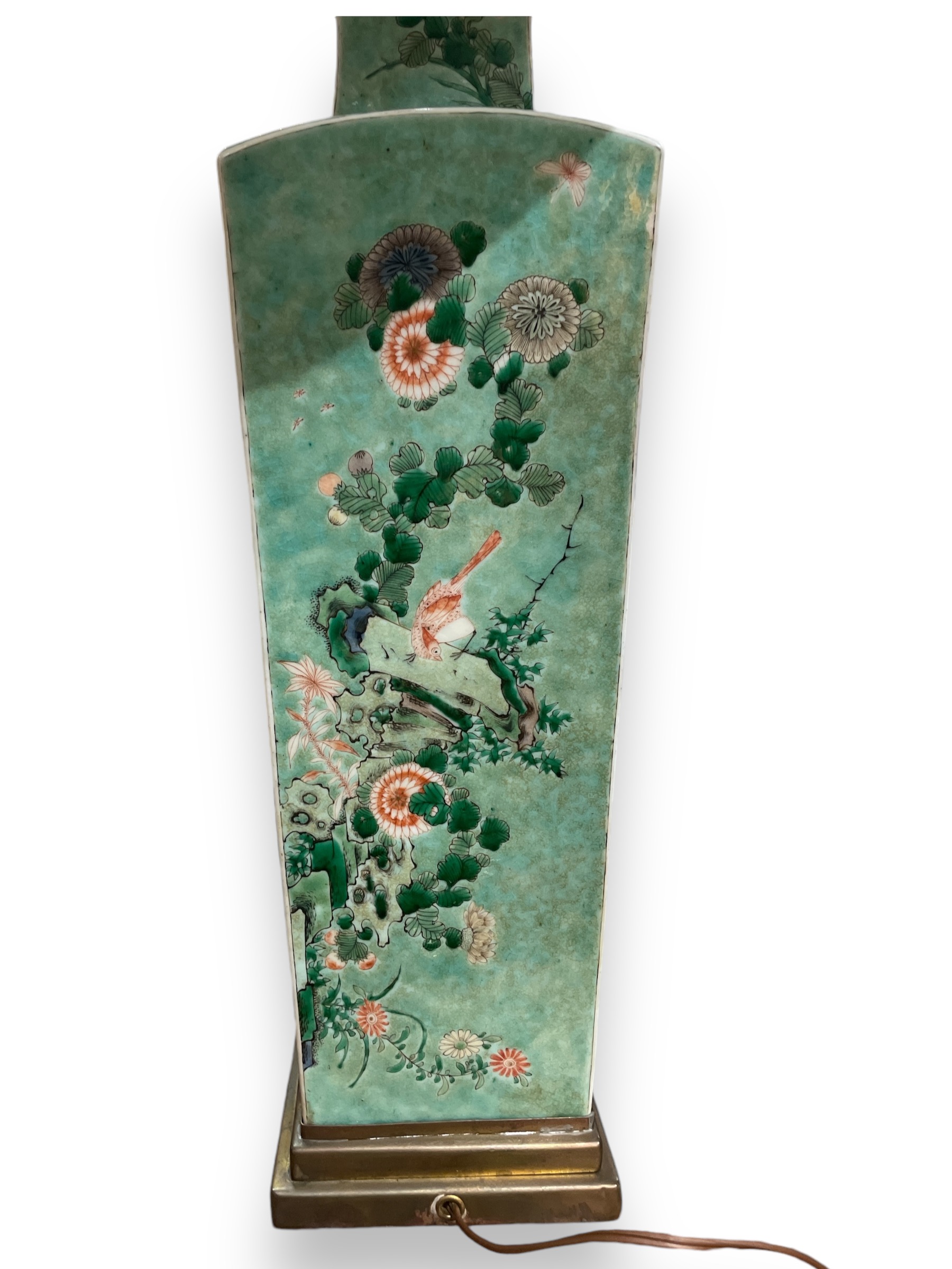 Chinese porcelain square baluster (square) green vase from the Qing dynasty, now a lamp, 1930's brass base.
