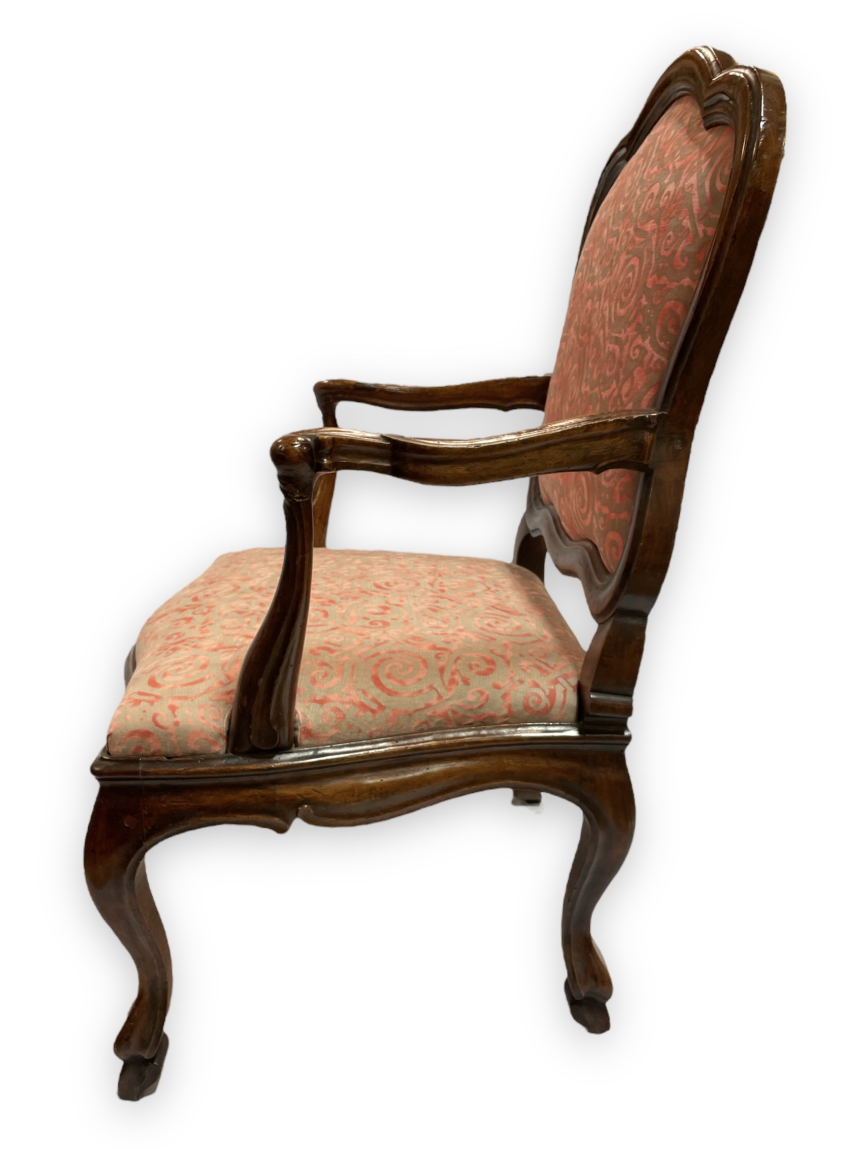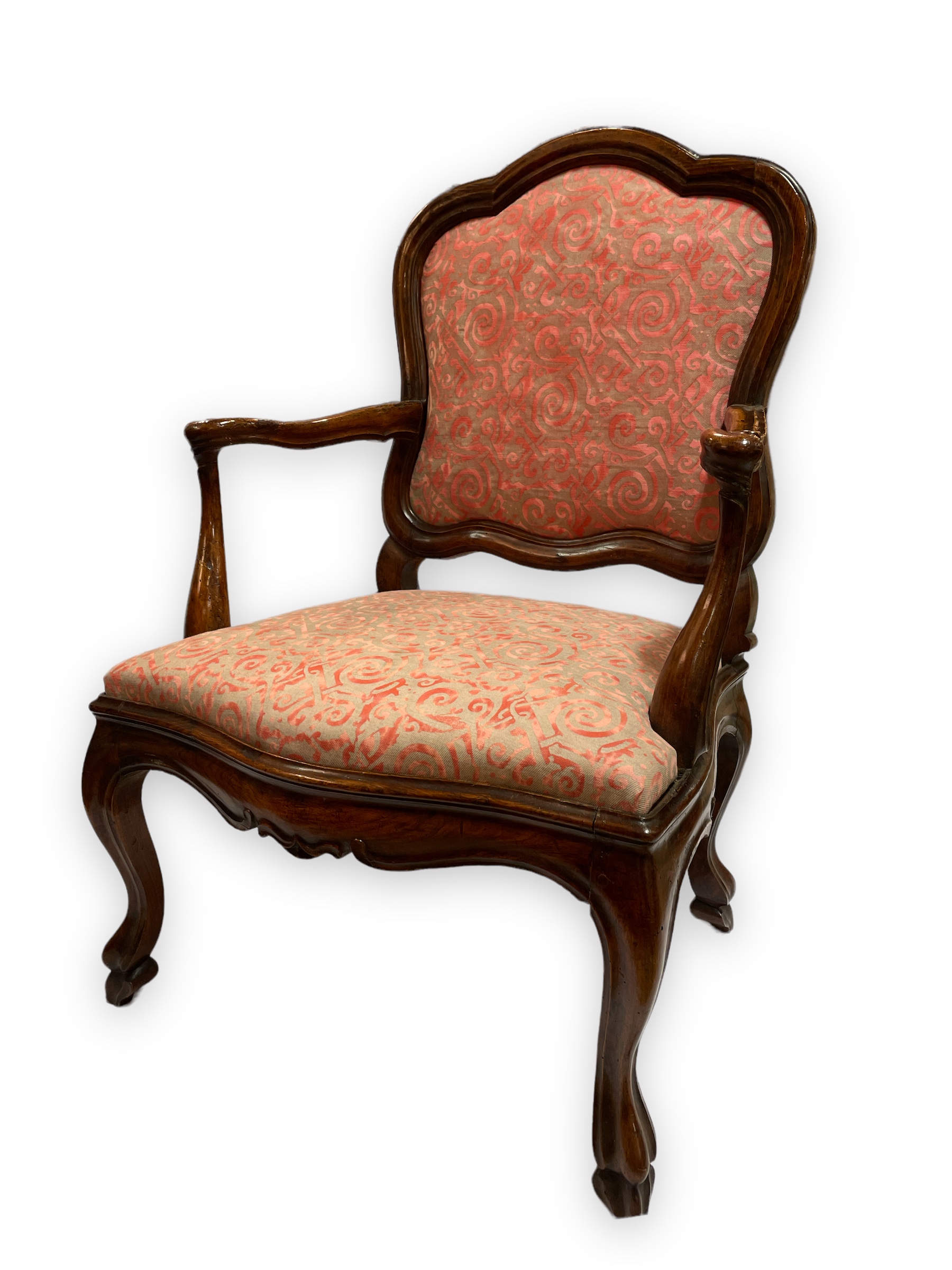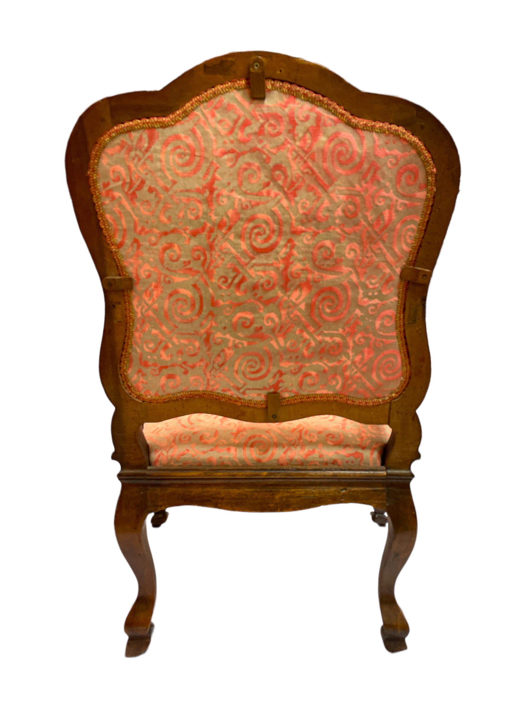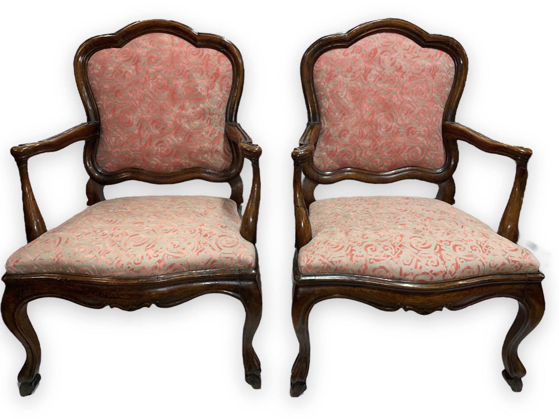 Pair of 18th C Italian walnut chairs from Venice (c. 1720) upholstered with vintage linen Fortuny fabric.