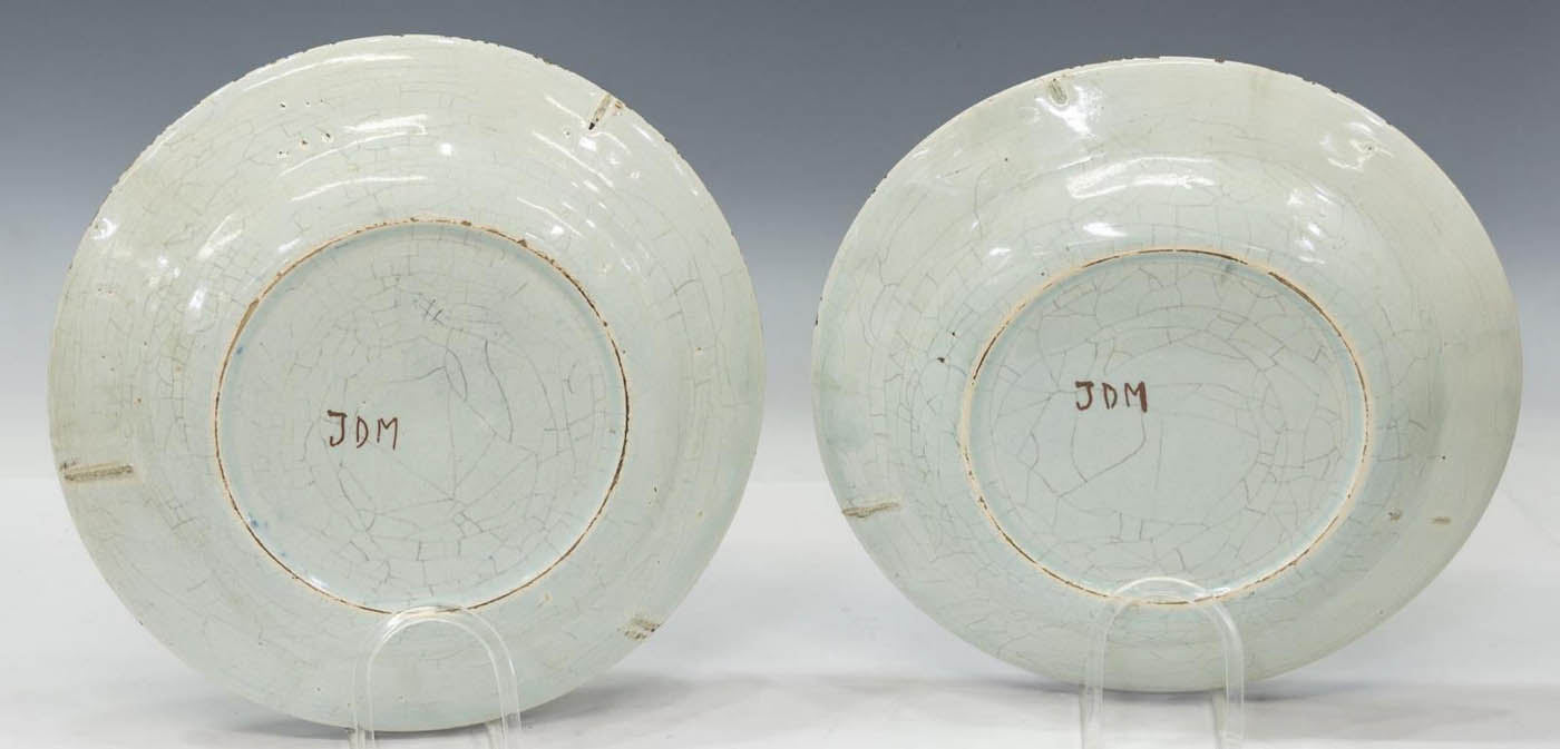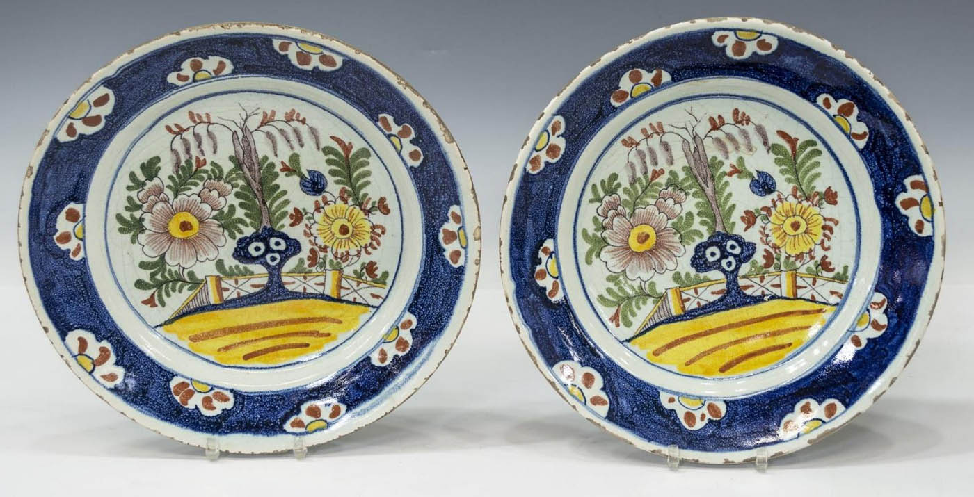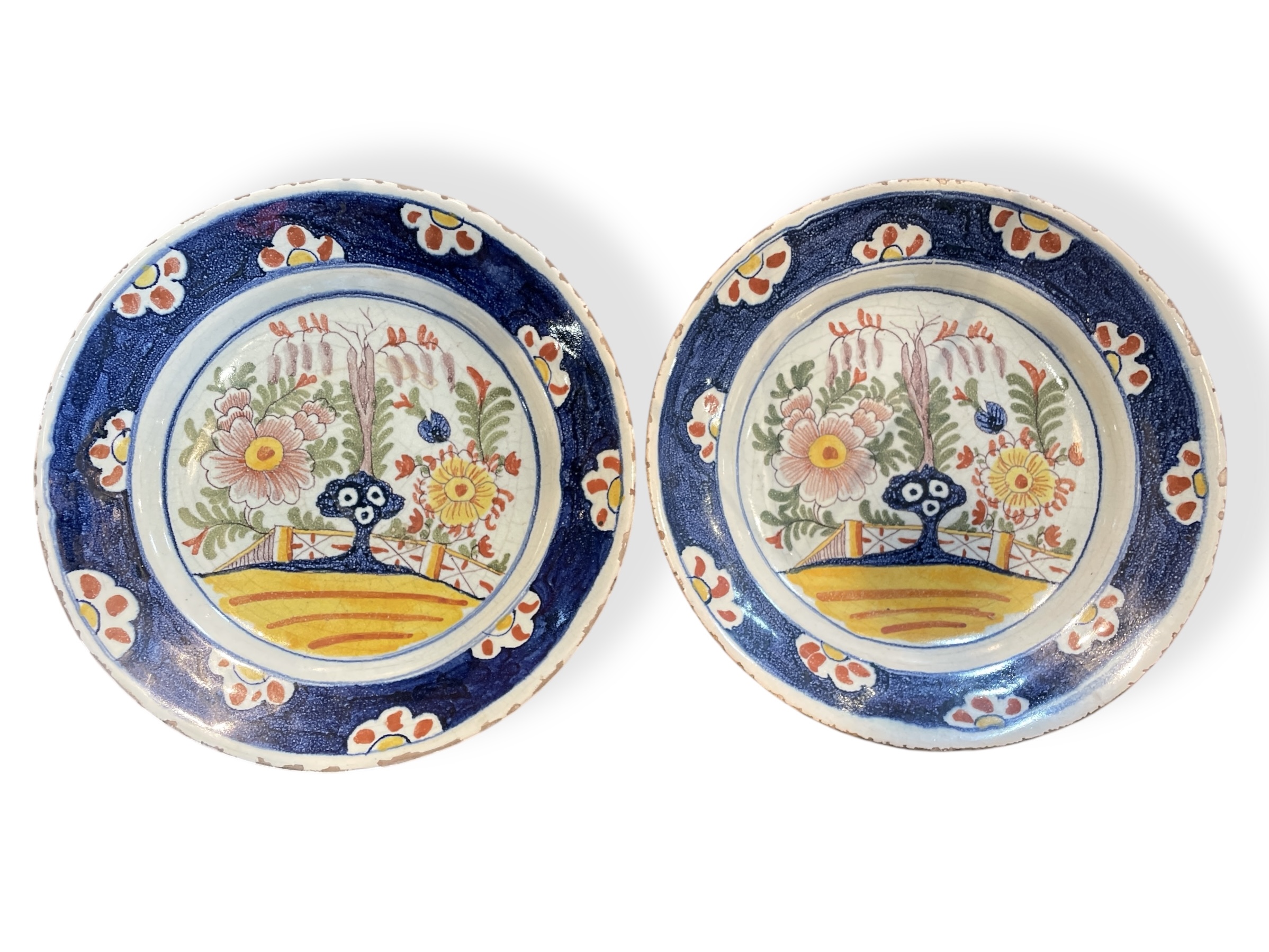 Pair of late 18th C polychrome Dutch Delft plates with colbalt rims and stylized flowers, interior is a willow tree with flowers; signed JDM.