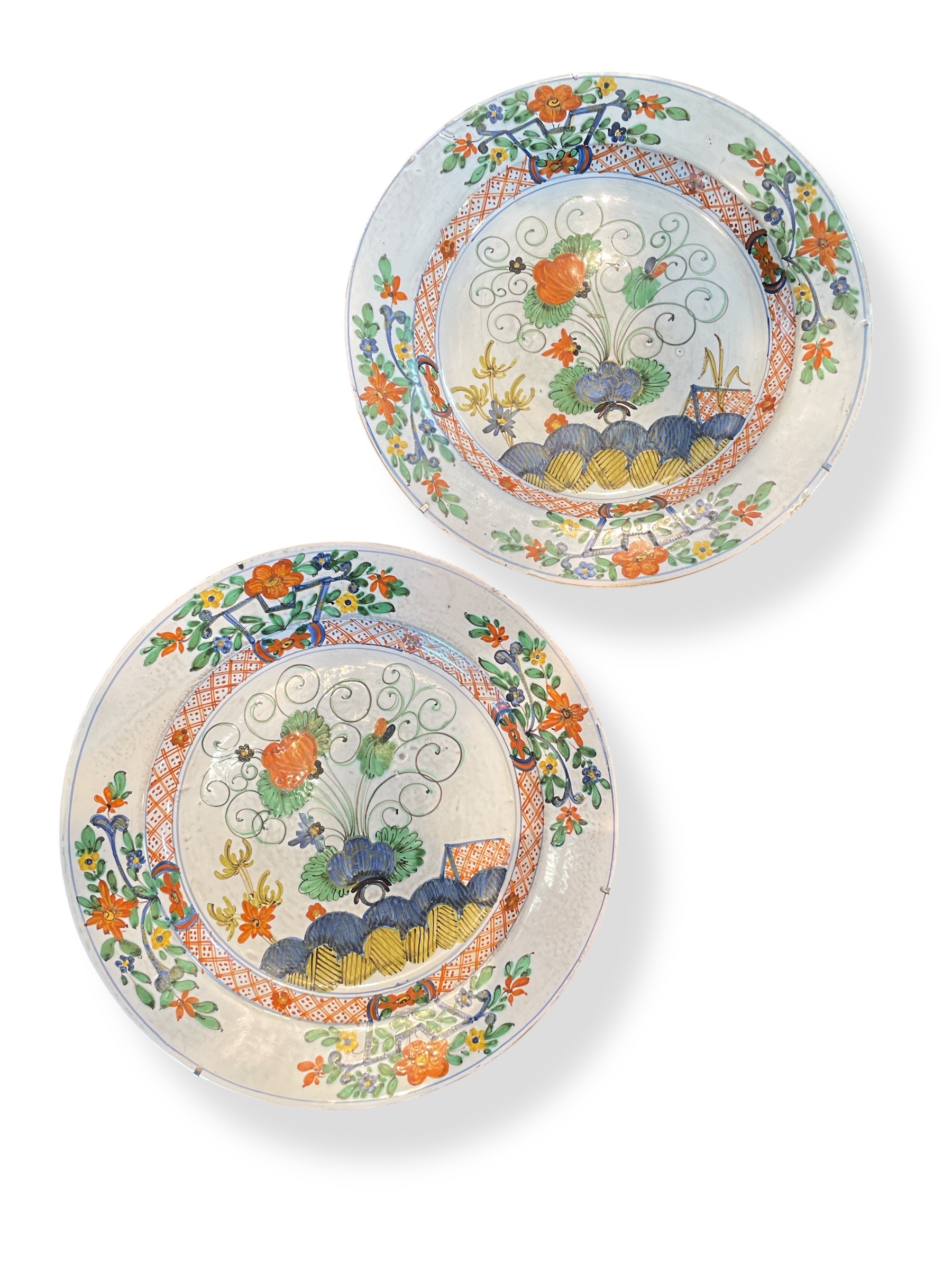 Pair of Dutch Delft polychrome plates, 18th C, with flowering bouquet in center and four flower cartouches on each rim.
