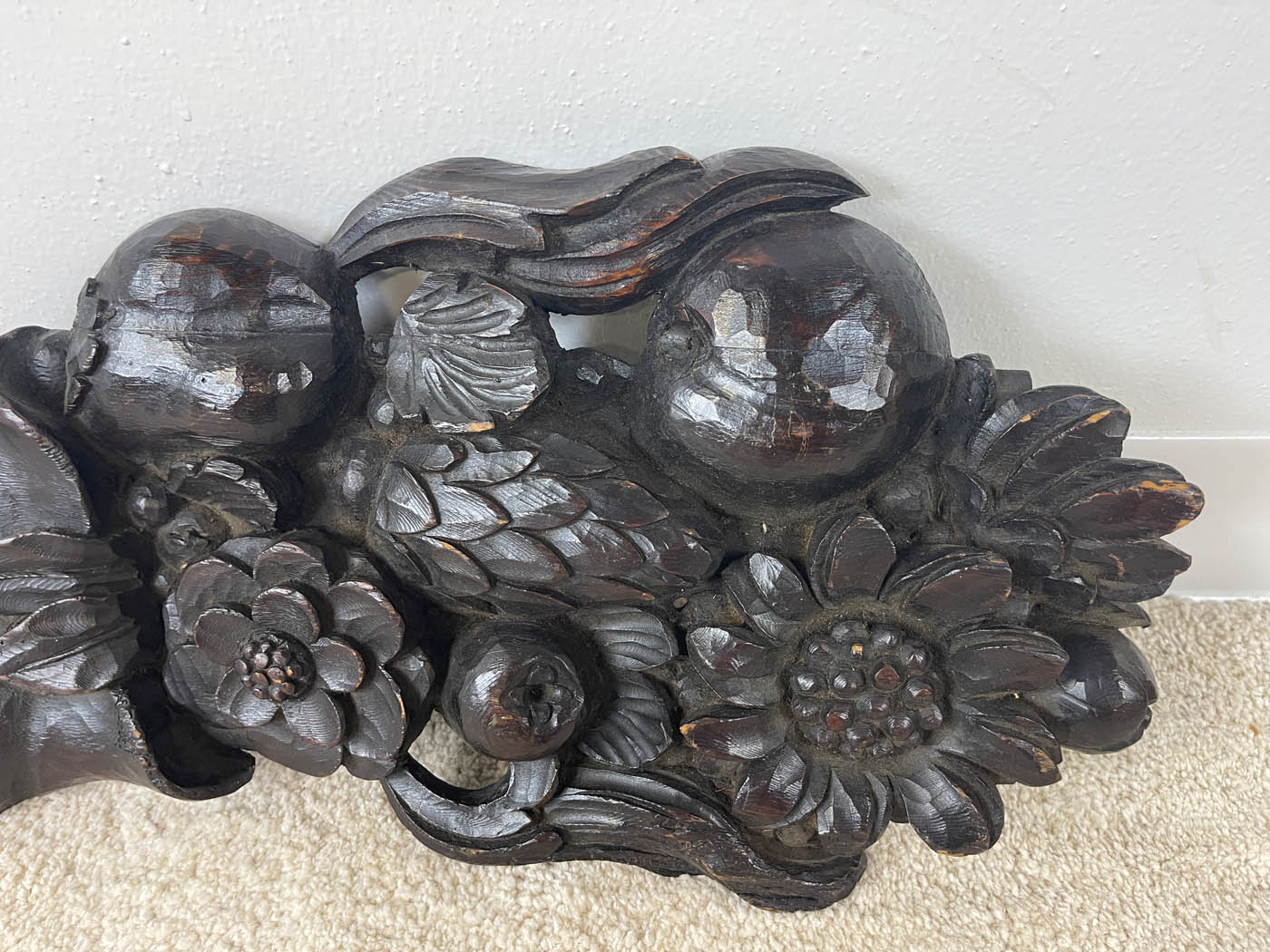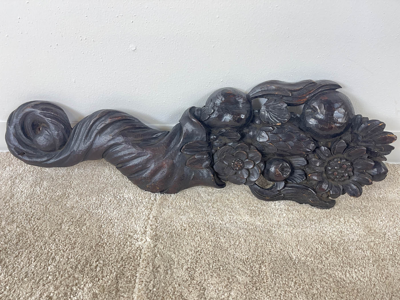 Early 19th C woodcarving of cornucopia w/ fruit in dark chocolate finish.