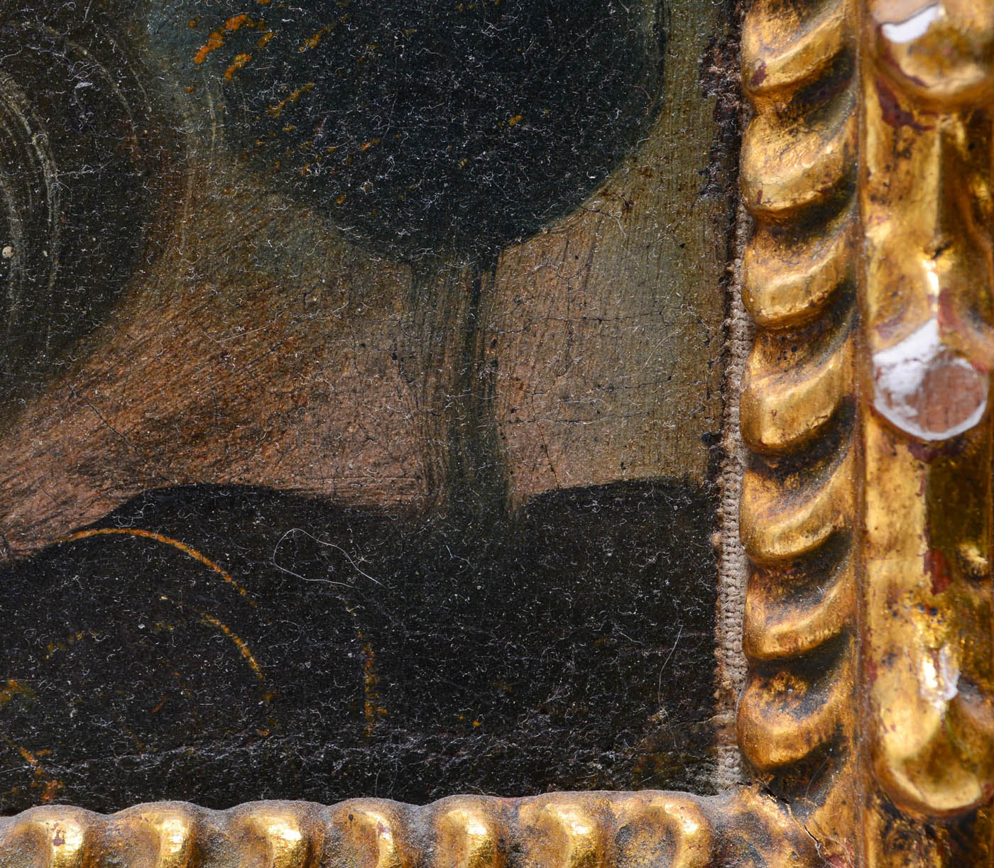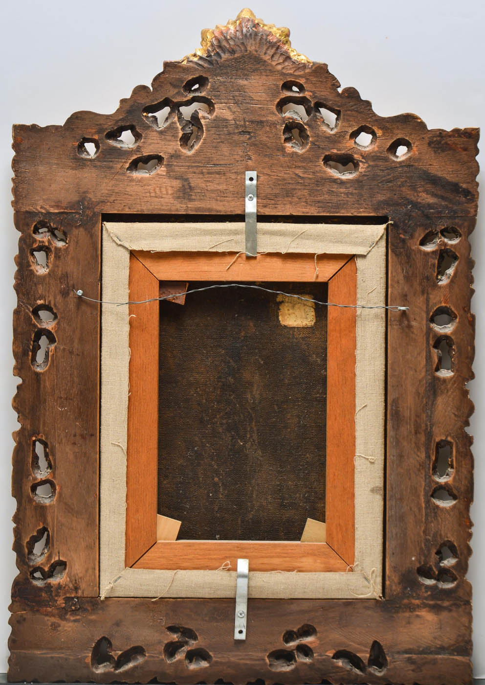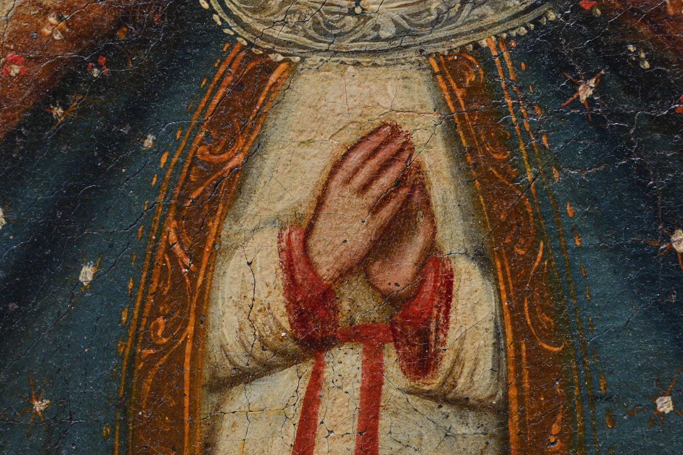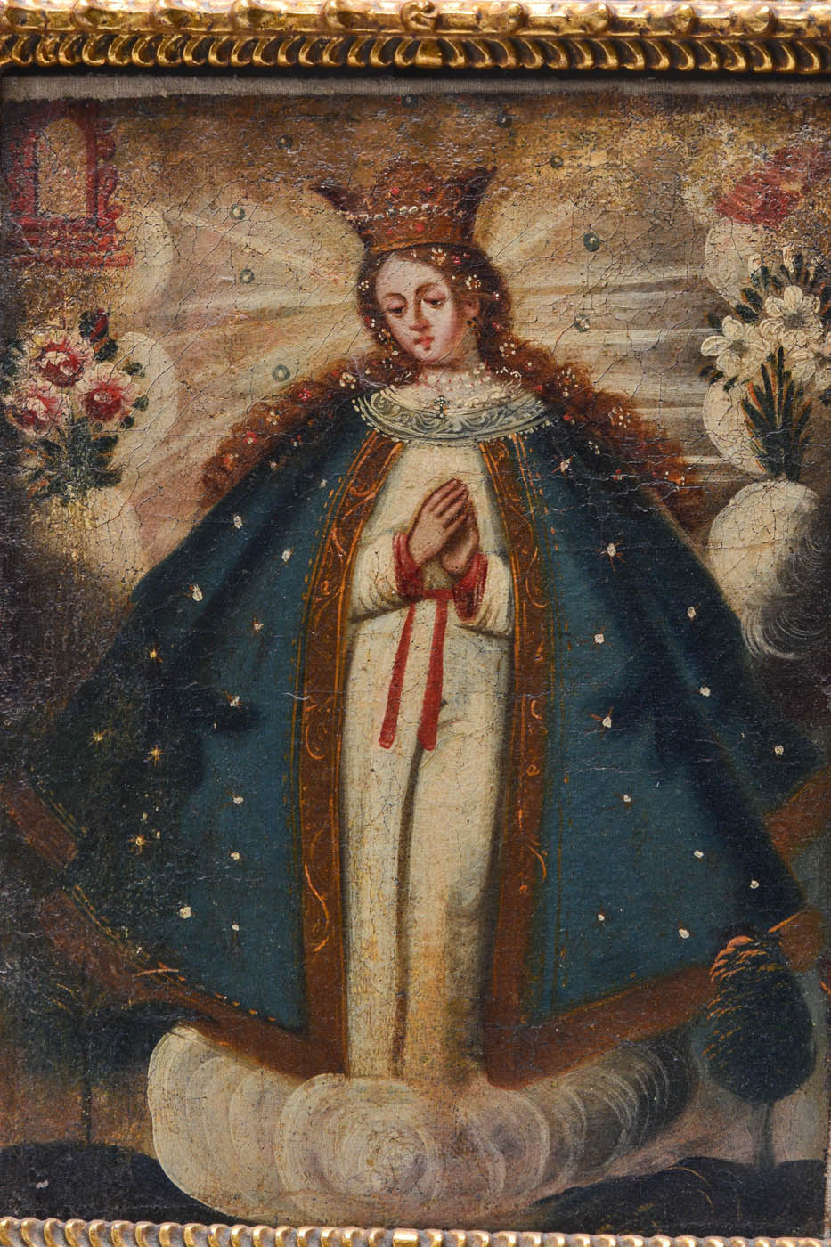 18th C Spanish Colonial oil painting in period gilt frame, titled "Immaculate Conception". Probably Cusco, Peru.