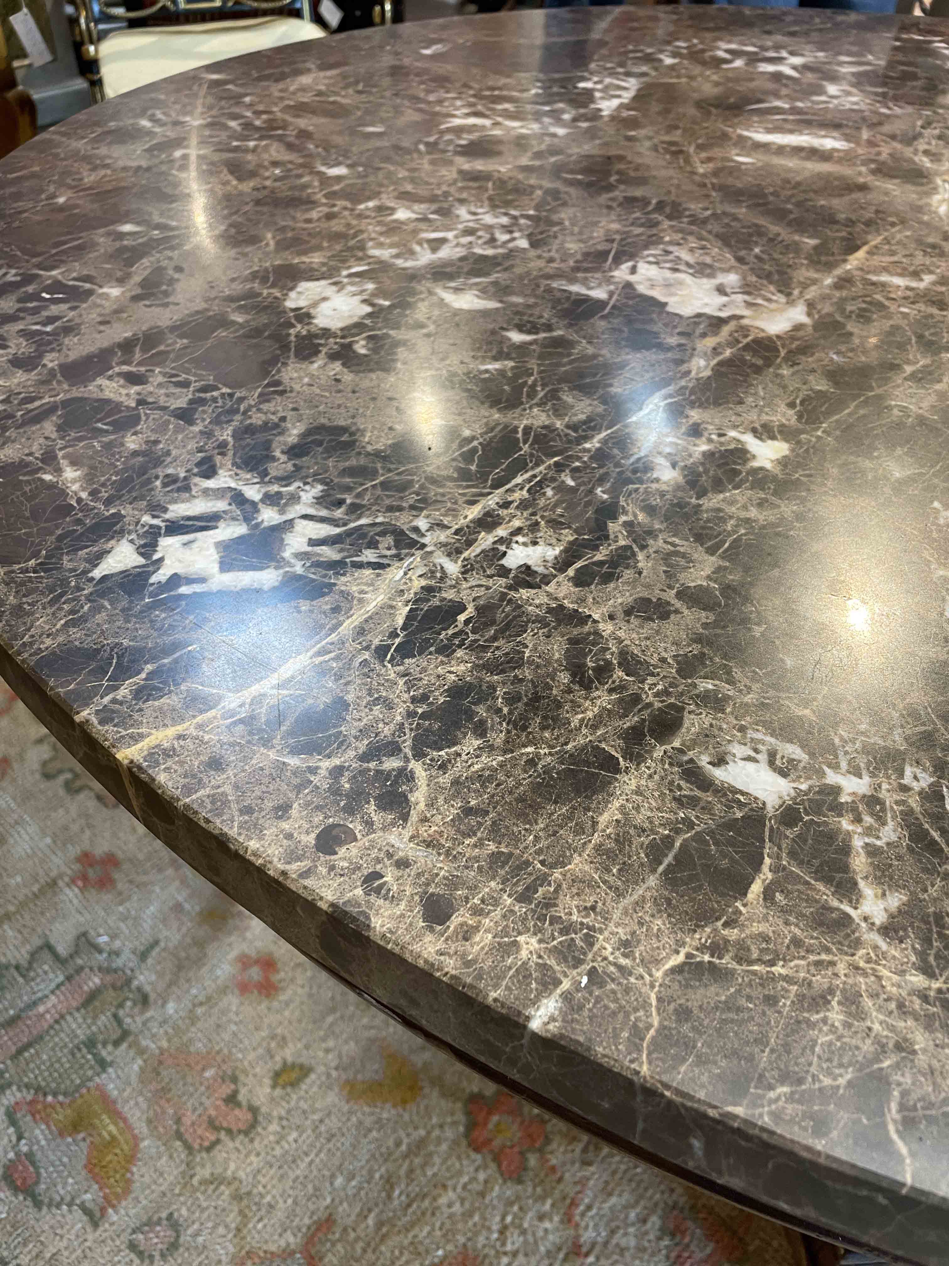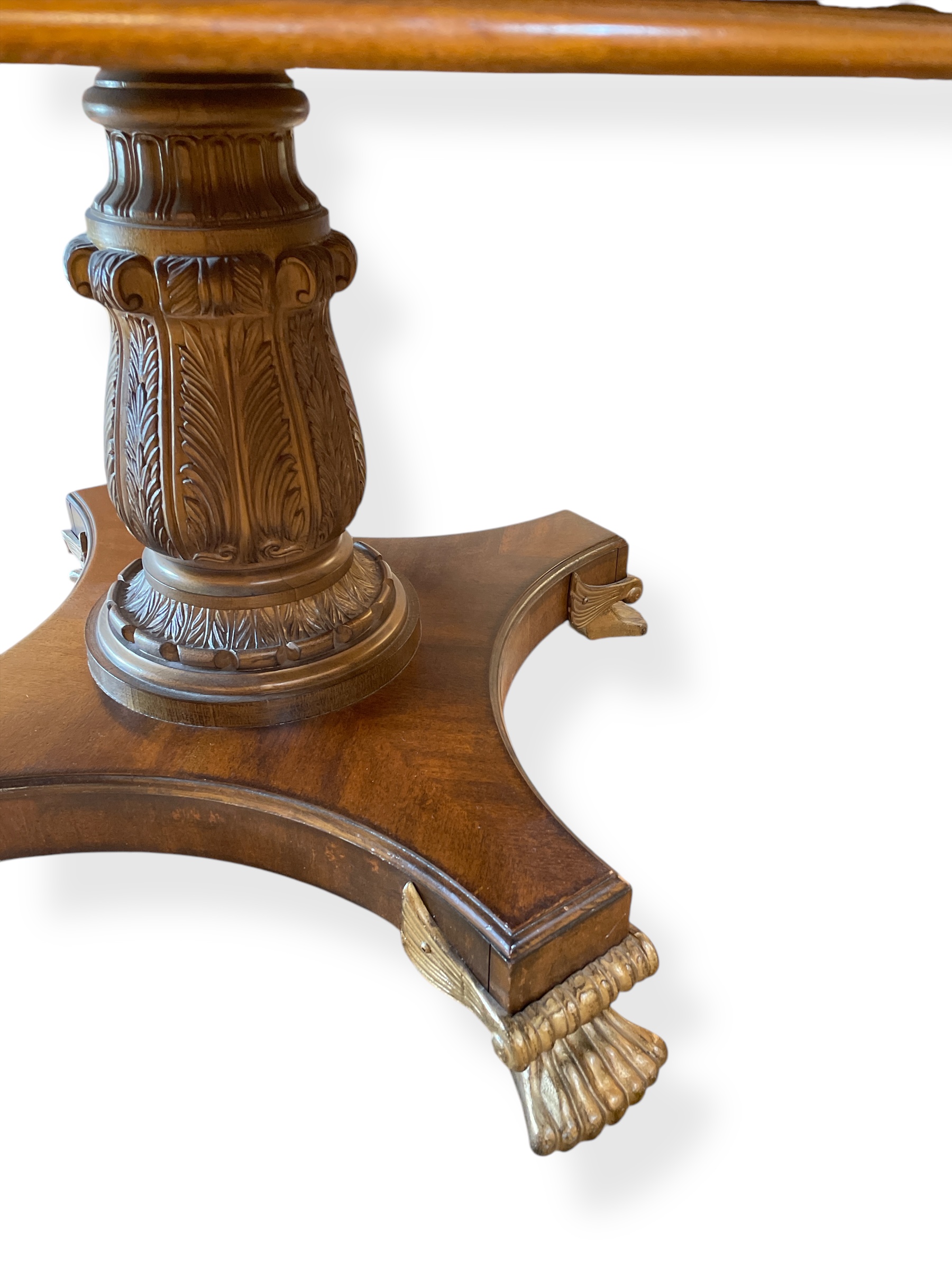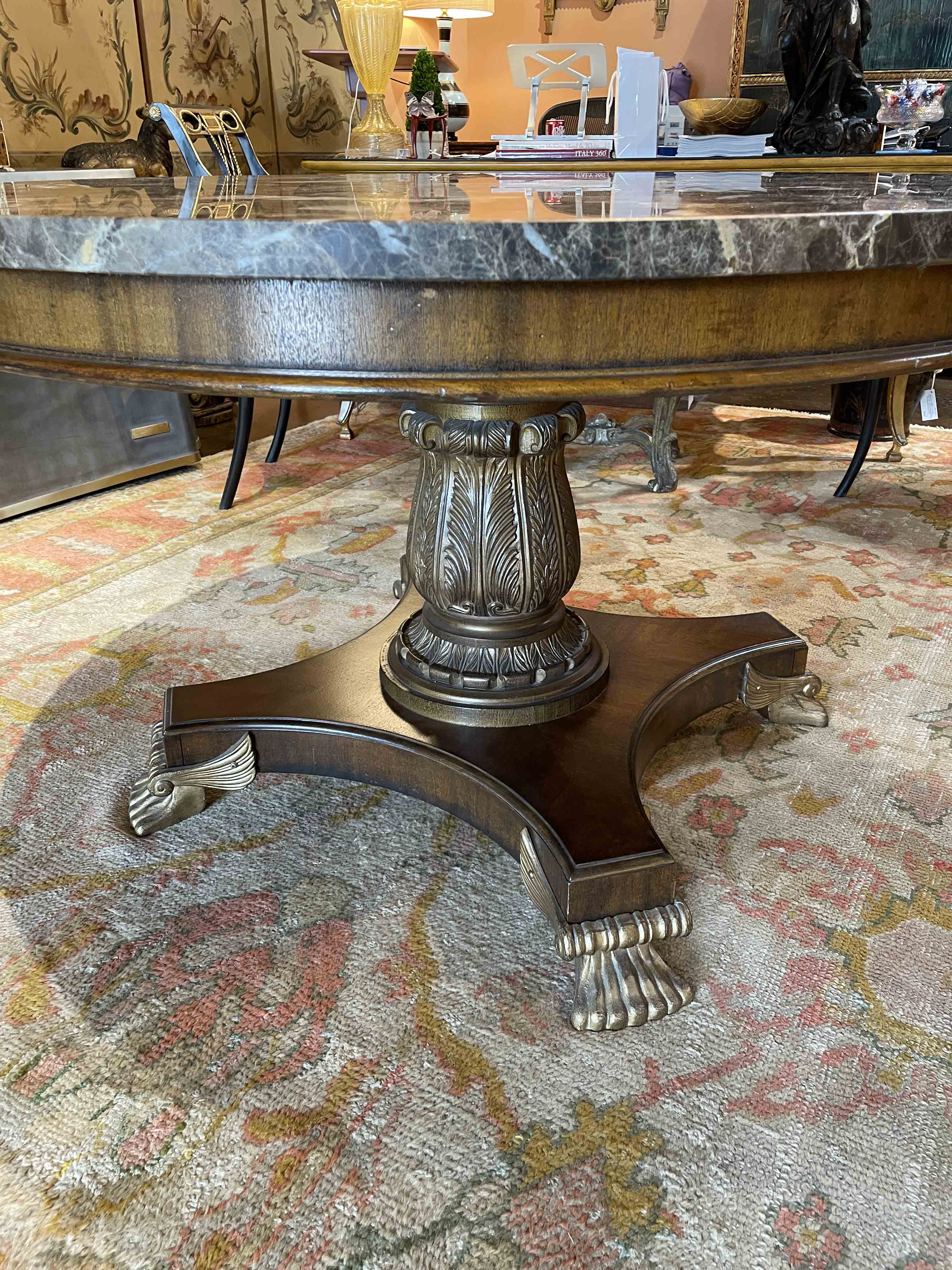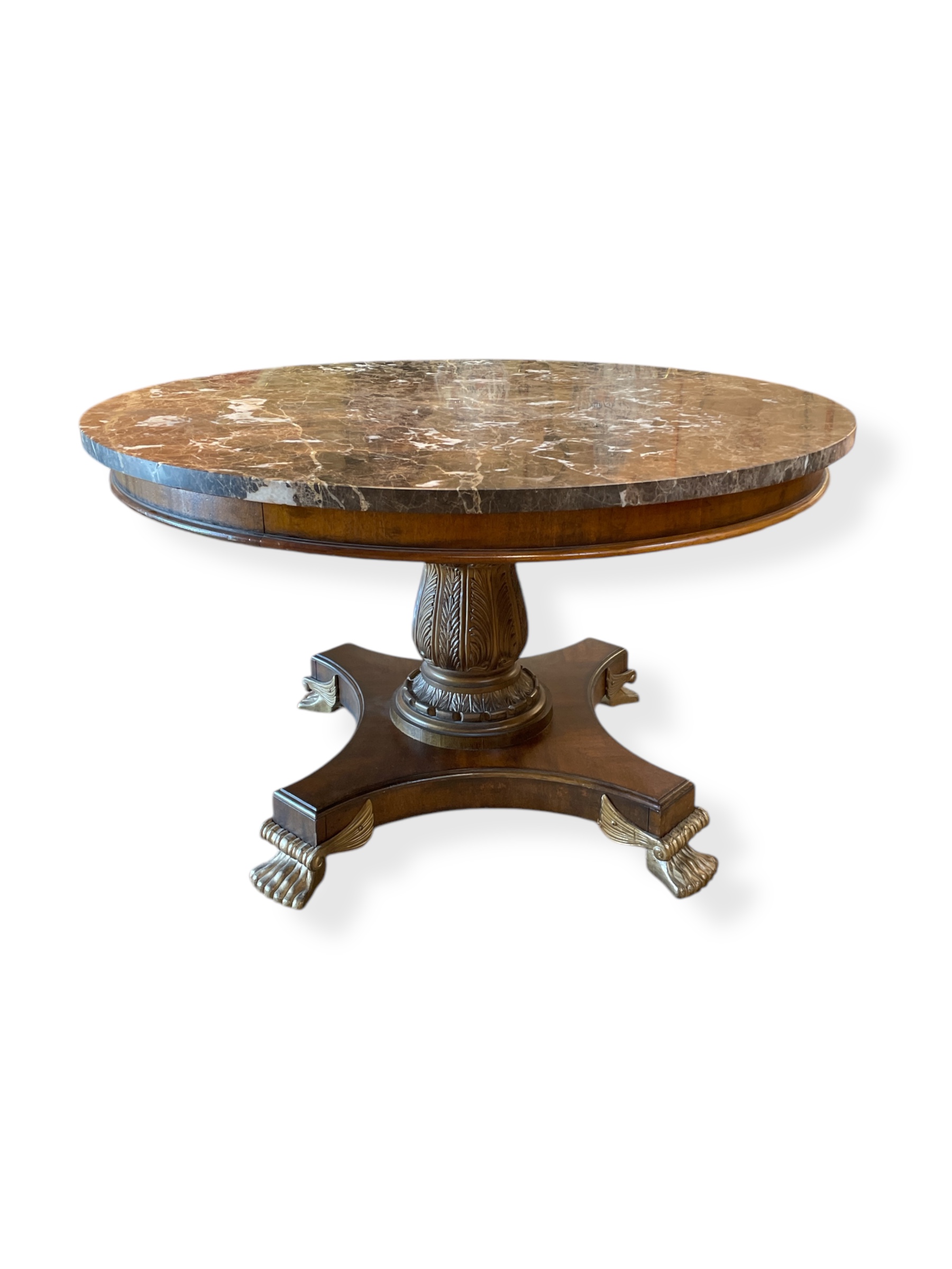 19th C French mahogany gueridon with carved pedestal in an acanthus design, exaggerated gold gilt winged paw feet and marble top.