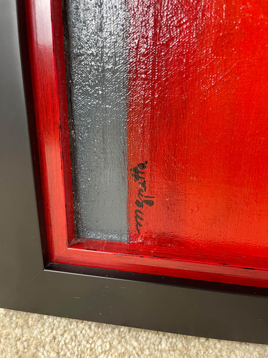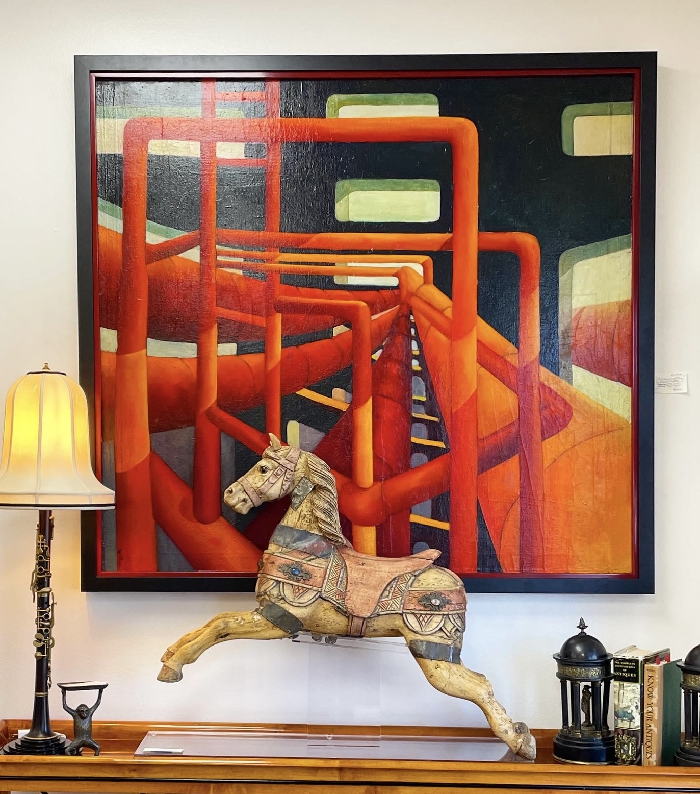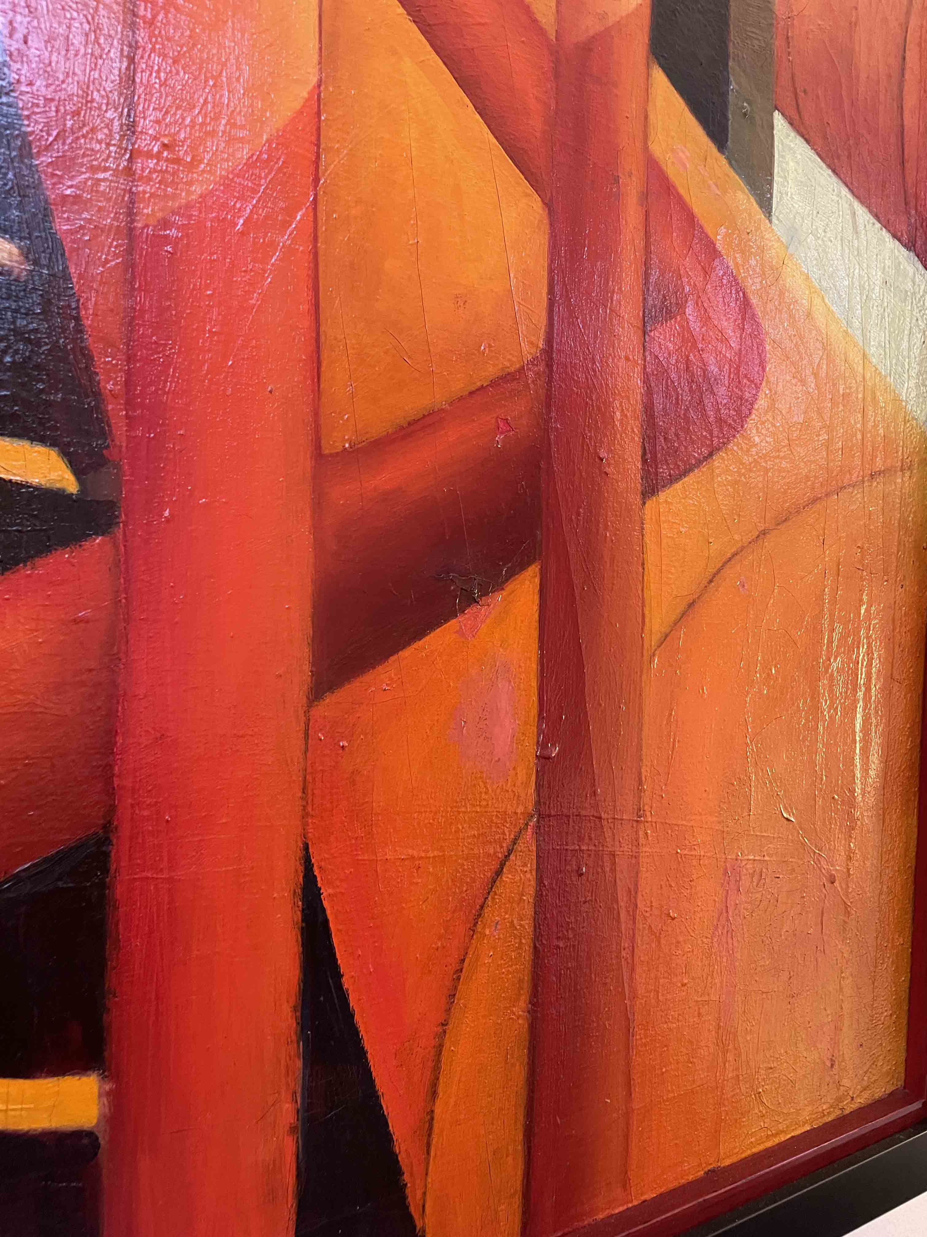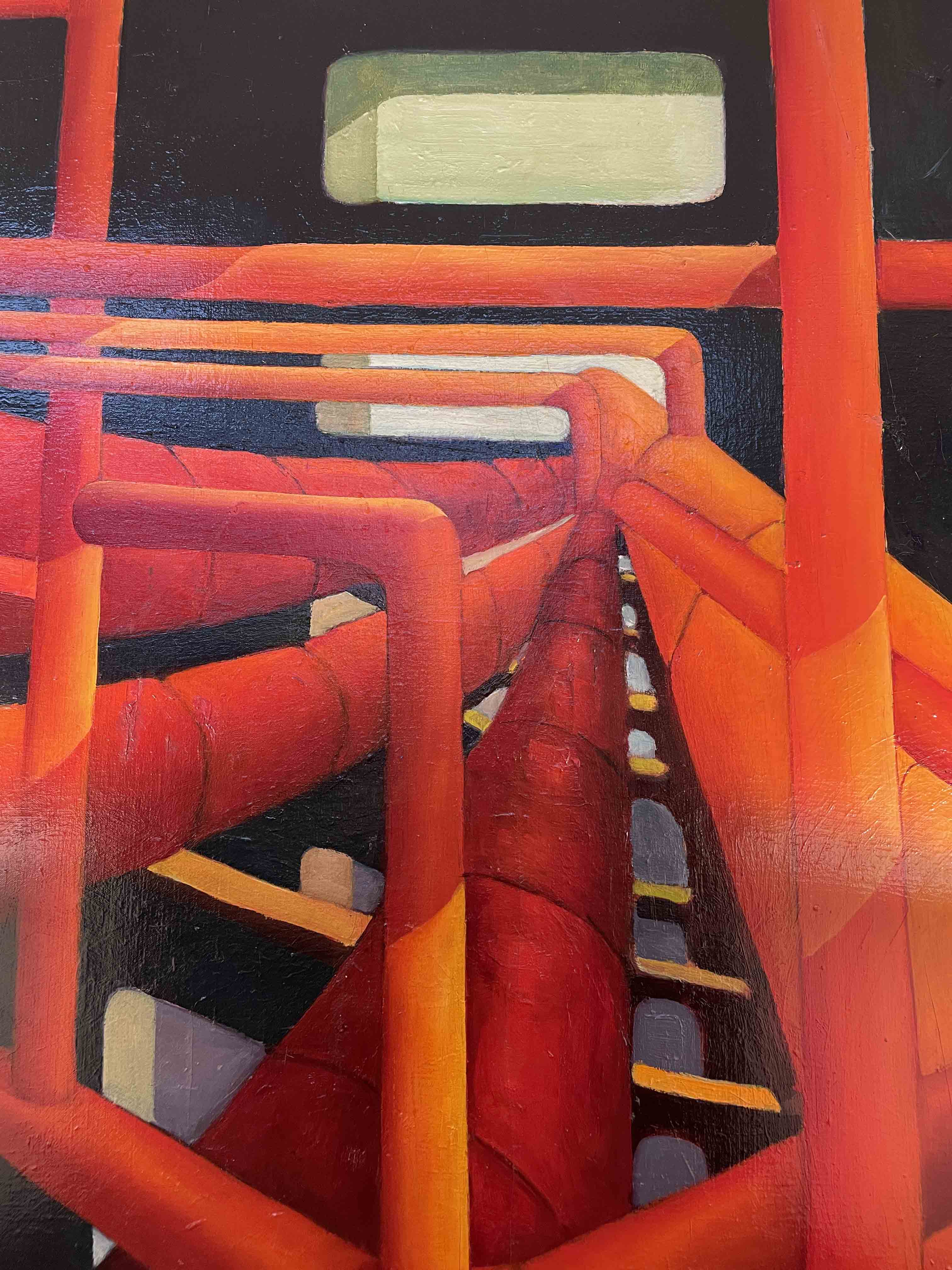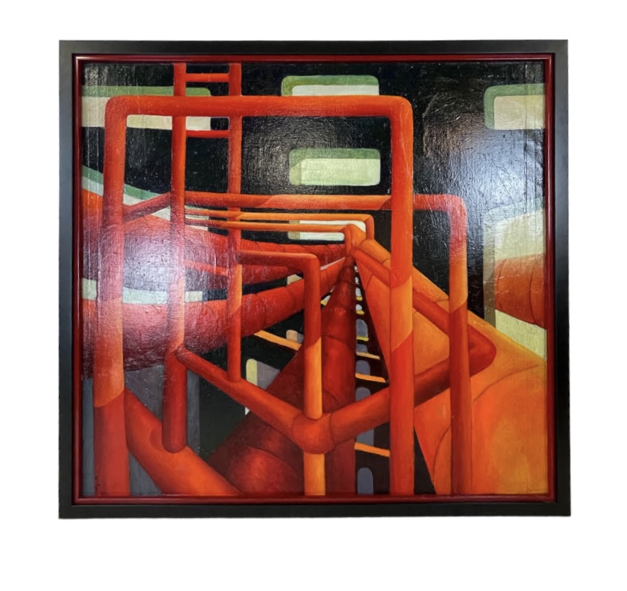 Oil on canvas painting, framed, by Edward Manetta (American 1923-2010) titled "Red Pipes".
