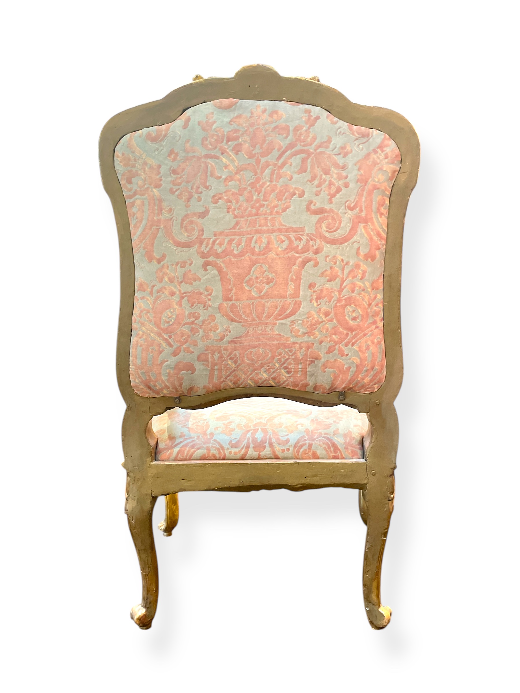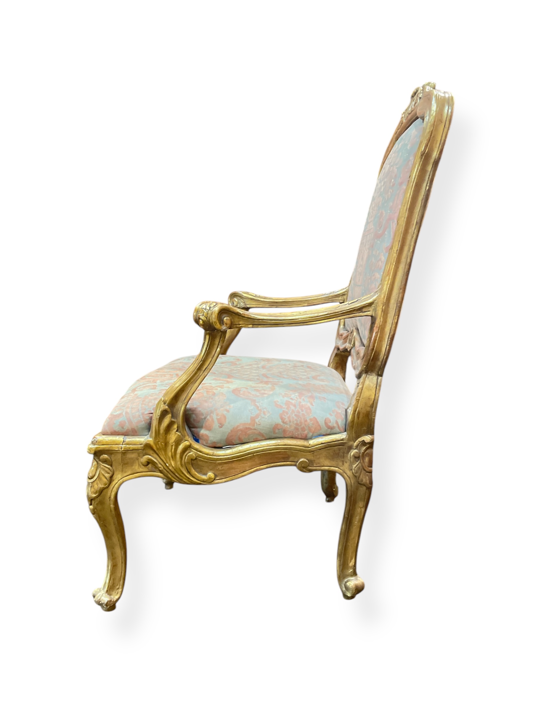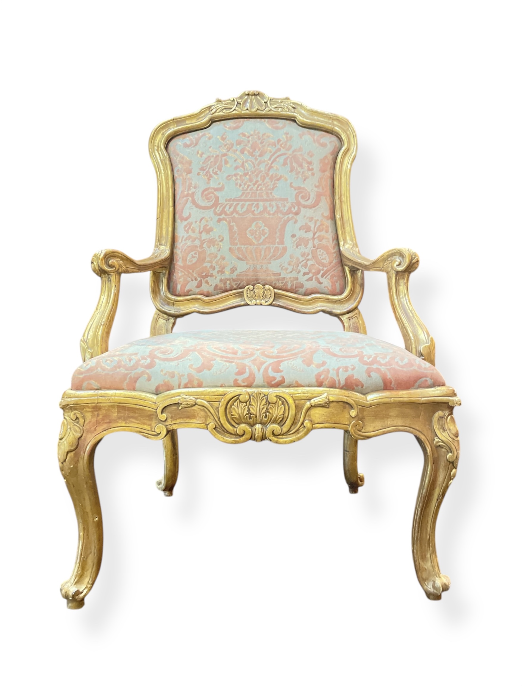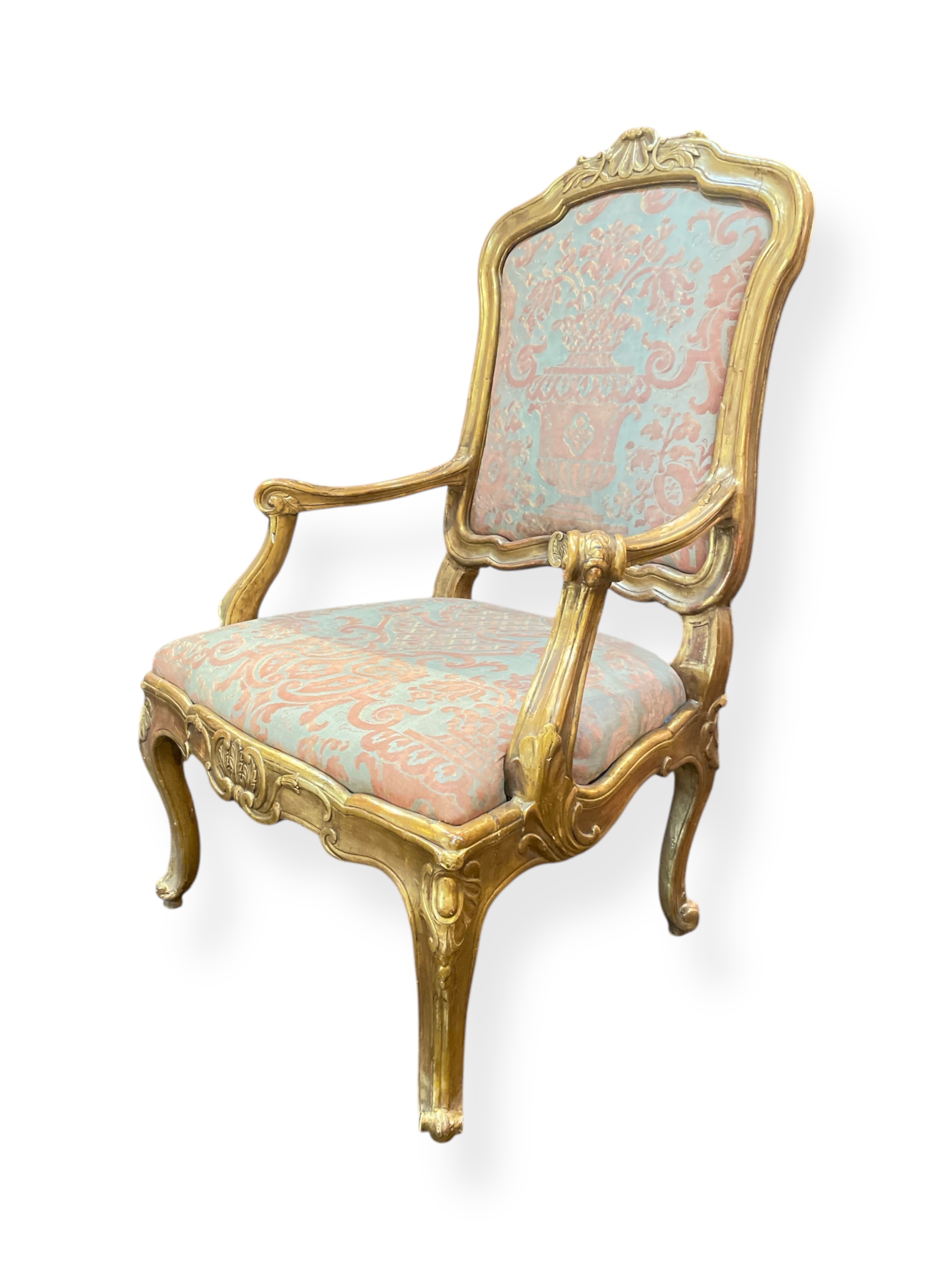 Pair of 19th C Italian giltwood fauteuils with Fortuny upholstery.