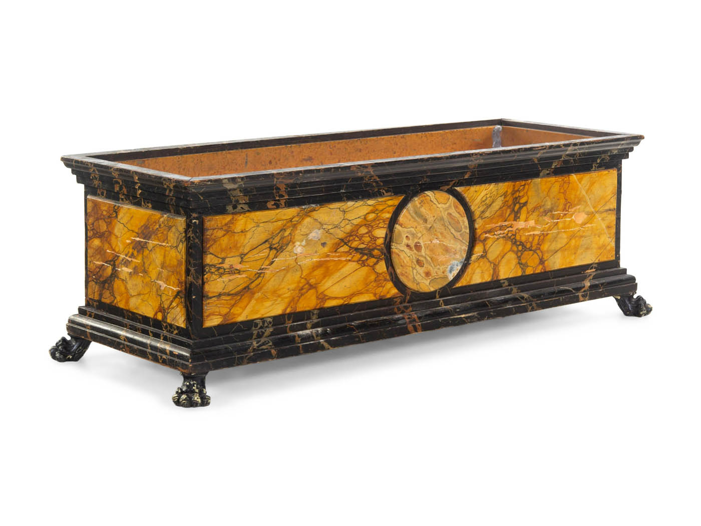 19th C Continental large faux marble jardiniere with hairy paw feet and copper lined interior.