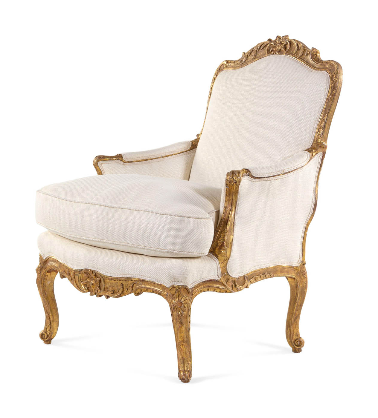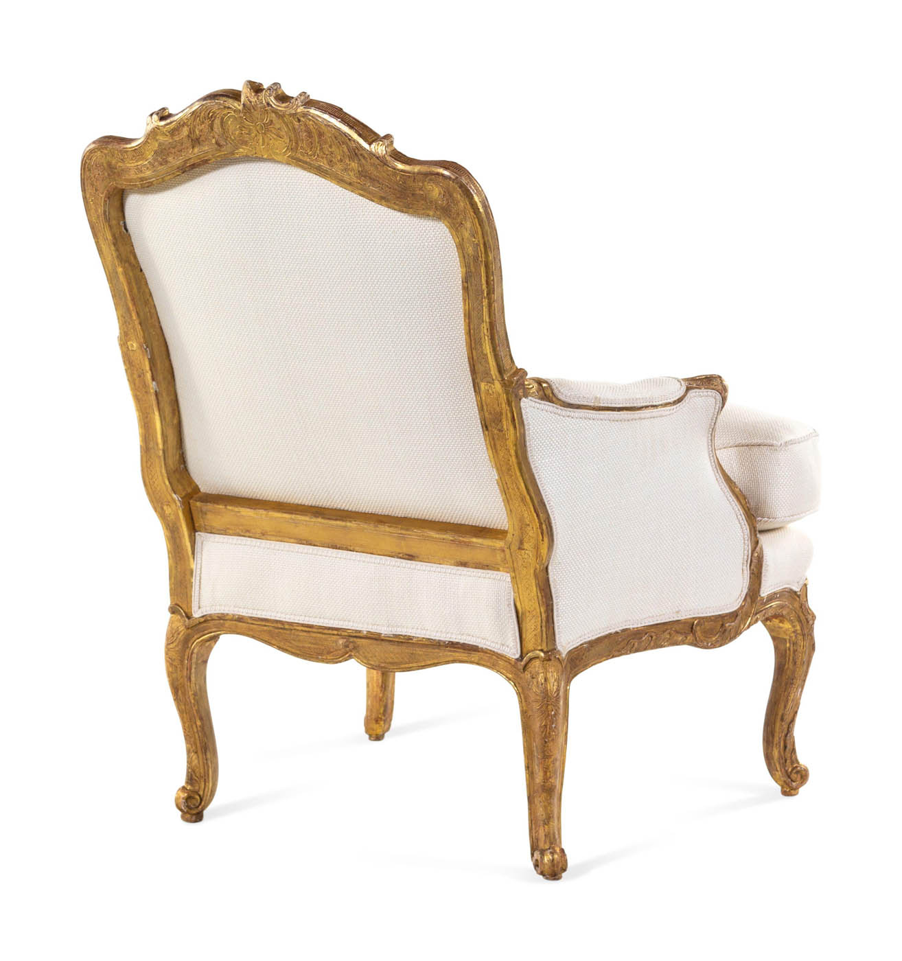 French Regence c. 1745 giltwood bergere attributed to Jean-Etienne Saint Georges (French 1723-1790); Provenance: Christie's NY, June 5-6, 2002.
