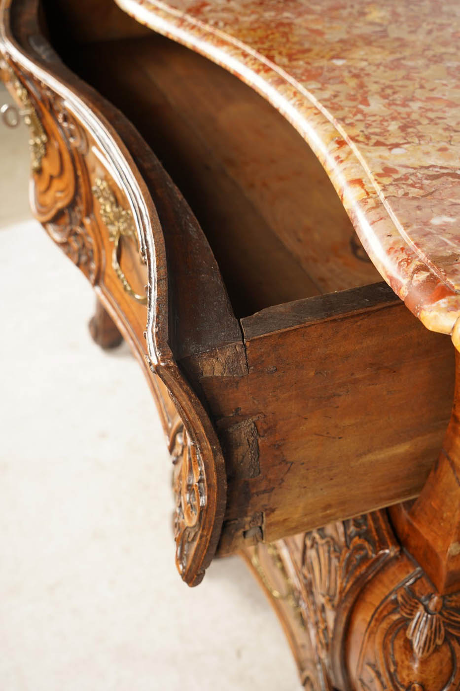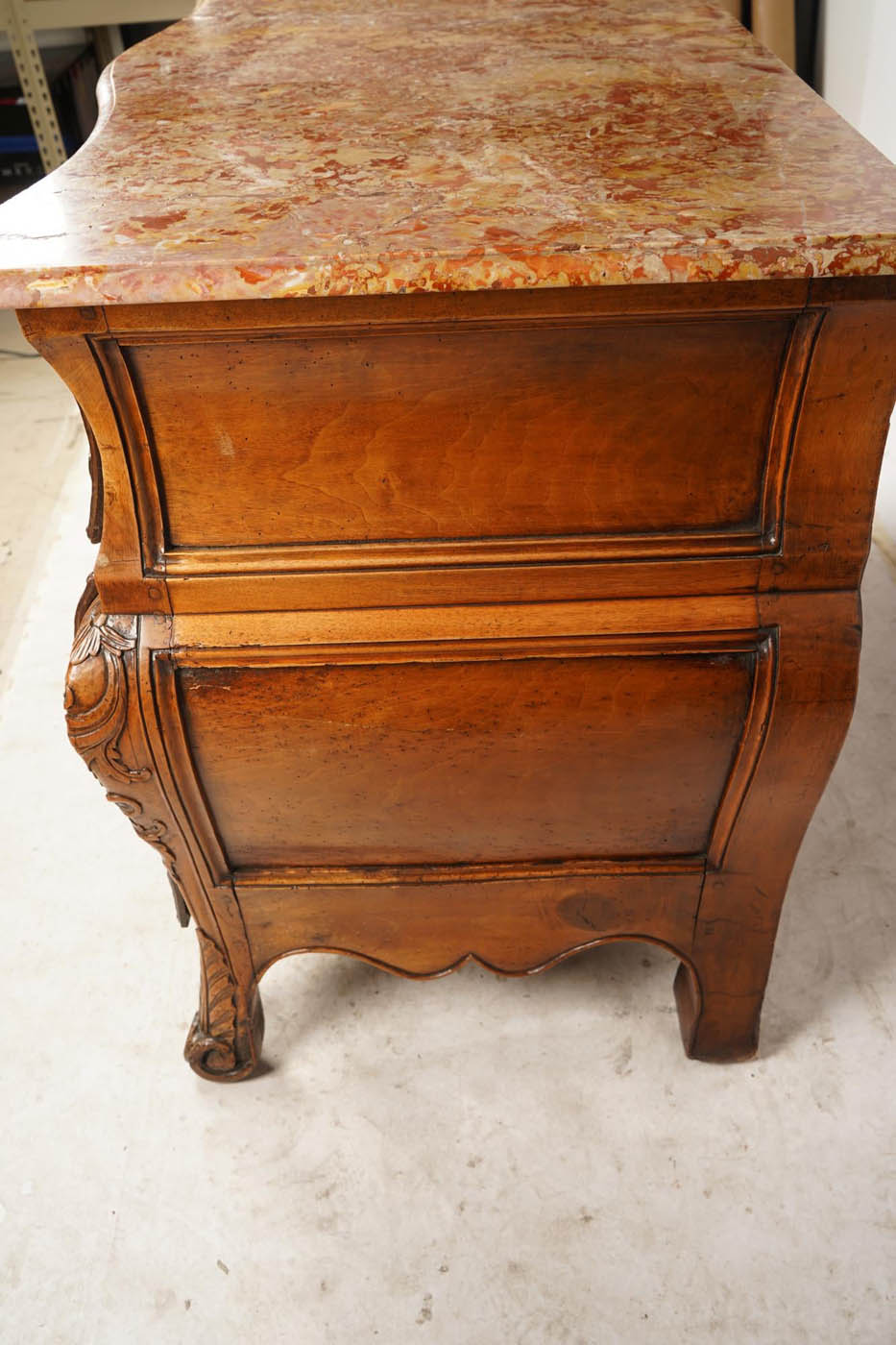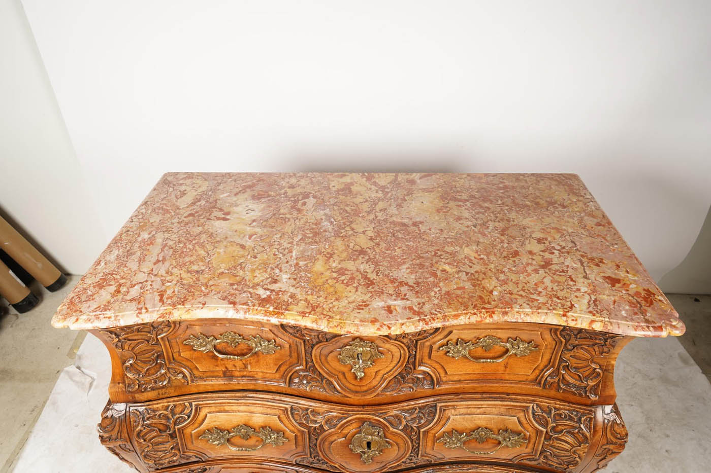 18th C French Regence marble top commode, c.1735, Breche d' Alep marble top) with serpentine front edge and three long drawers.