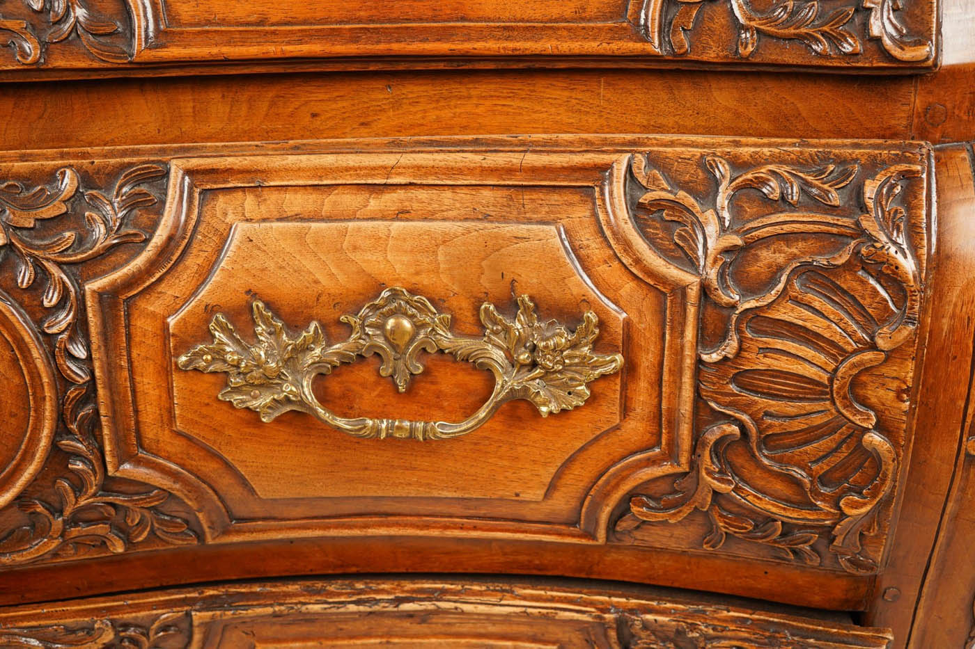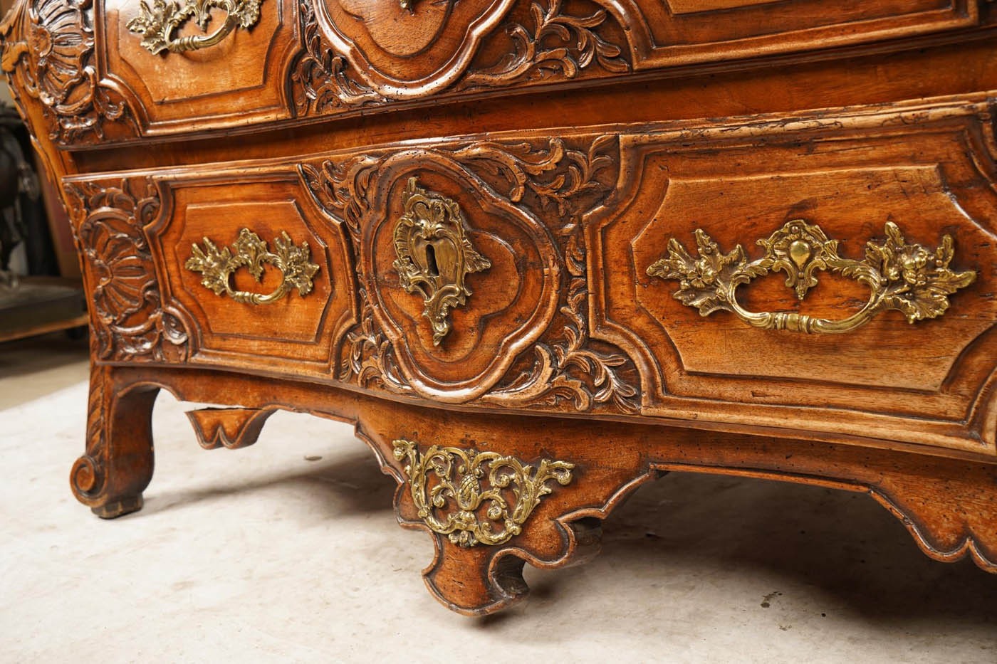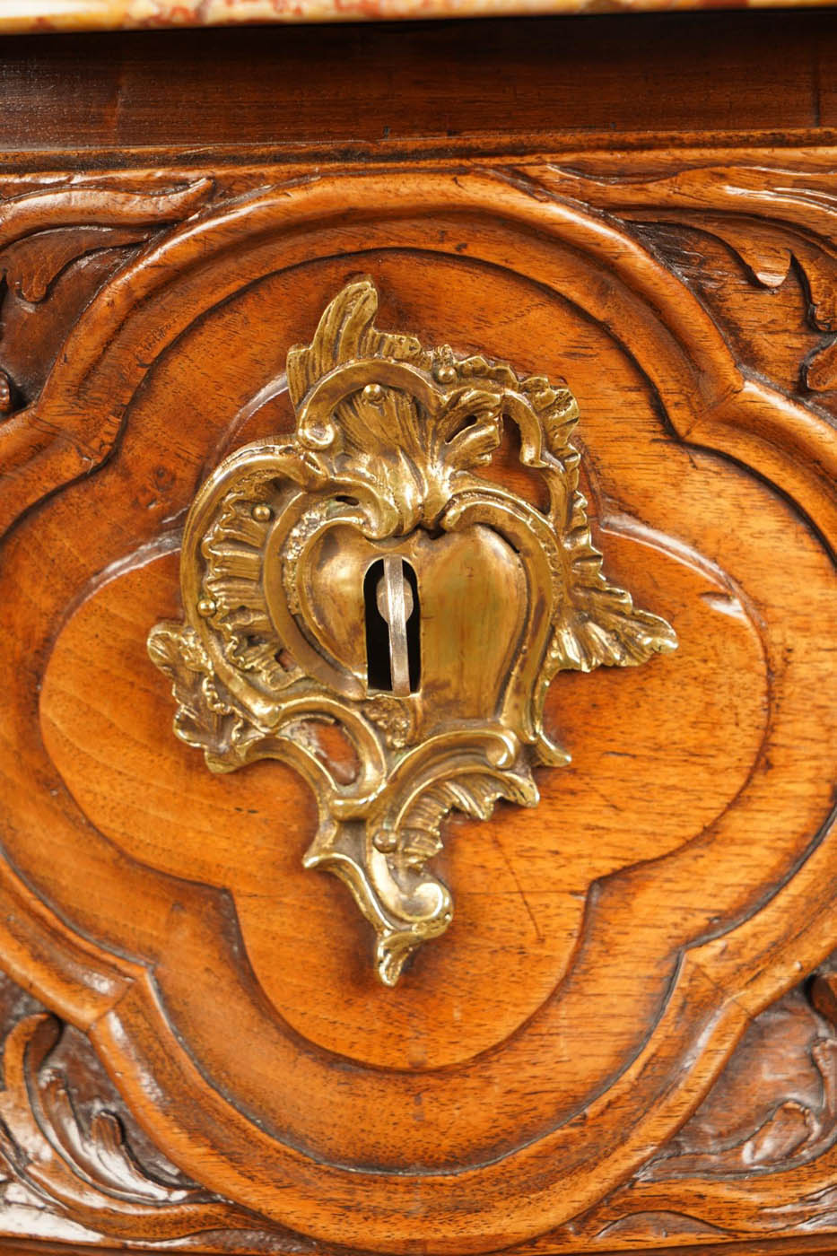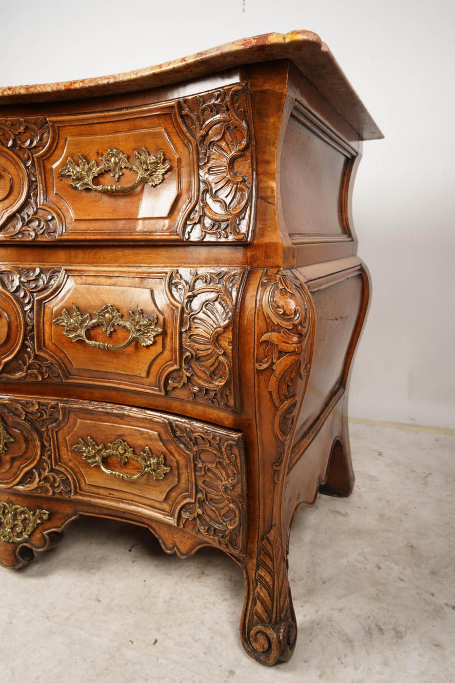 18th C French Regence marble top commode, c.1735, Breche d' Alep marble top) with serpentine front edge and three long drawers.