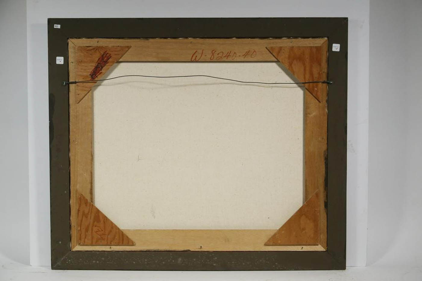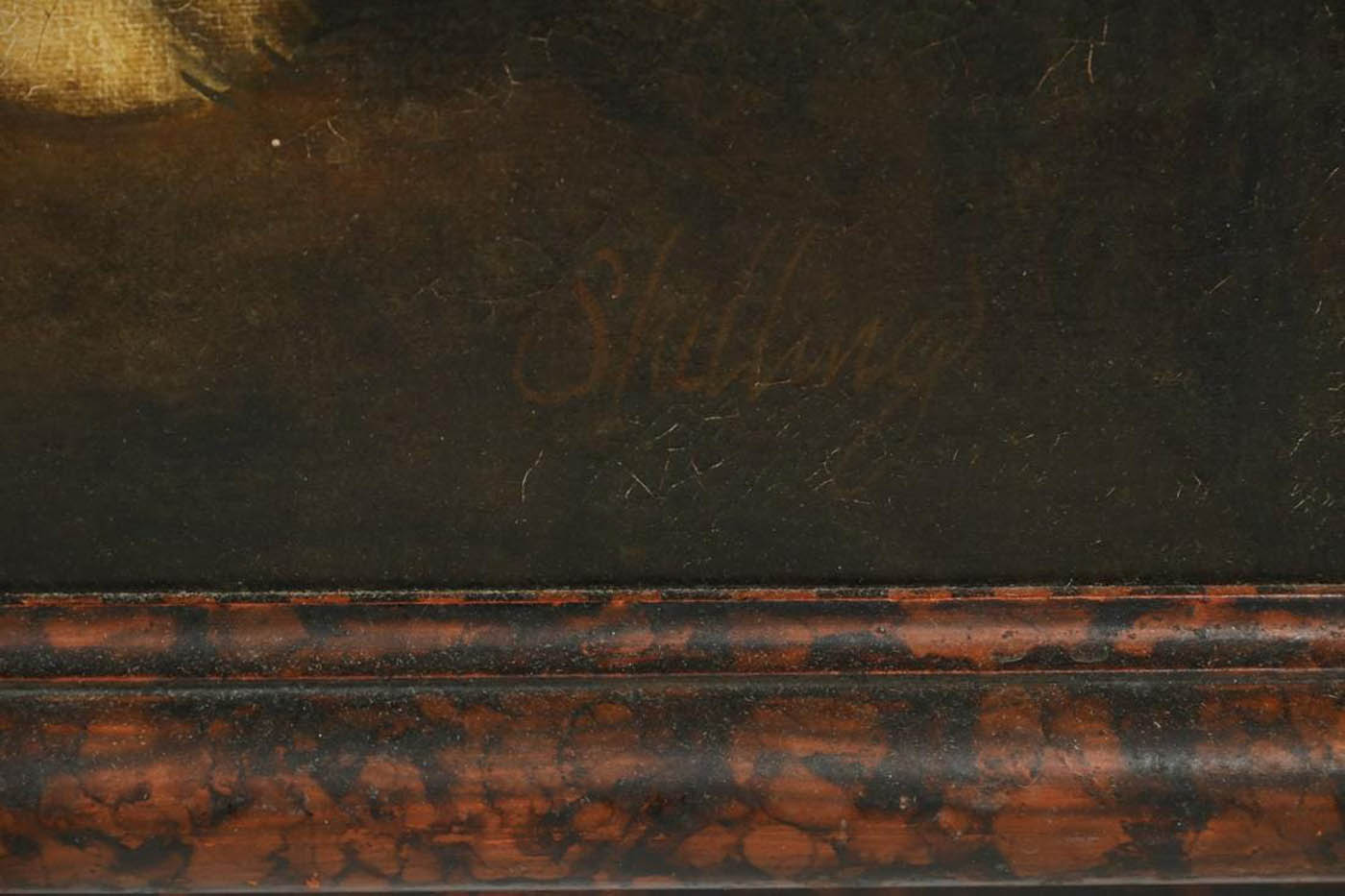 Acrylic on canvas painting of a fox hound by a New York art stable (a collective of artists working for a studio) to produce collections for sale. William Skilling (1862-1964) was an artist in the stable, as well as 15 other artists who worked on the projects/ collections together. The piece is signed on lower right and features the hallmark faux tortoise frame and antique paint finishes, artists such as Sherry Felix, innovated to create for this studio.
