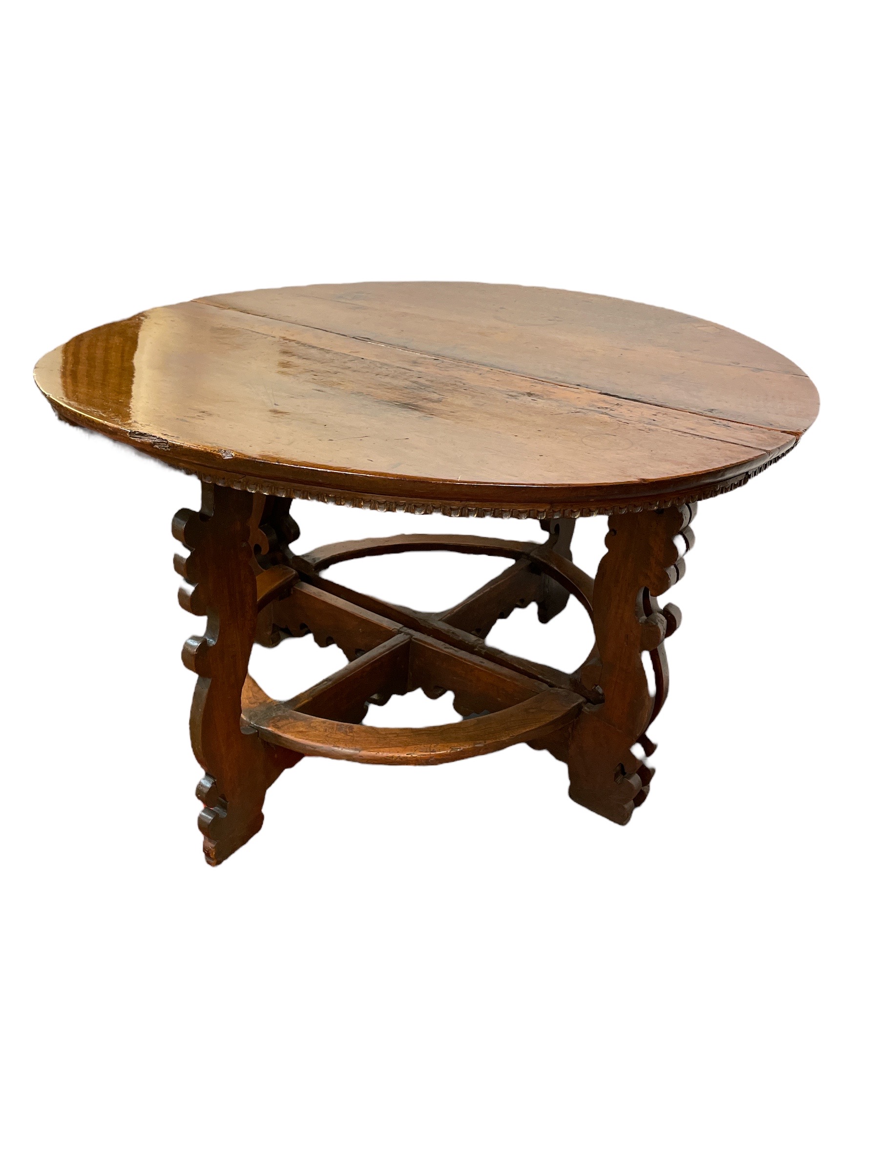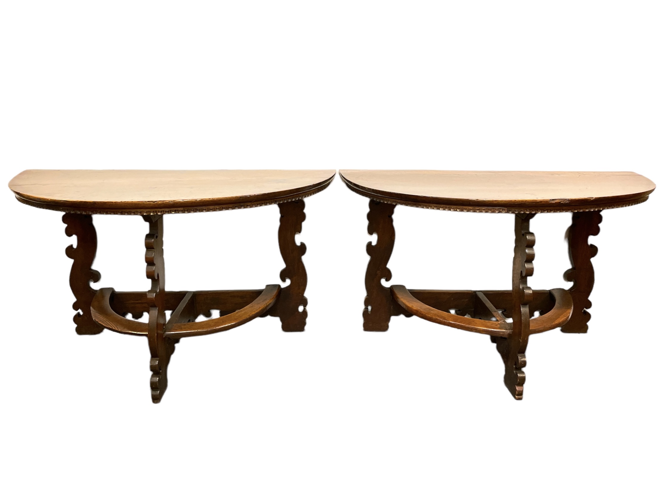 Pair of early 18th C Italian walnut demilune tables w/ thumbnail carving. Can be put things together to make a round center table.