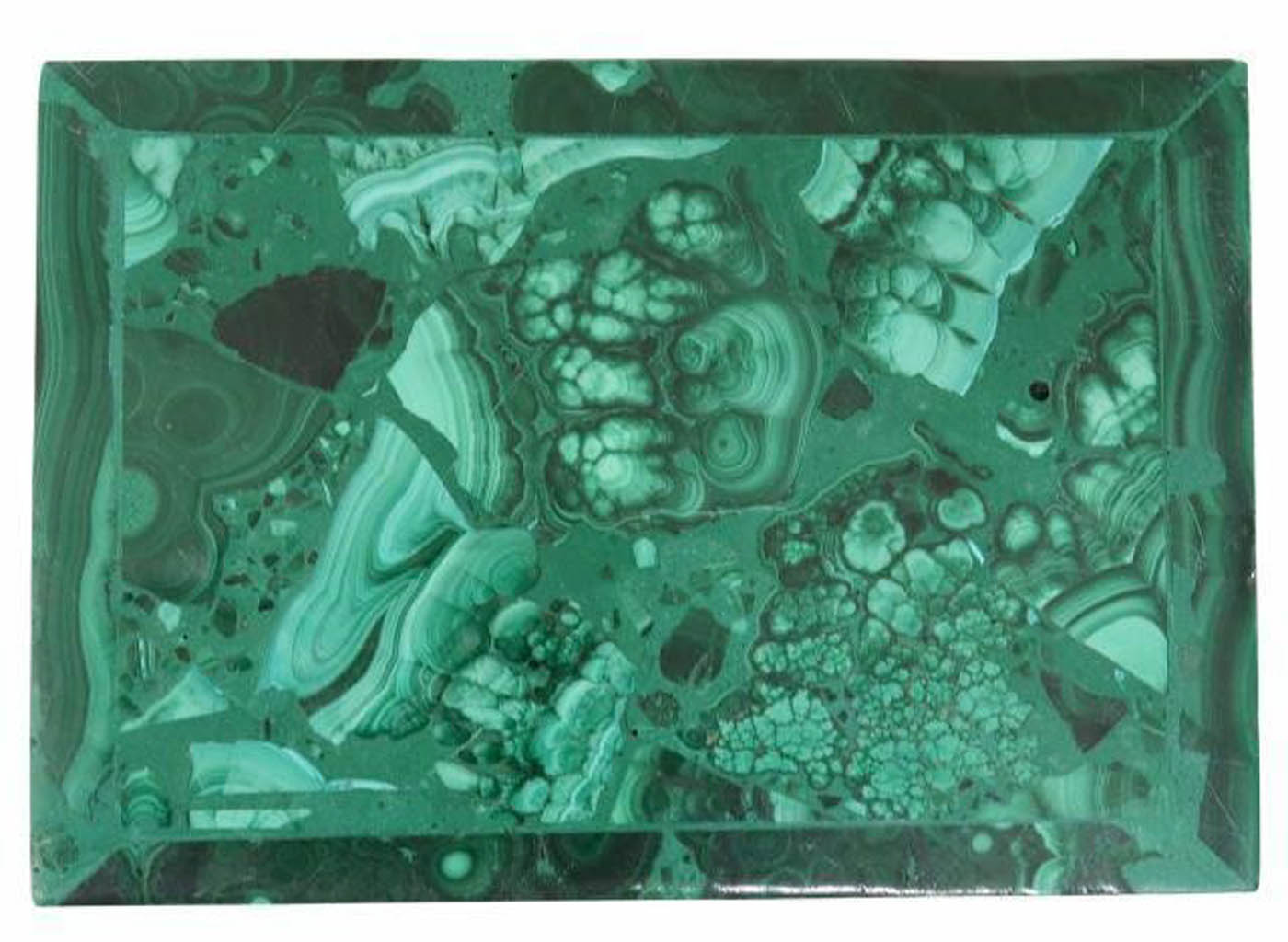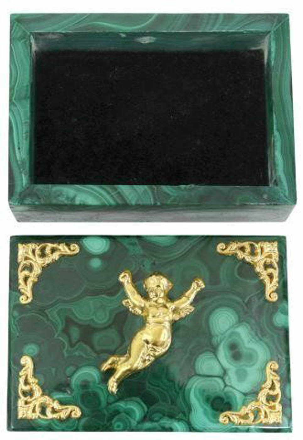 Gold ormolu mounted green malachite box w/ lid, featuring cupid and corner mounts.