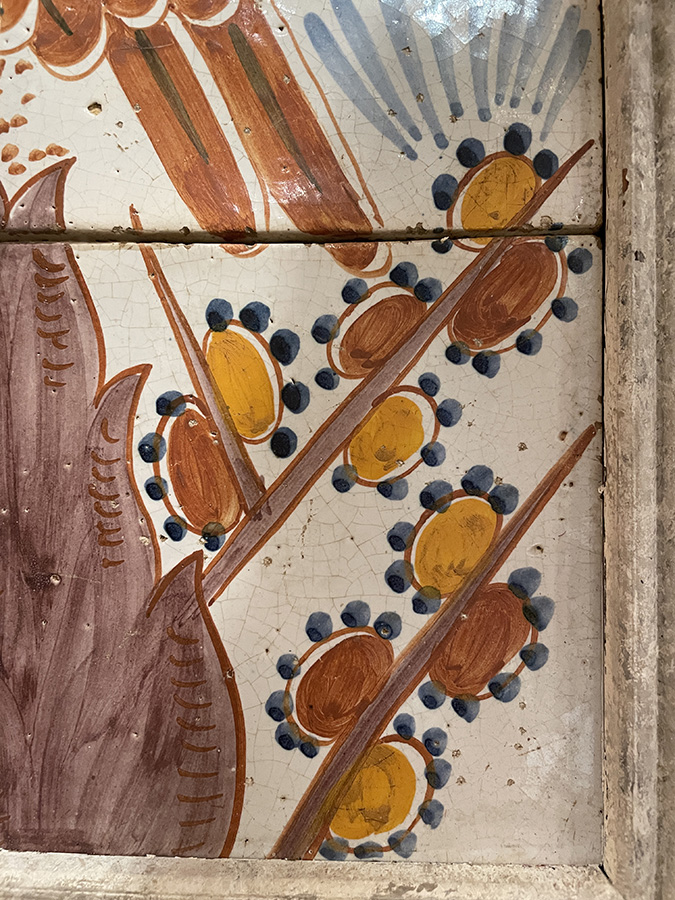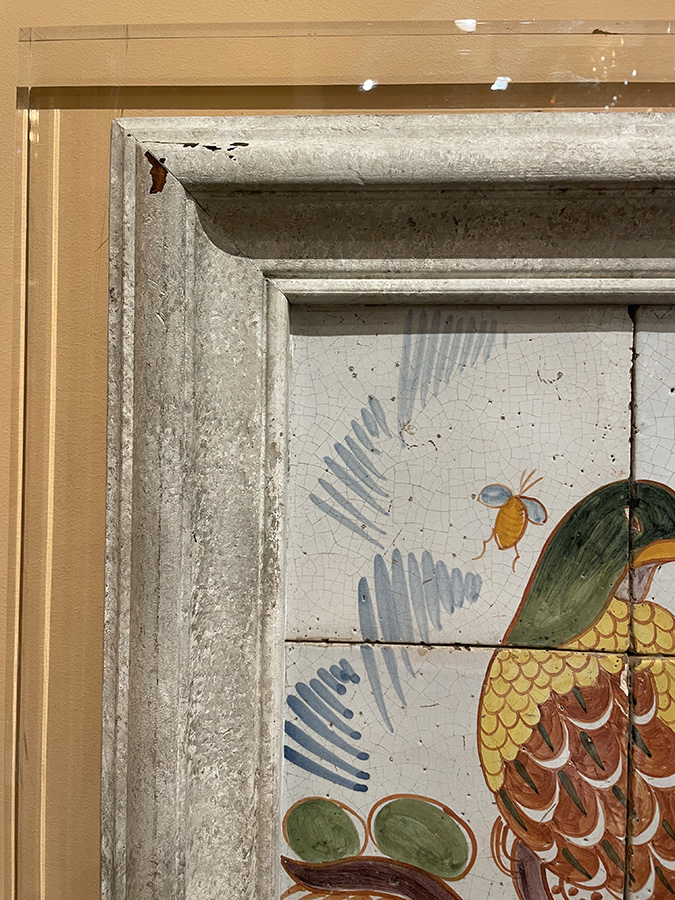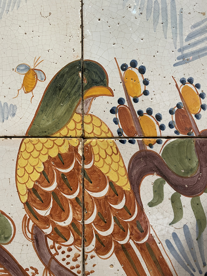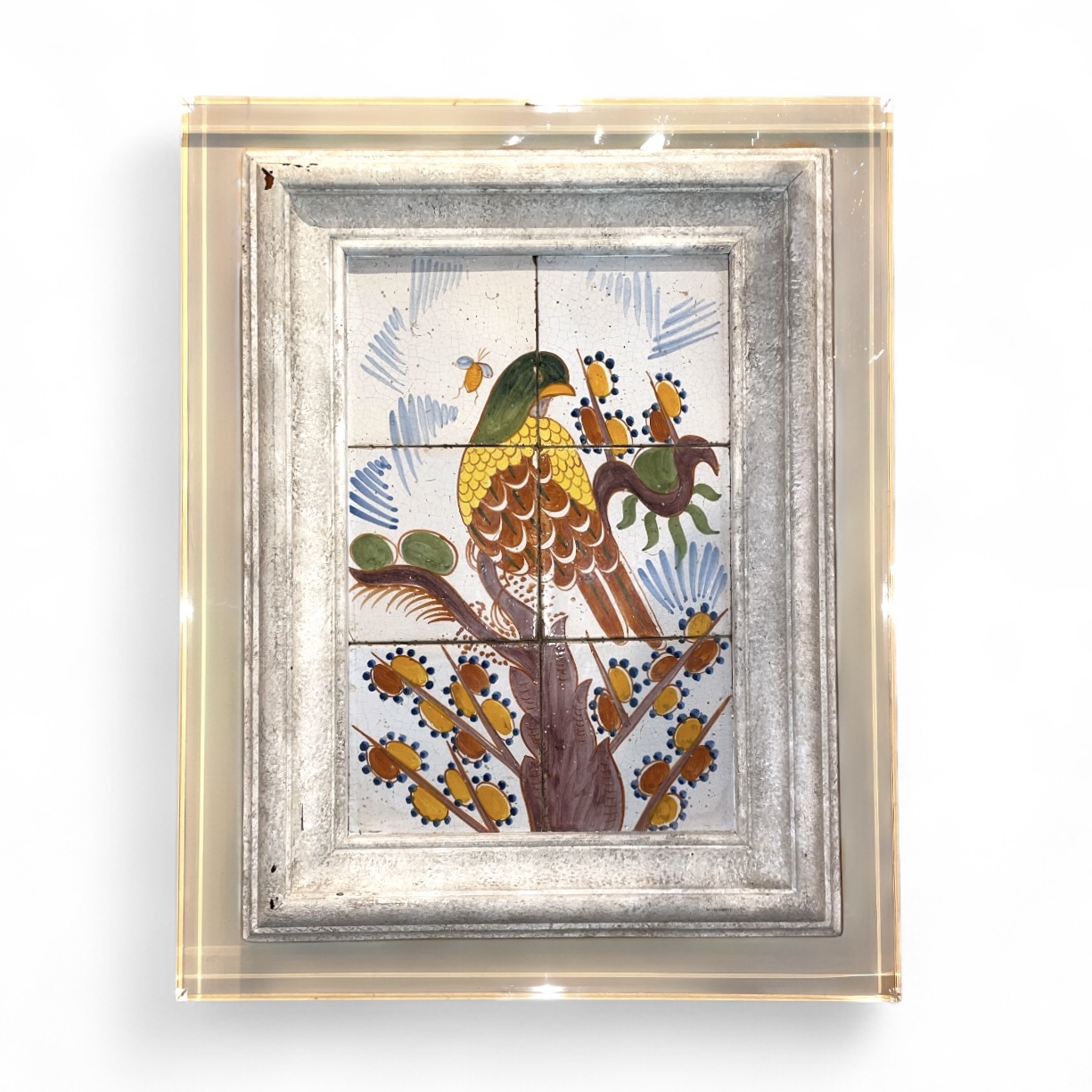 Dutch Delft polychrome tile panel of a parrot. Early 18th C. Six tile composition, depicting bird with insect, in yellow, green, manganese and cobalt hue glazes on tin-glazed ground. From the Caroline Faison Antiques Collectoin.