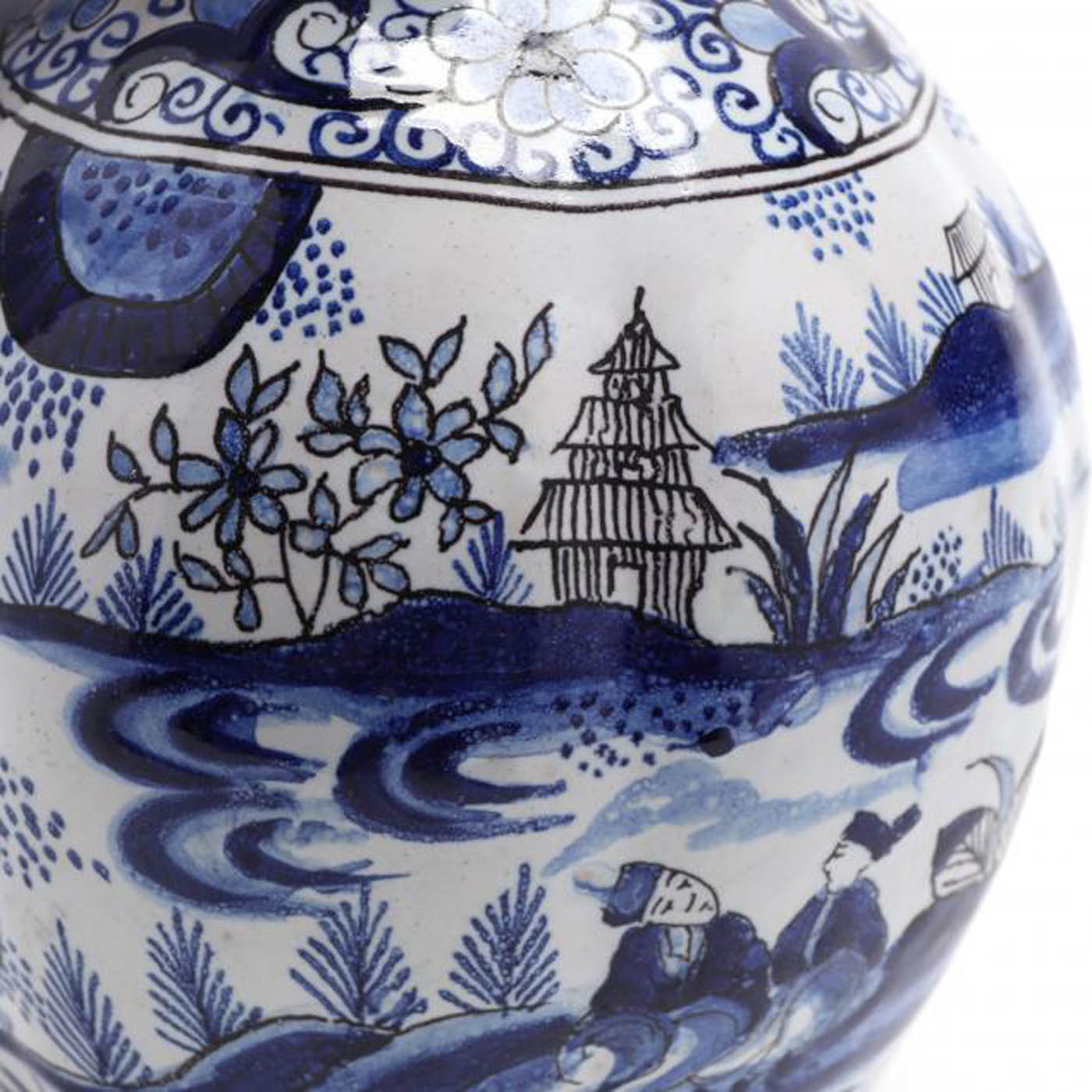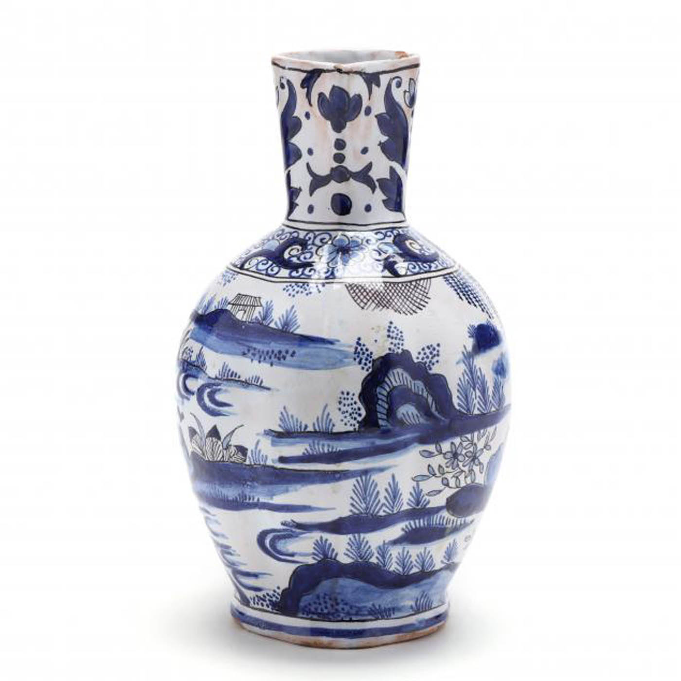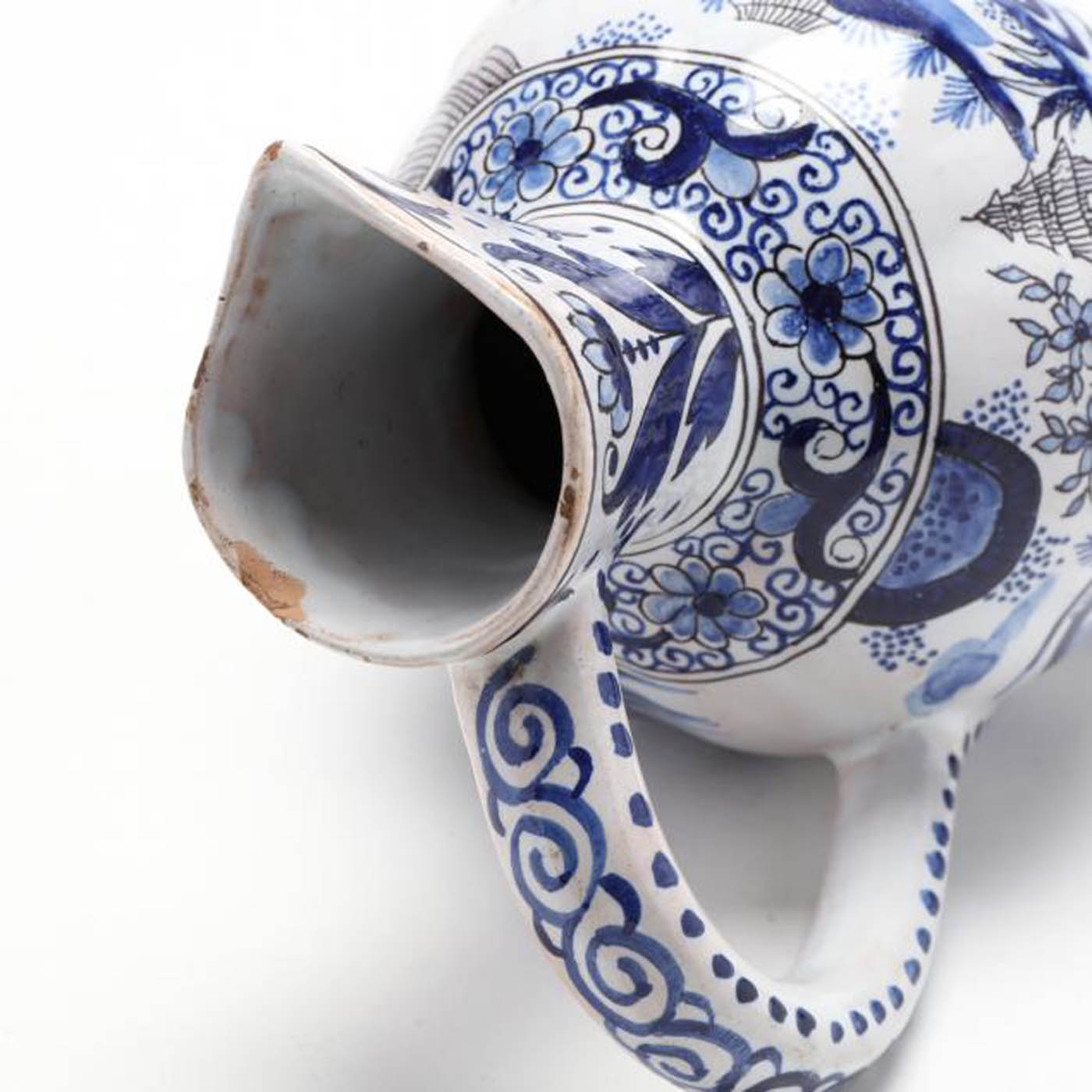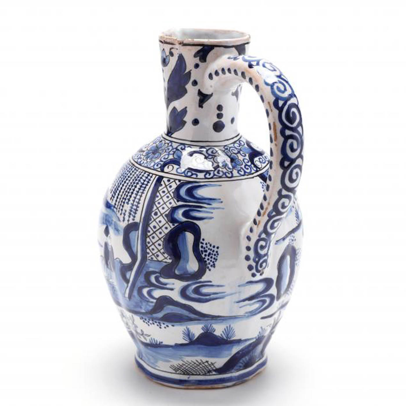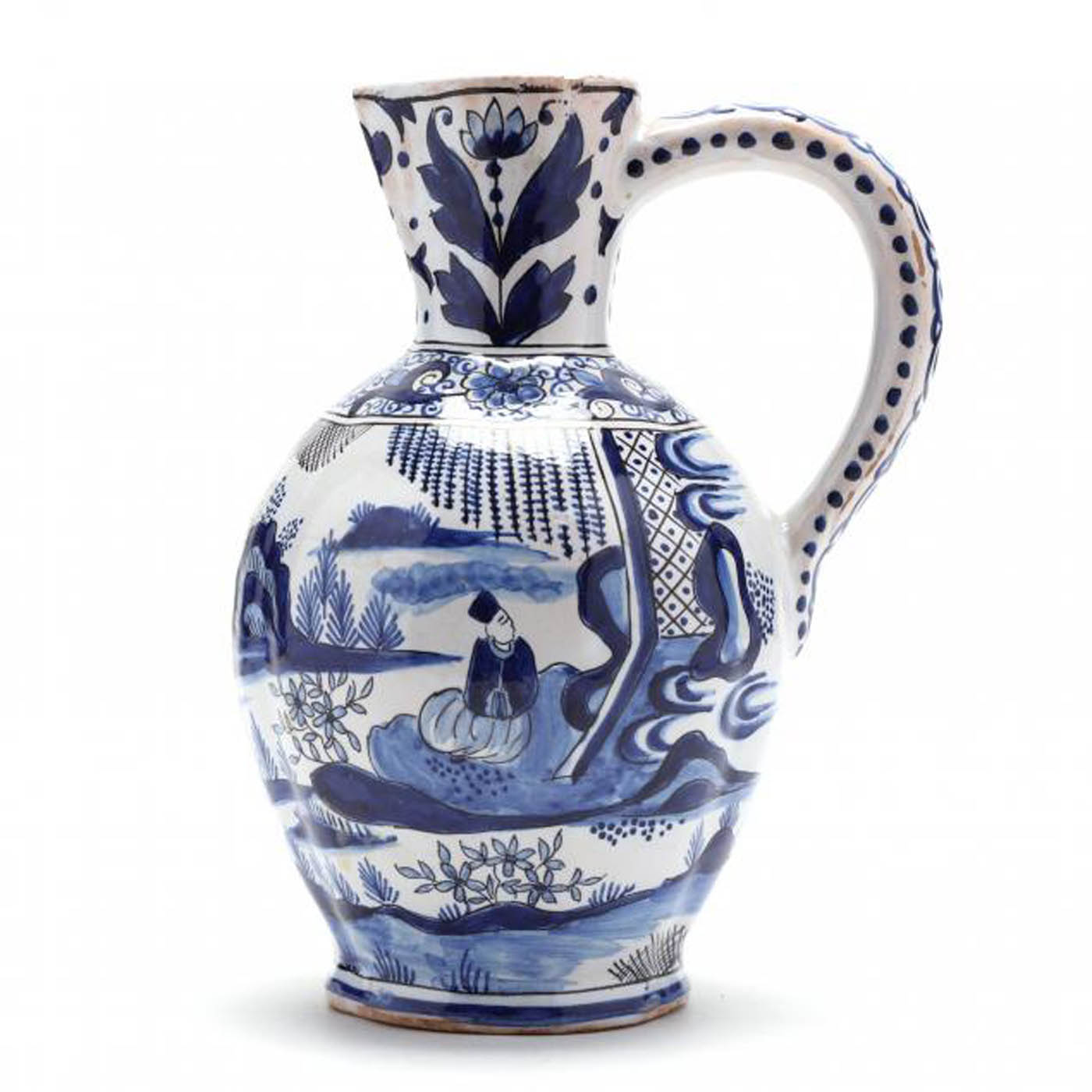 18th C Dutch Delft pitcher with chinoiserie waterscape and seated figures. Circa 1760-1780. Marked on underside with blue "APK", a mark used by Gerrit Brouwer at De Lampet Kan. From the Caroline Faison Antiques Collection. Minor chipping on rim.