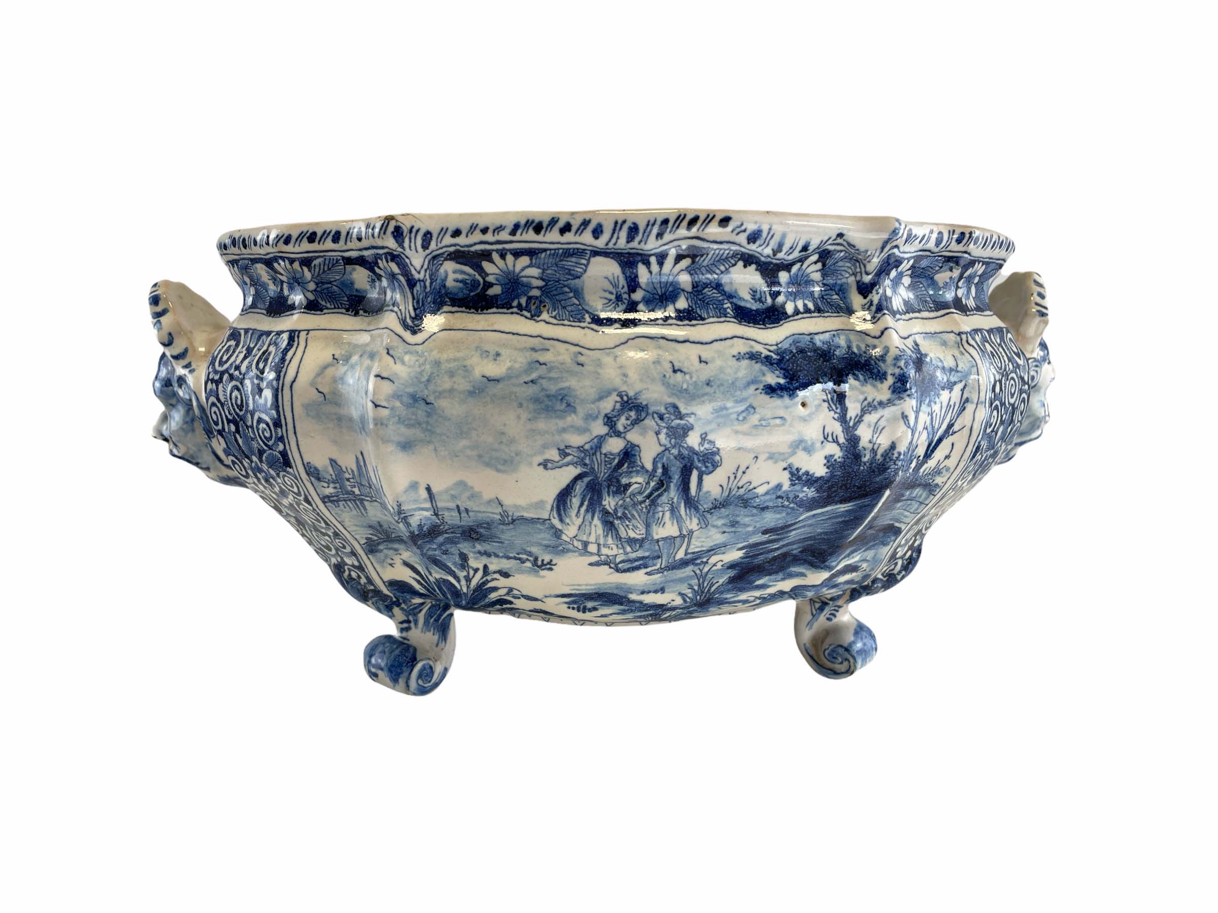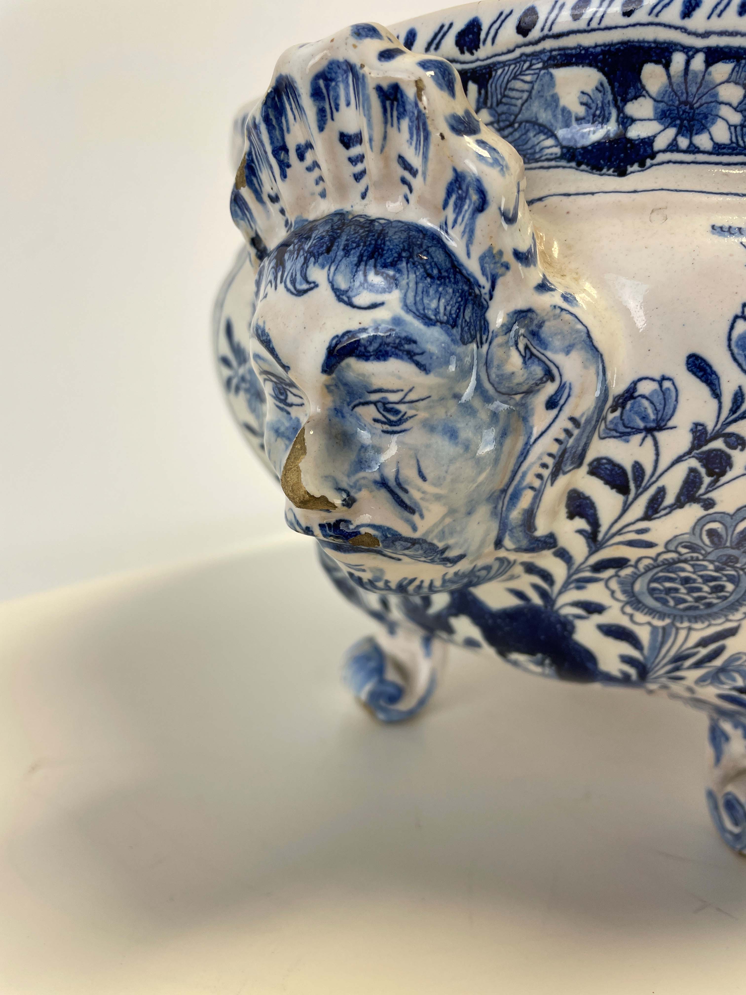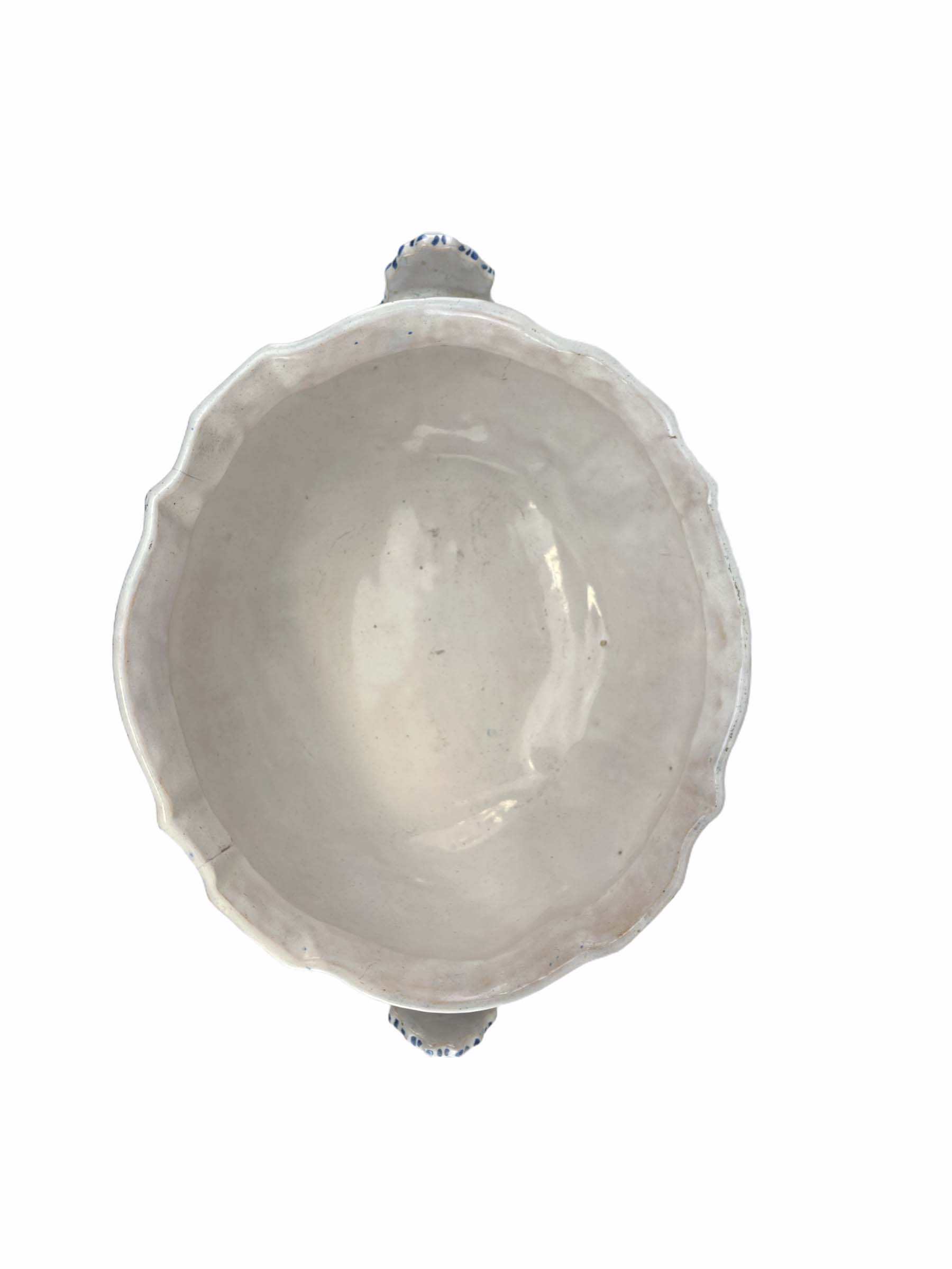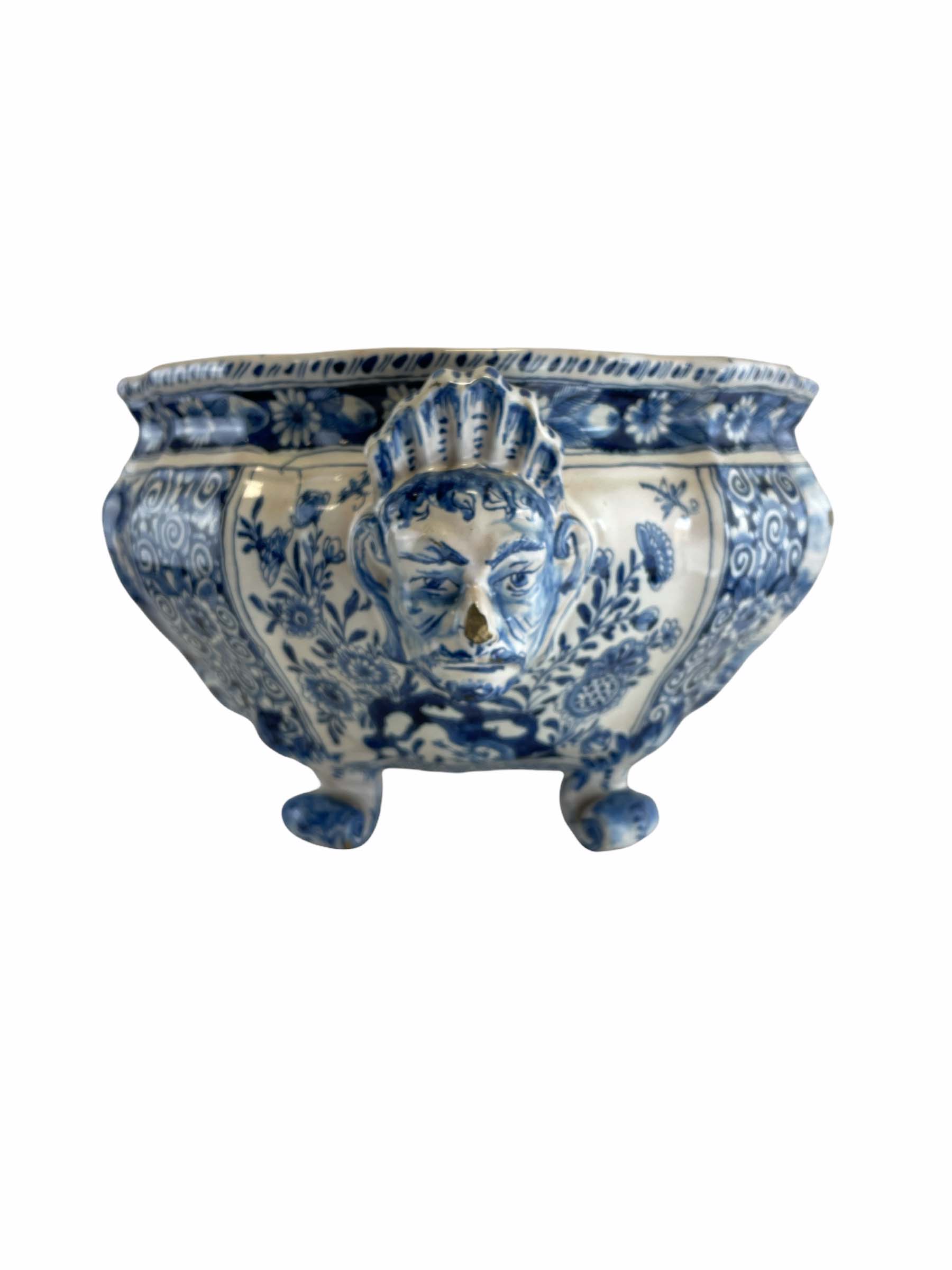 18th C Dutch Deft center bowl on scroll feet, marking underside of the base attributed to Albertus Kiell at the "De Witte Starre" workshop 1762-1774.