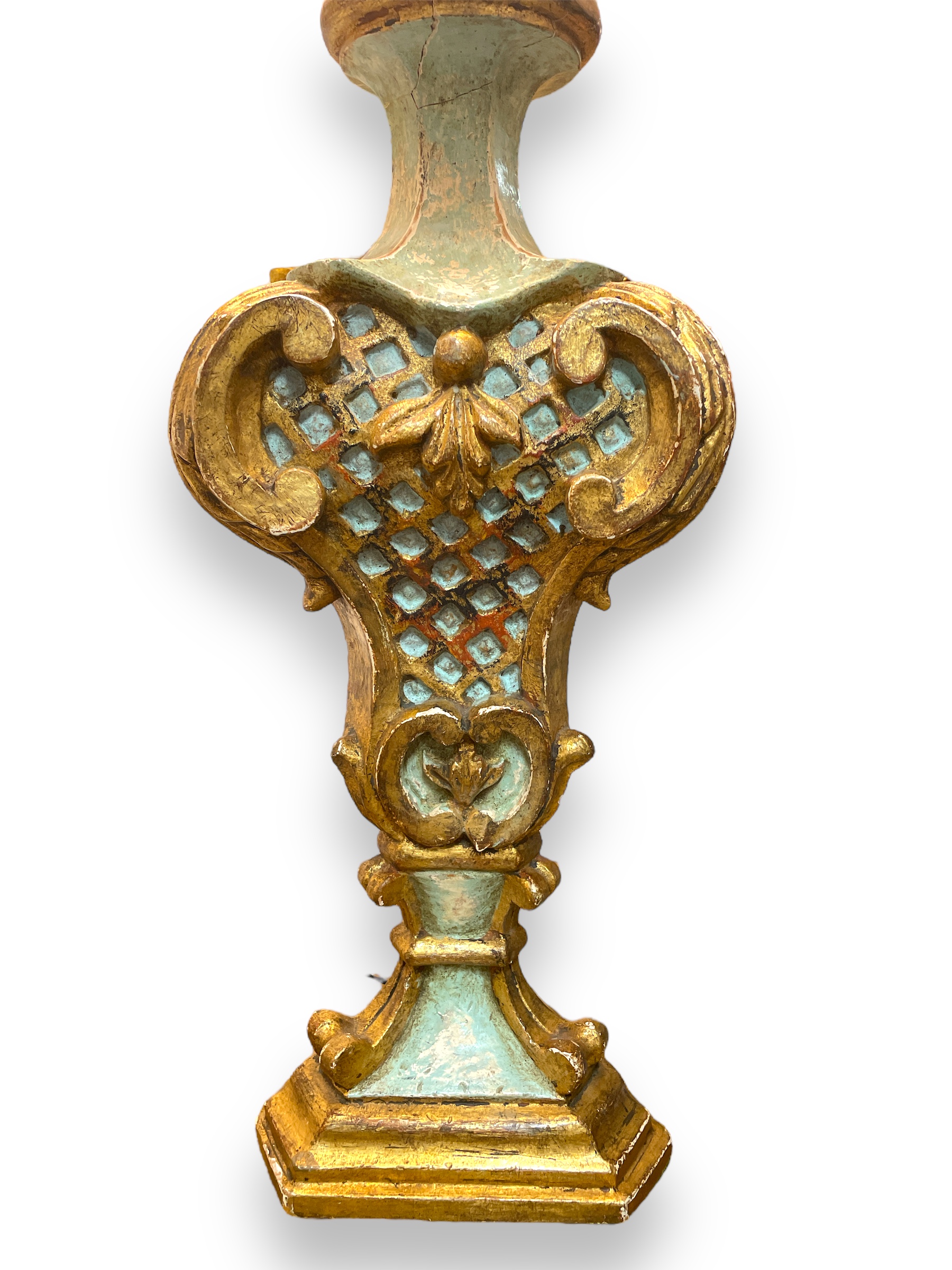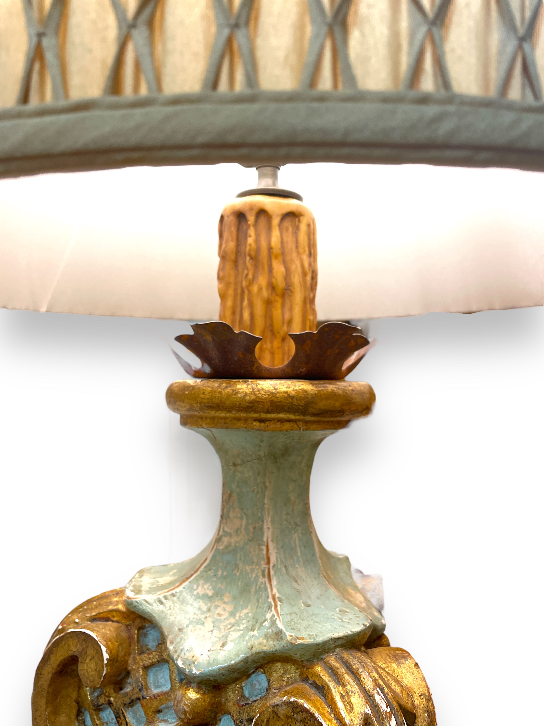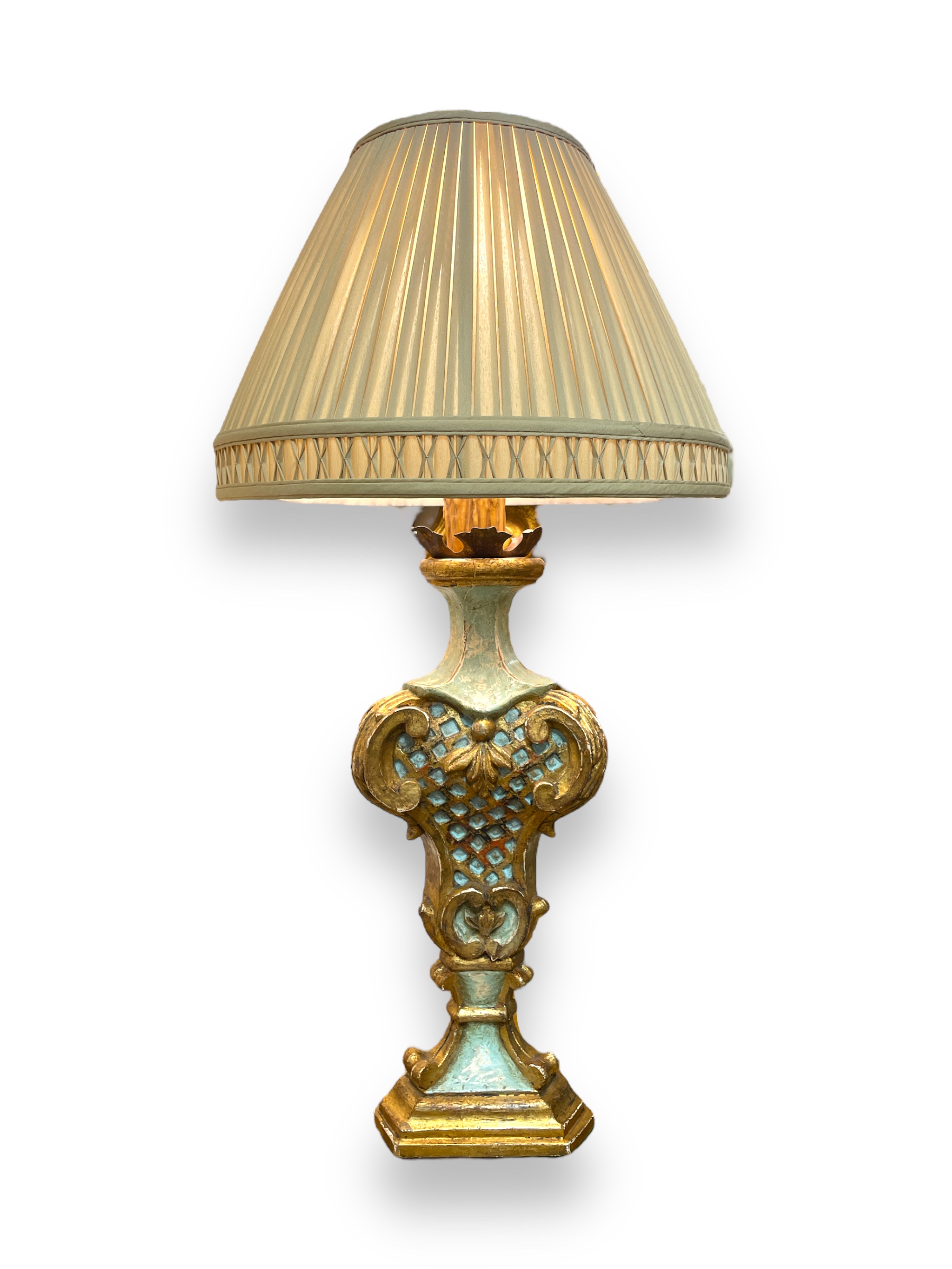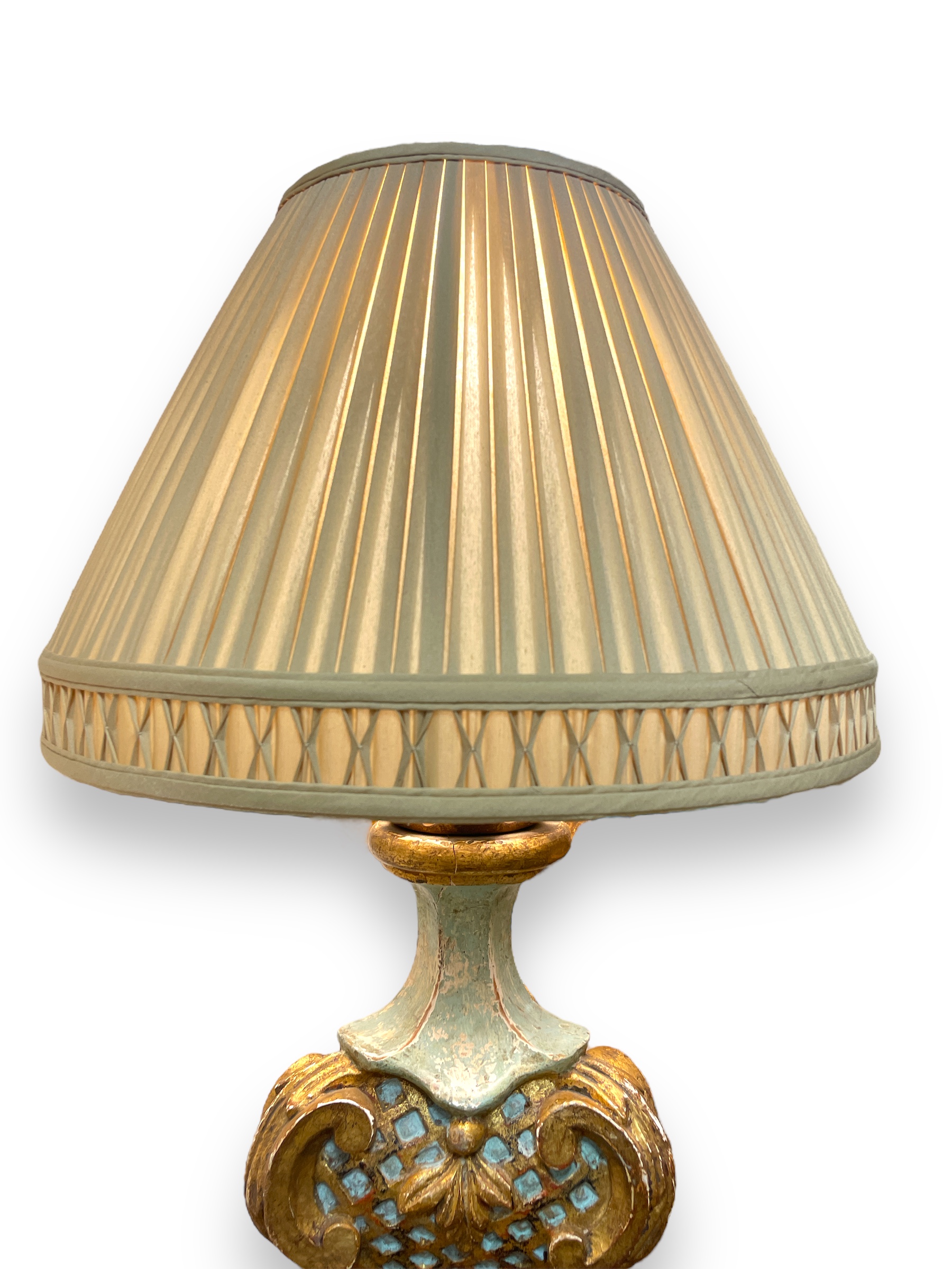 A painted and parcel gilt (blue & gold) lamp, Italian style w/ custom shade.