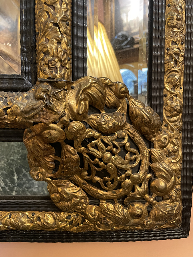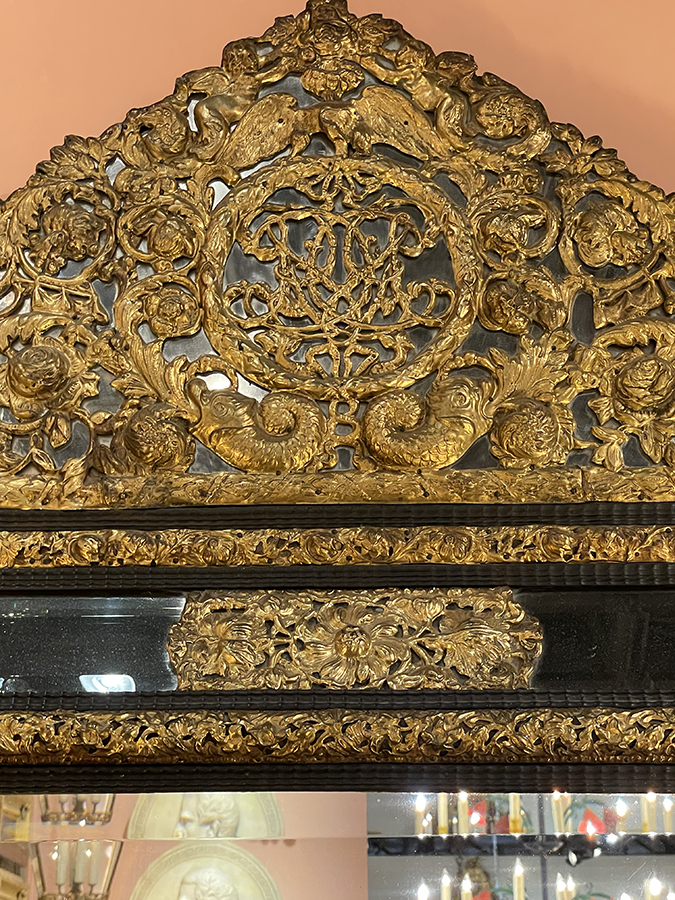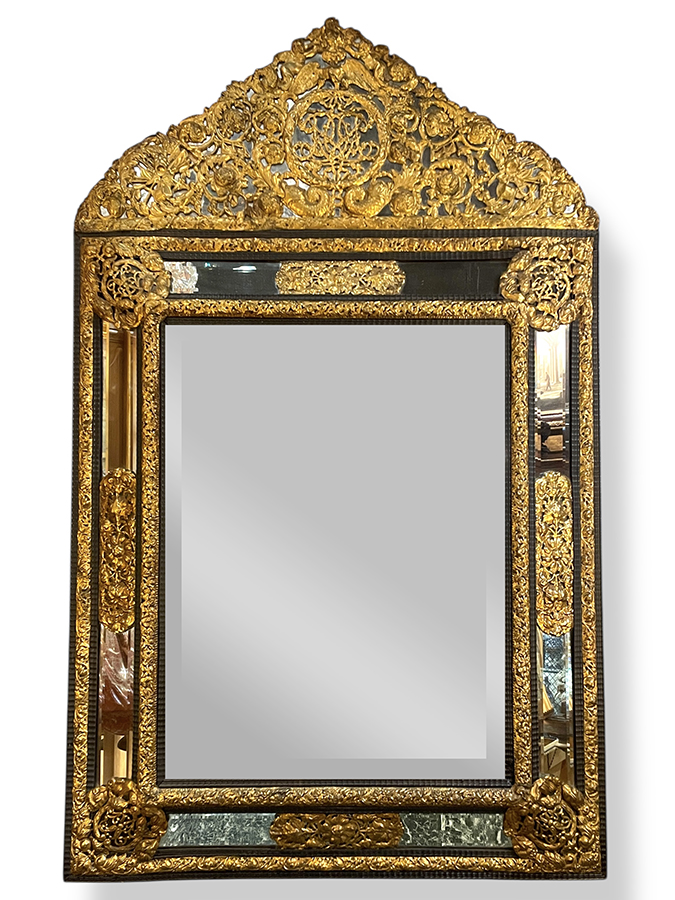 Large 19th C ornate brass cushion mirror w/ monogram decorated cornice and beveled mirror side panels.