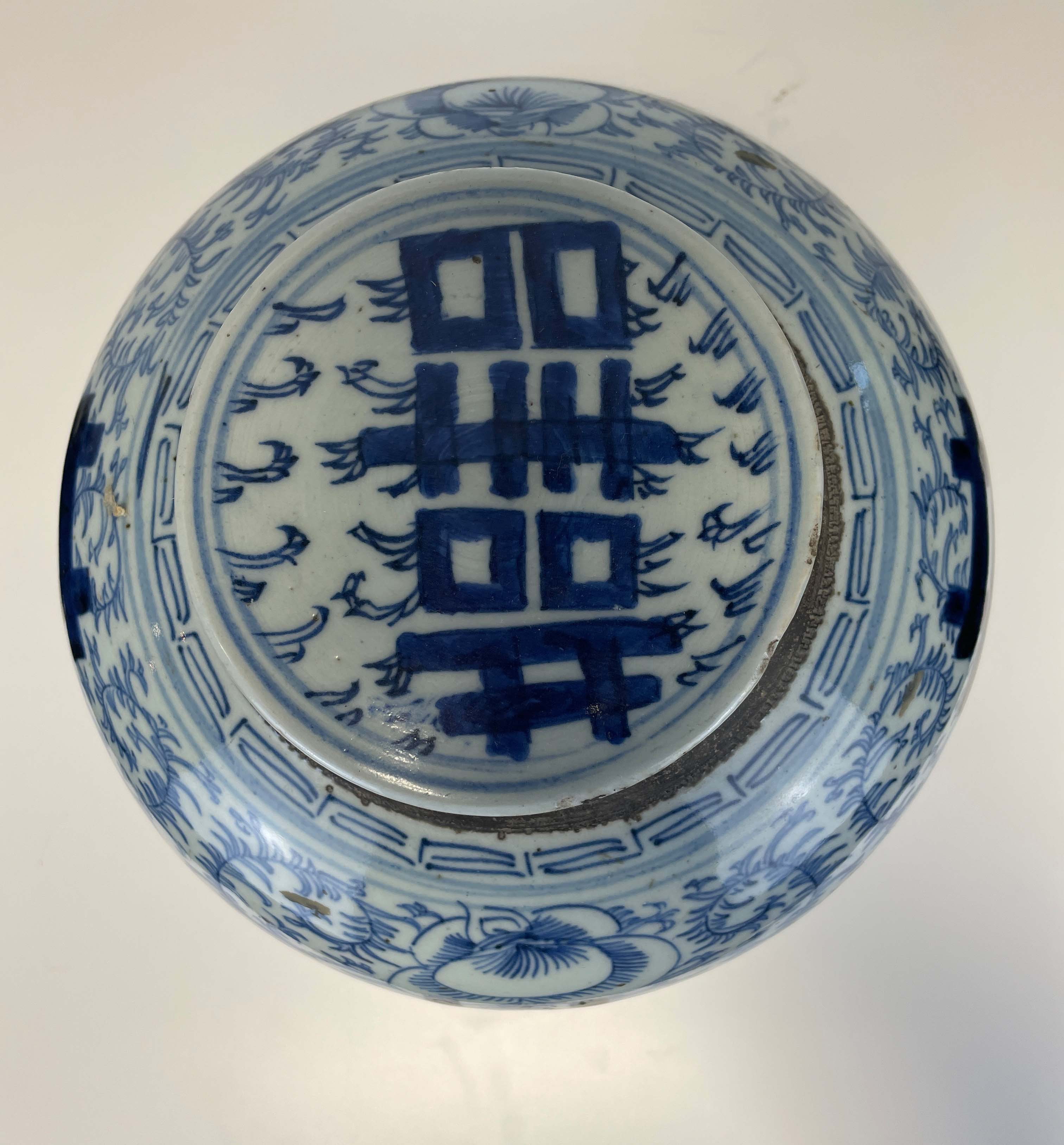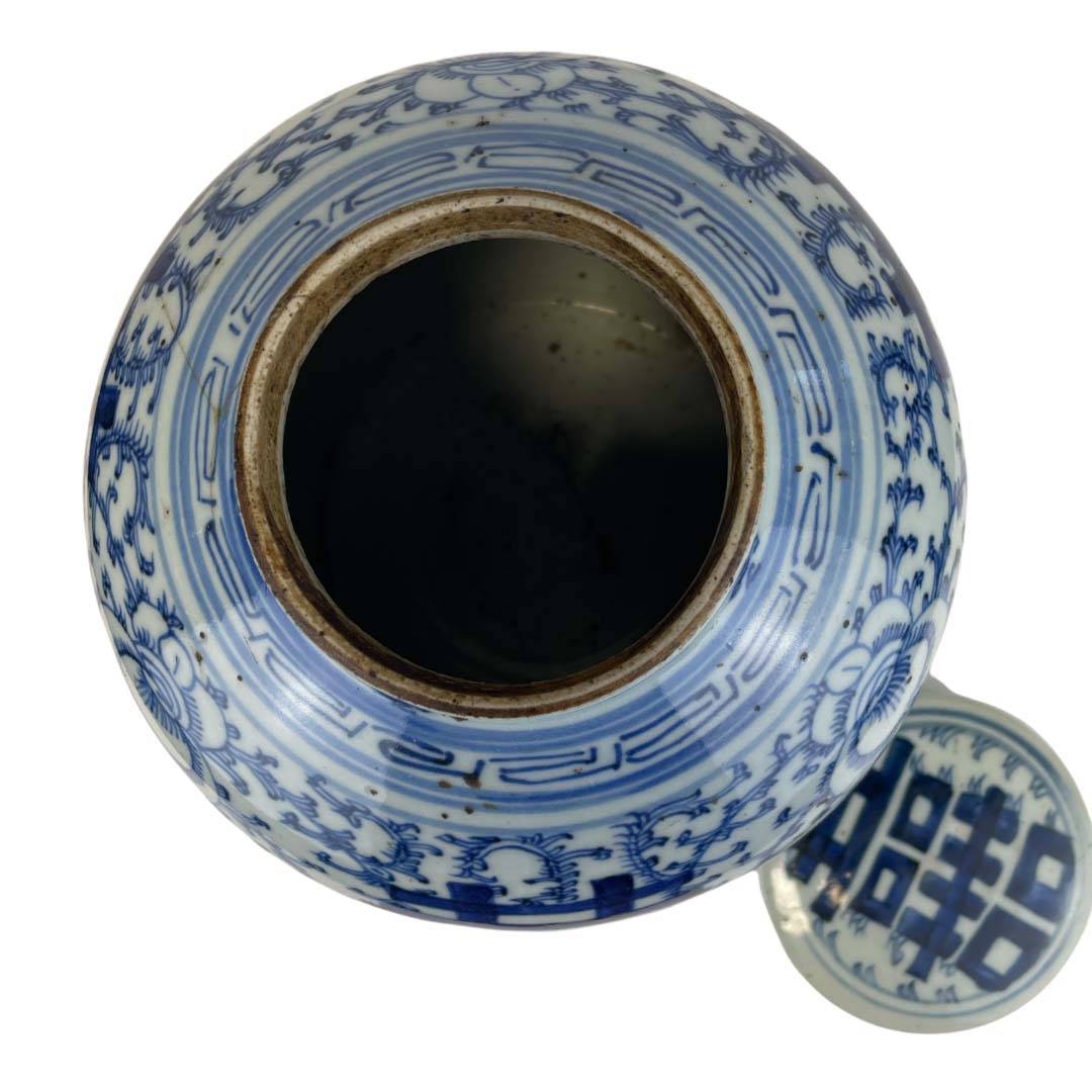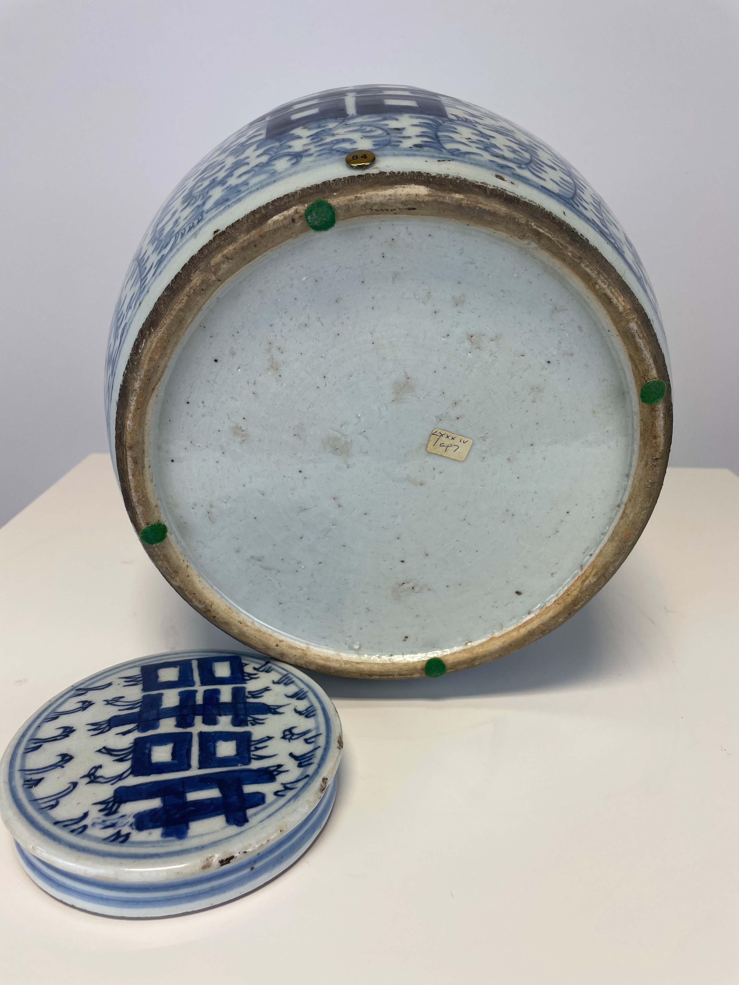 19th C Chinese blue and white lidded ginger jar decorated w/ signs of happiness.