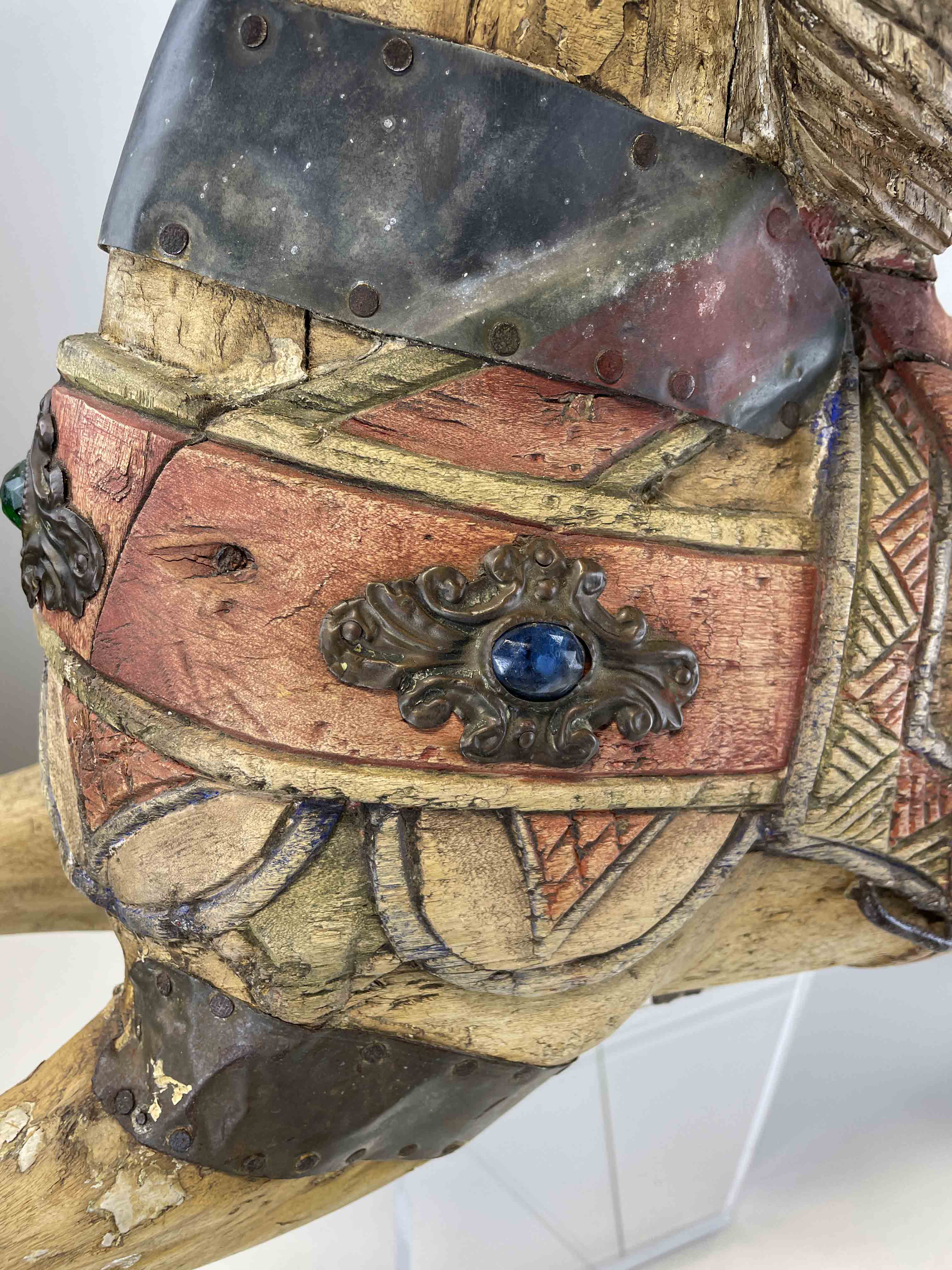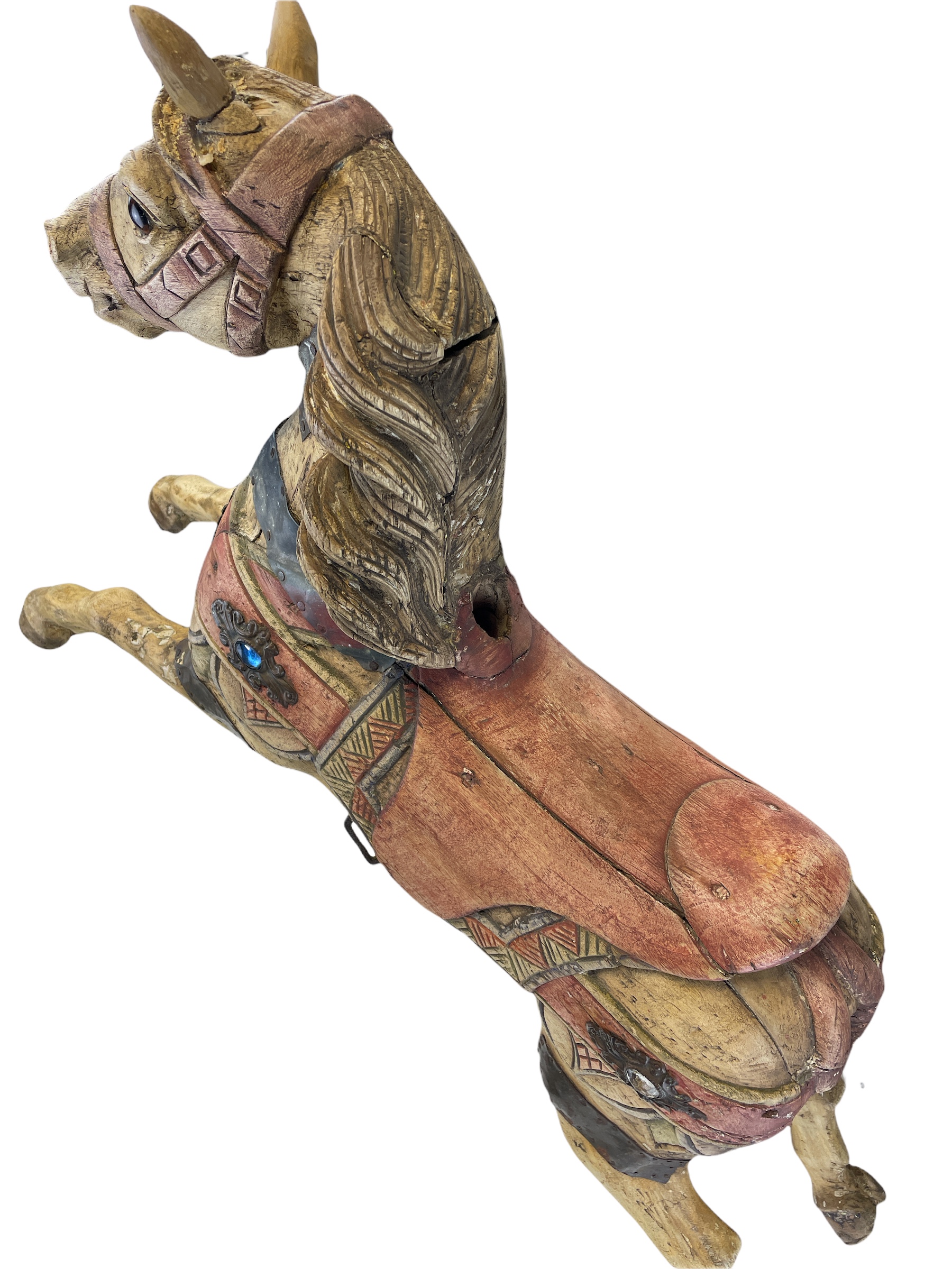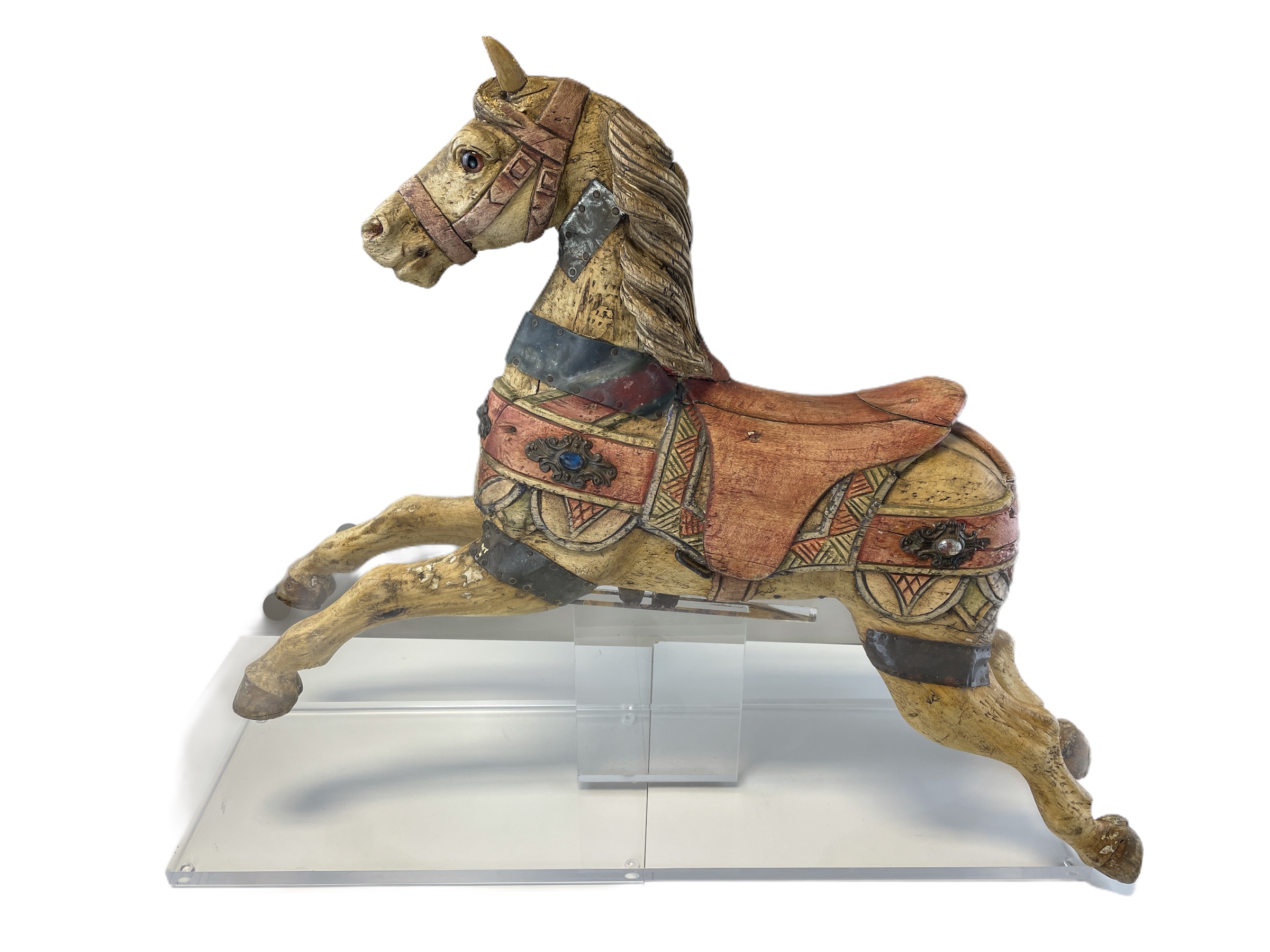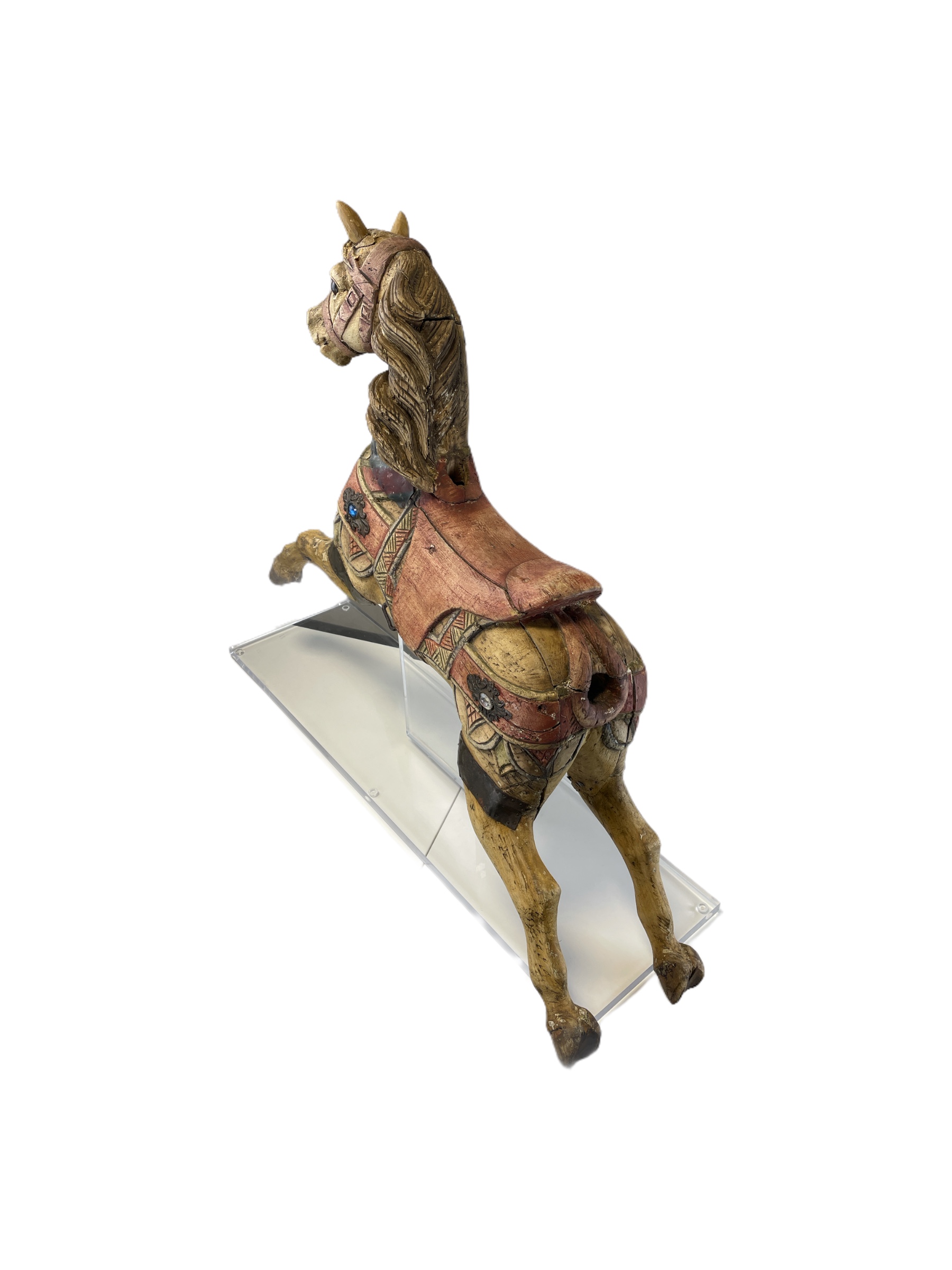 Carved wooden polychrome horse, perhaps from a child's carousel ride, mounted on acrylic base.