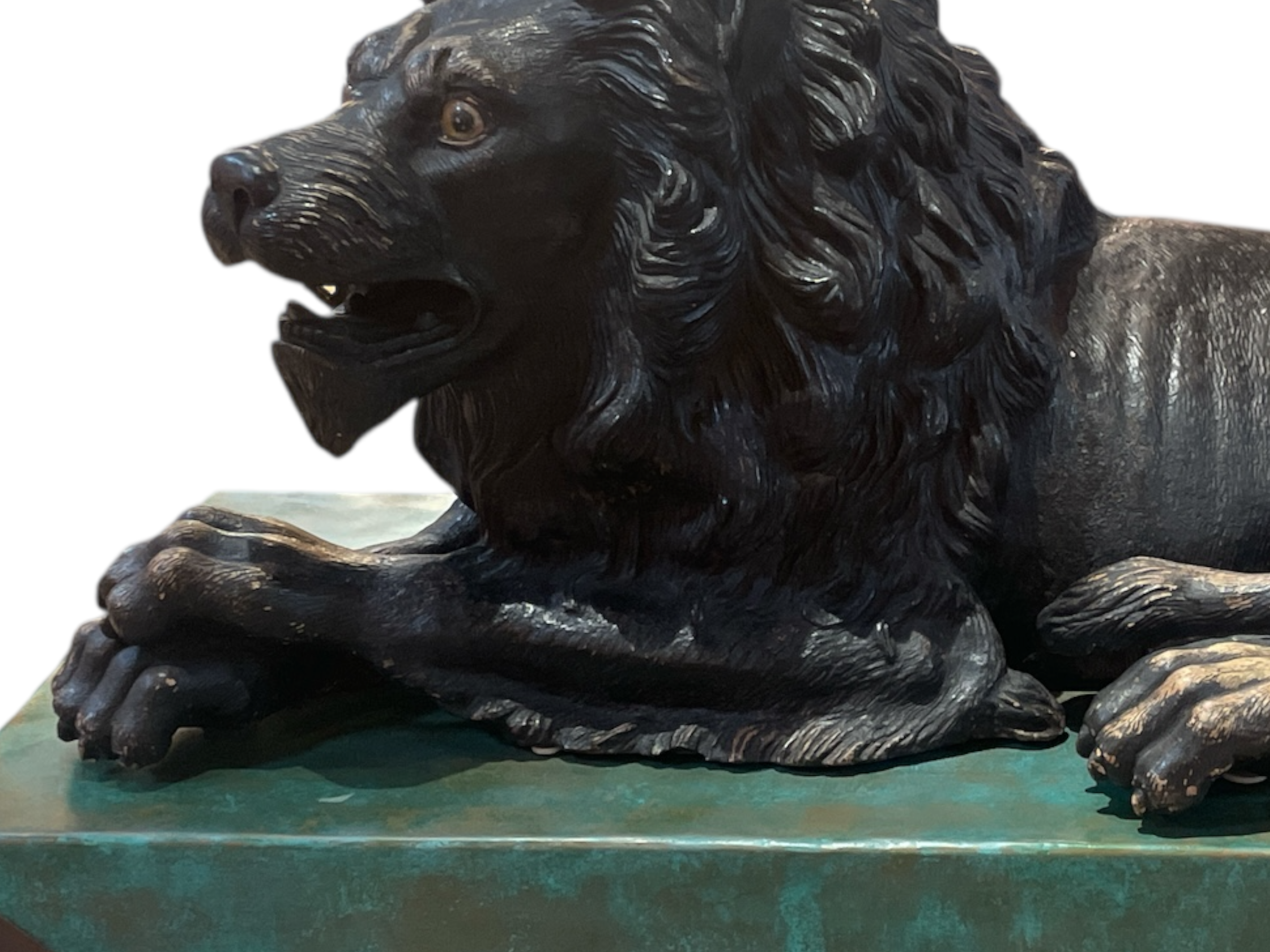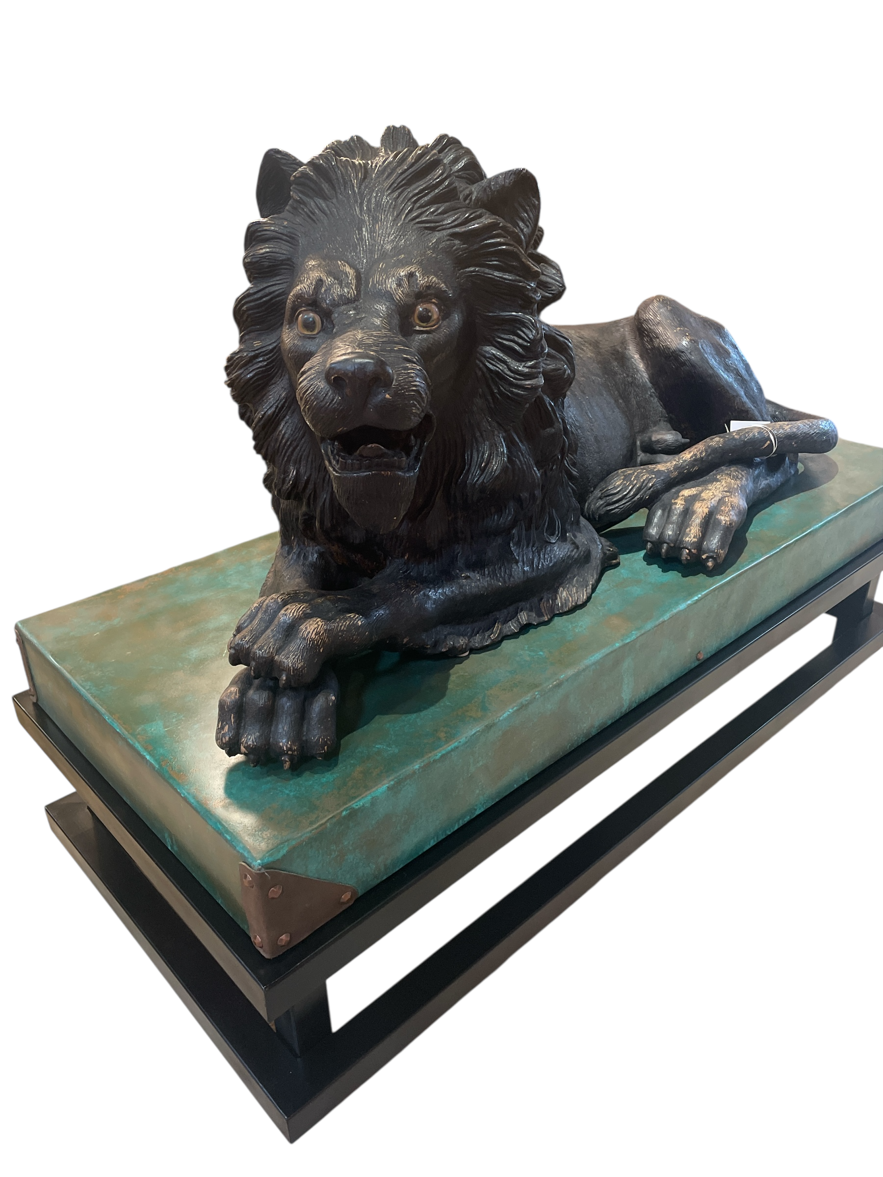 Large Italian 19th C terra cotta lion w/ glass eyes lying in the recumbent position with custom copper and steel stand.
