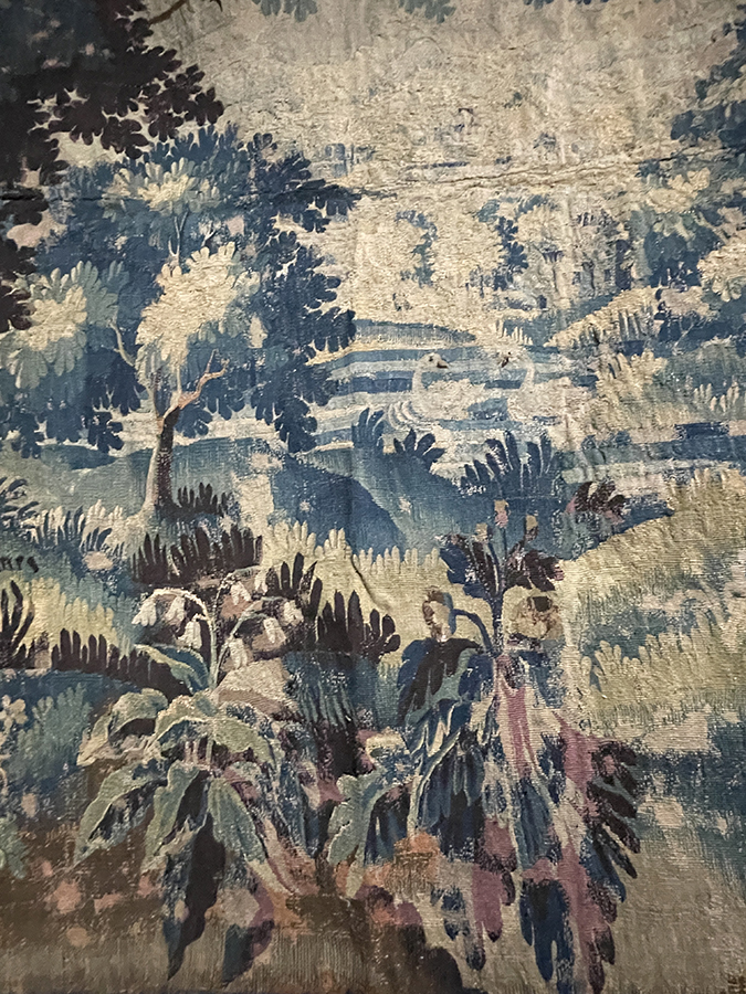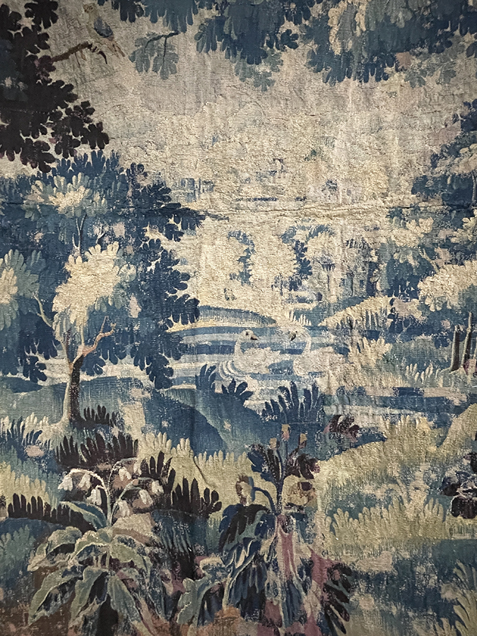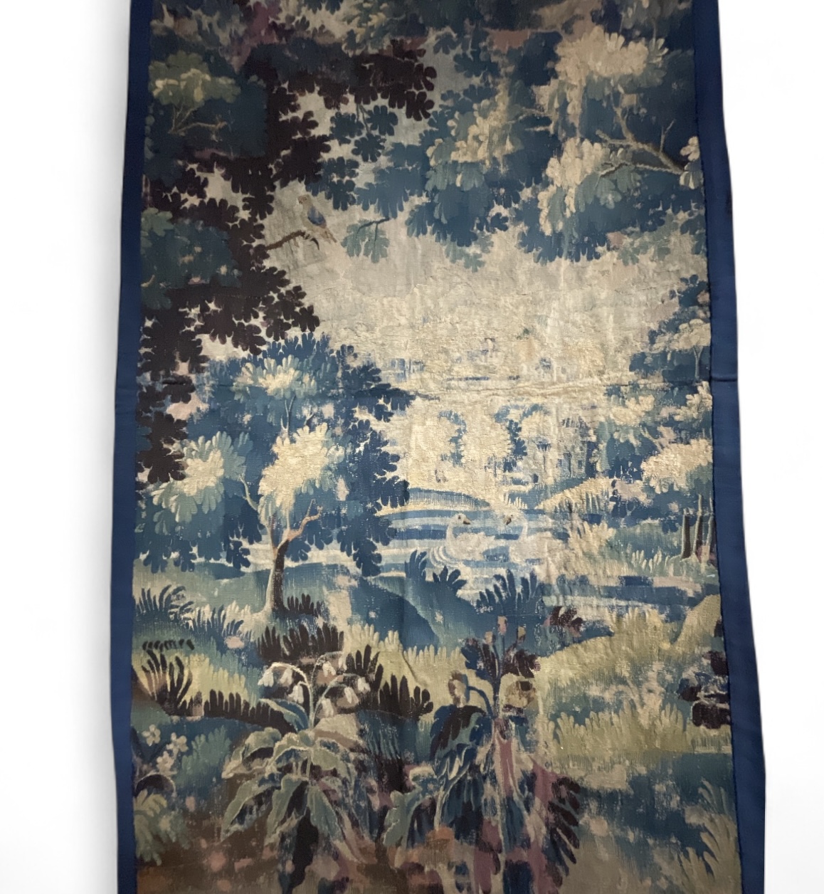 17th C Flemish verdue tapestry fragment (lined) of a pond scene with two swans swimming surrounded by lush vegetation.