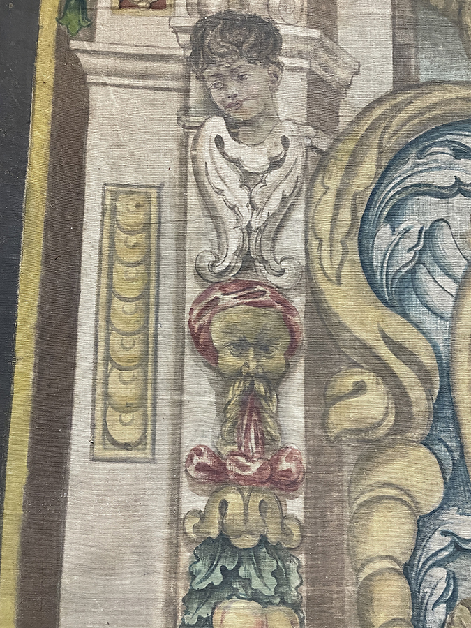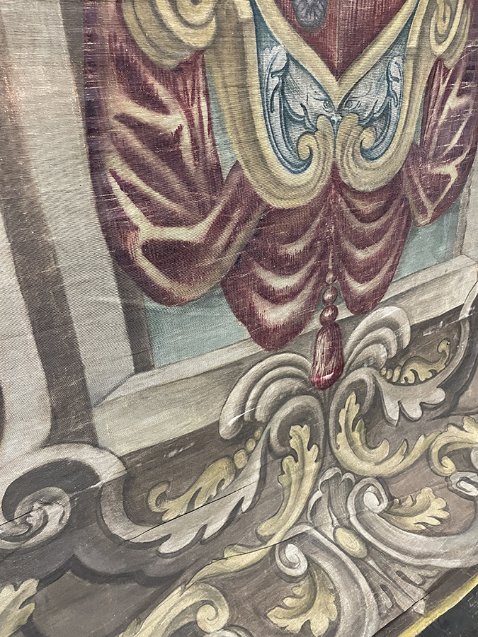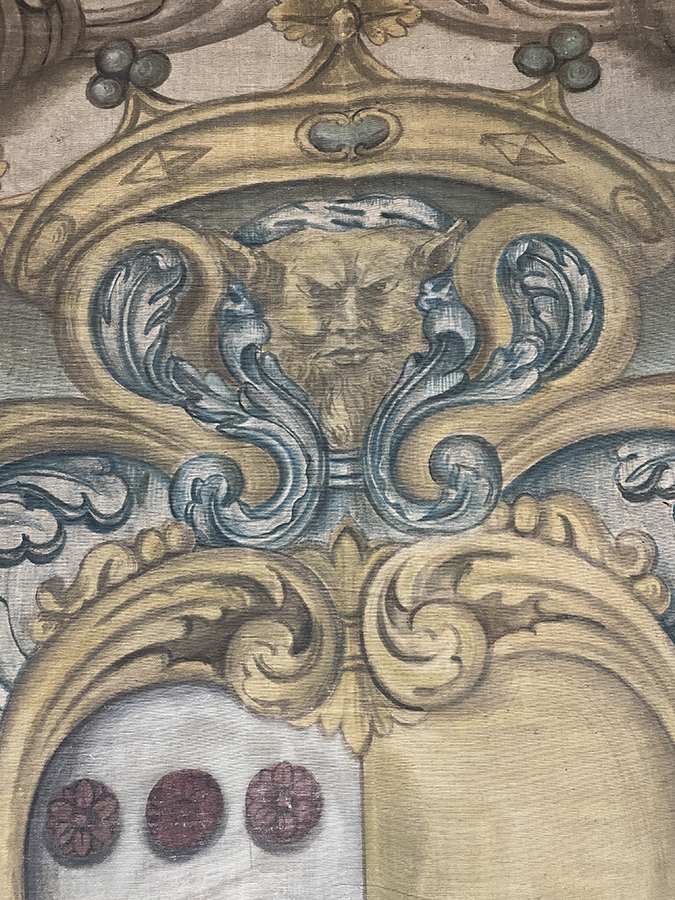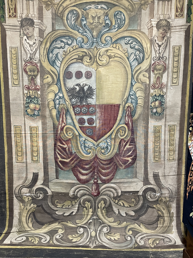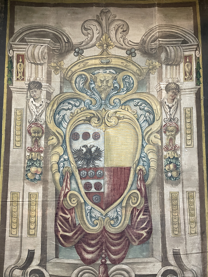 Hand Painted linen tapestry of an Italian family crest using the technique "succo d'erbo", "painted with herb", from Florence, Italy, c.1750.