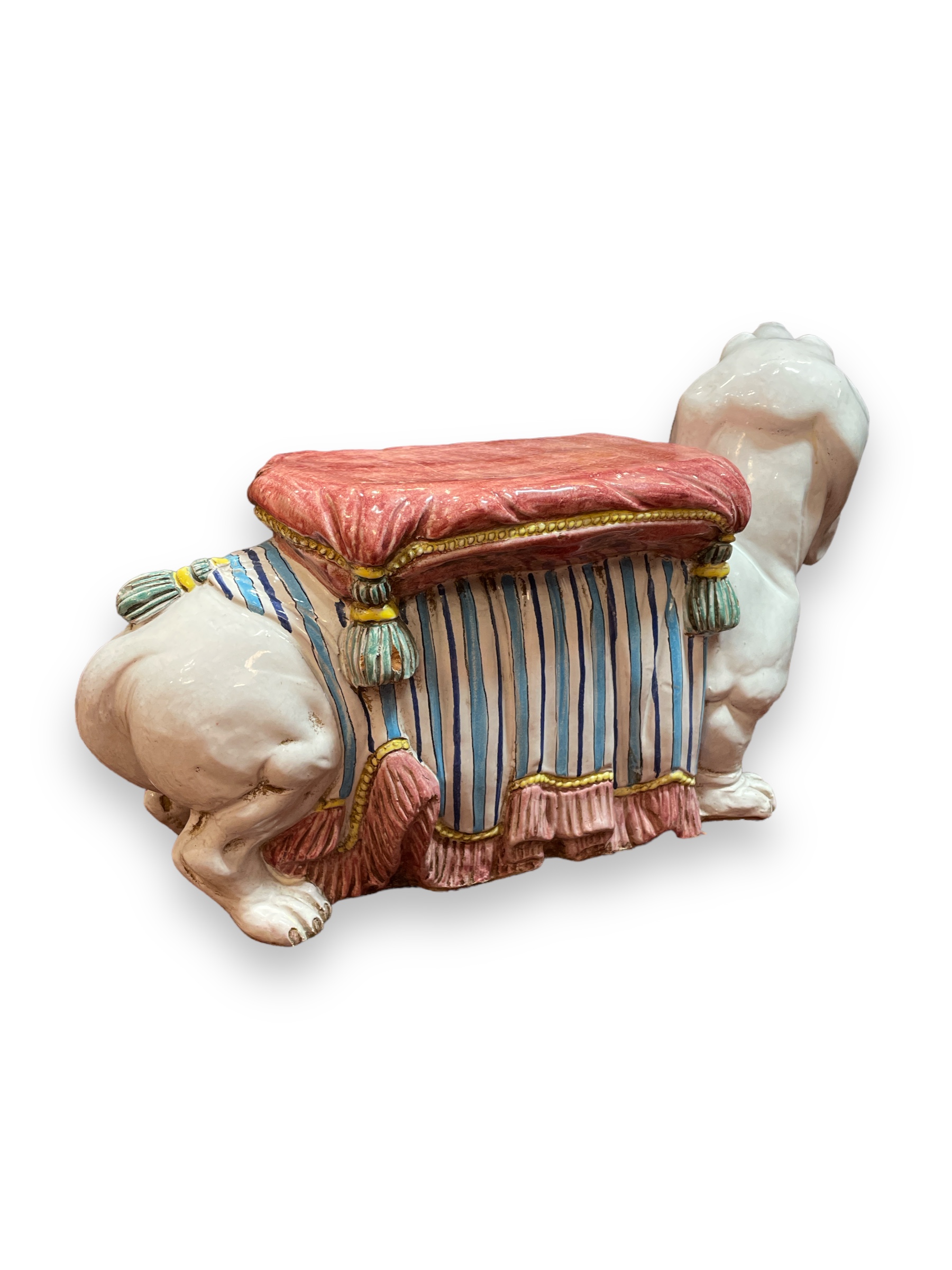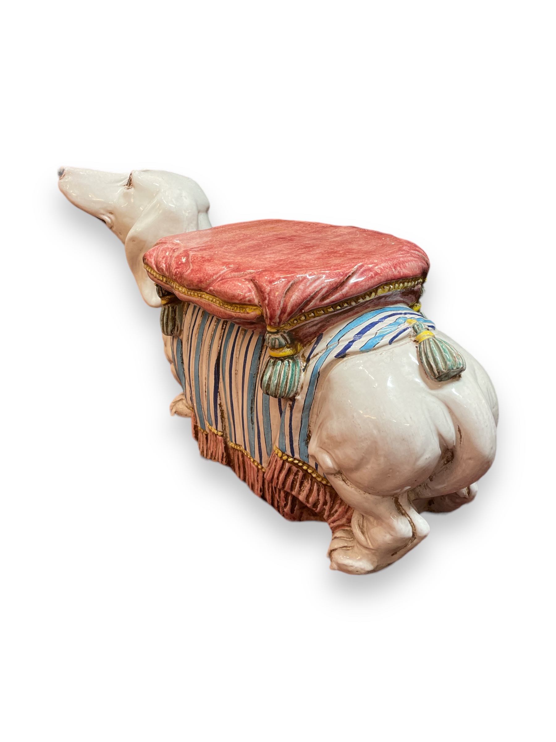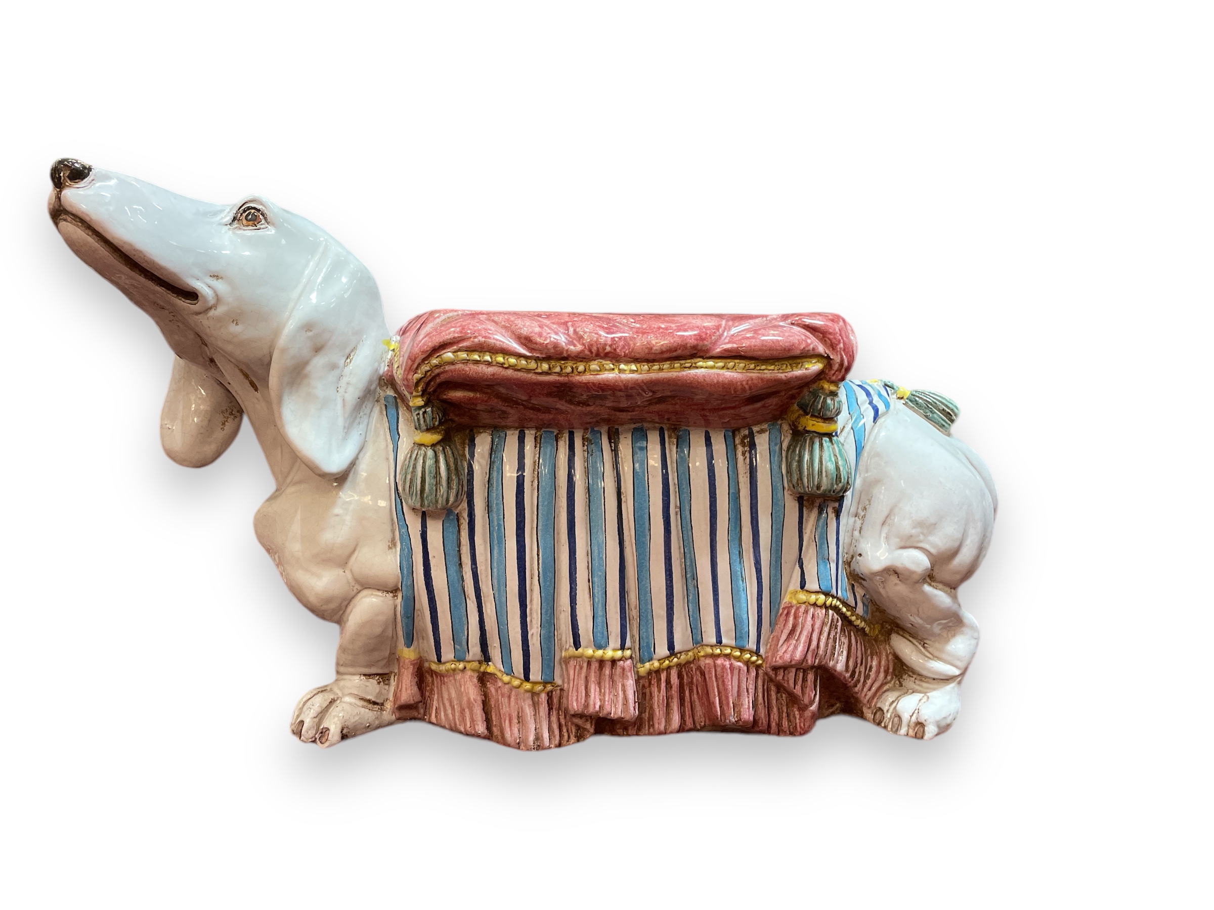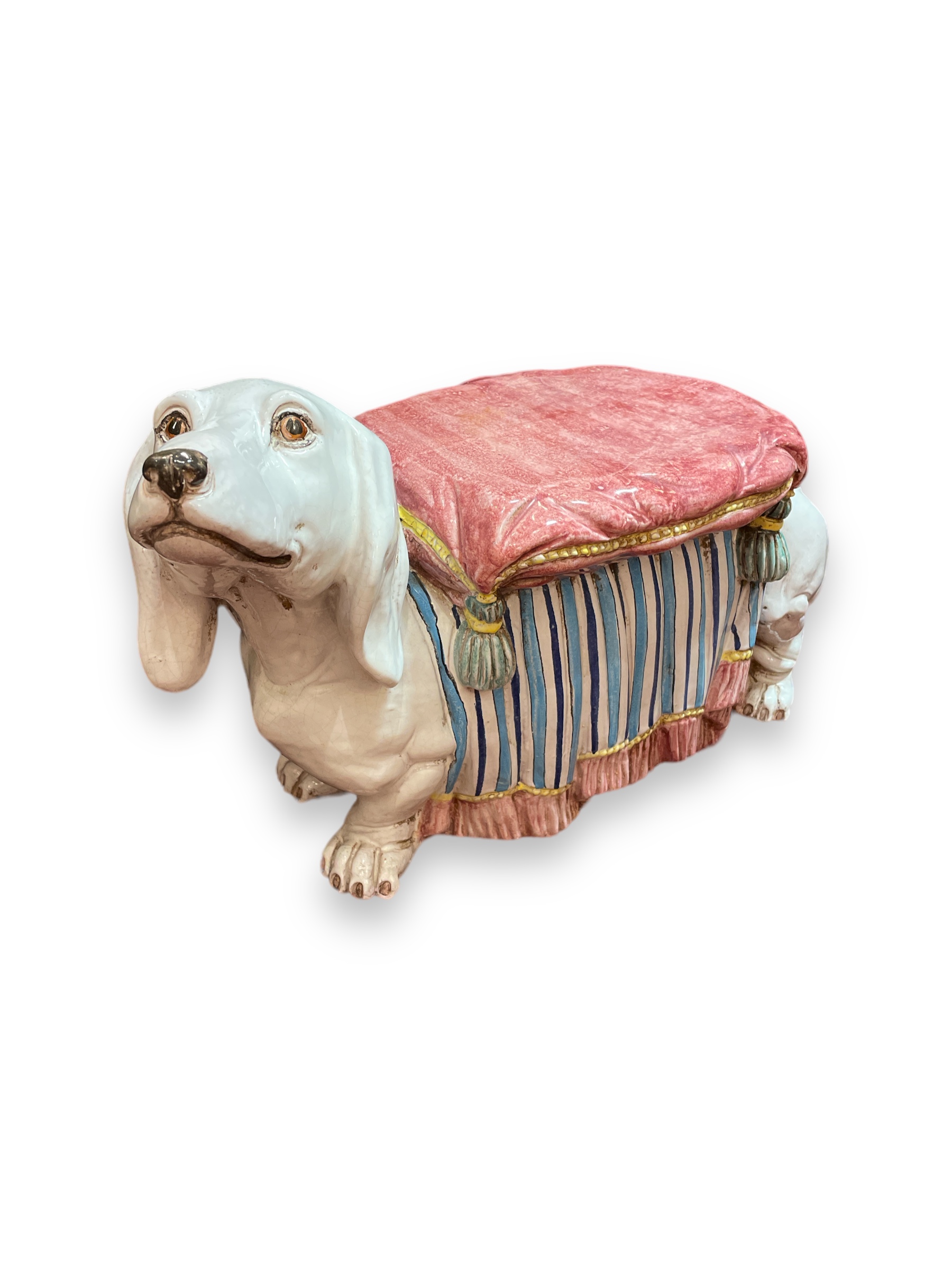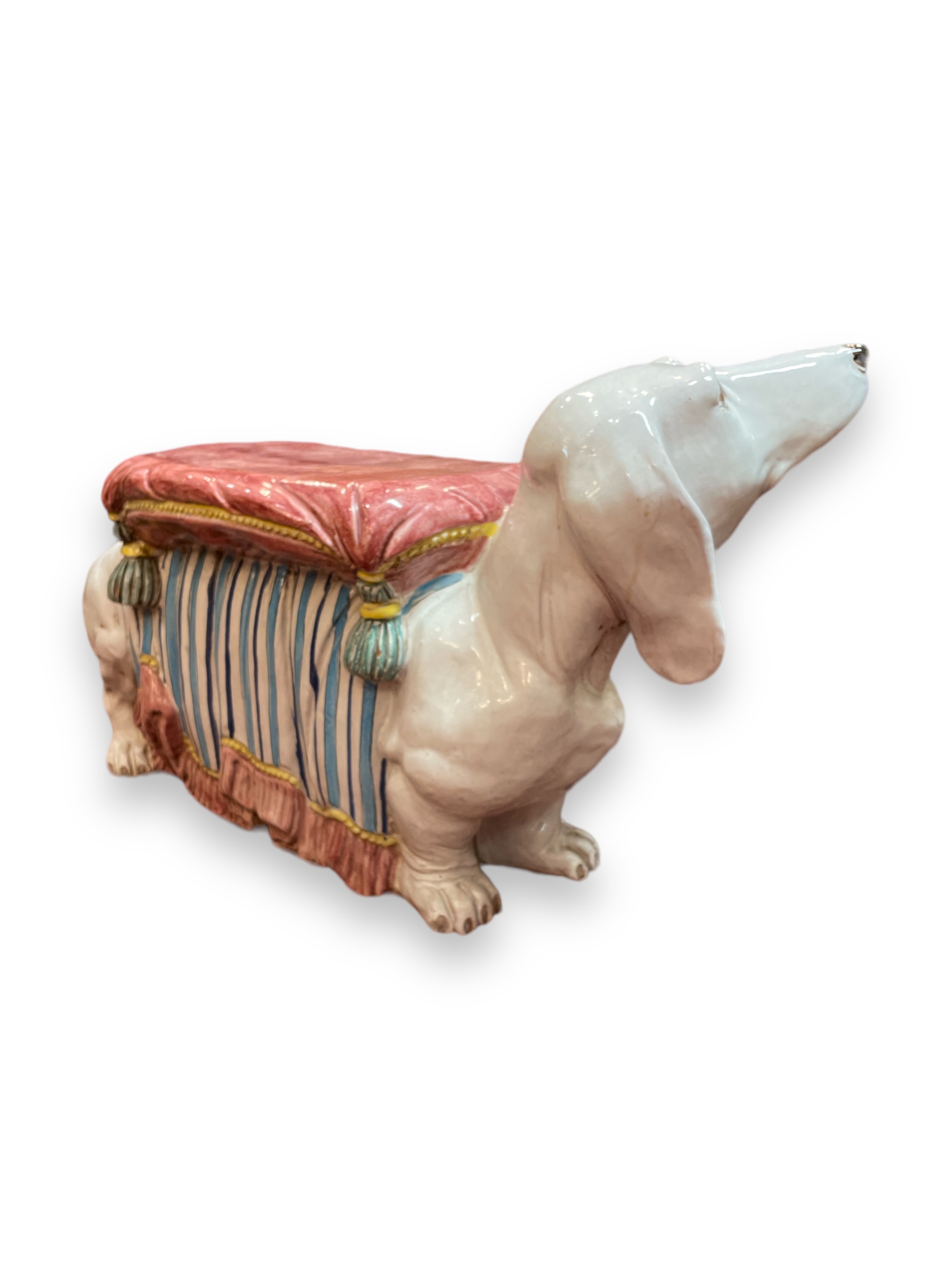 Italian ceramic dachshund form footstool. Circa 1950.