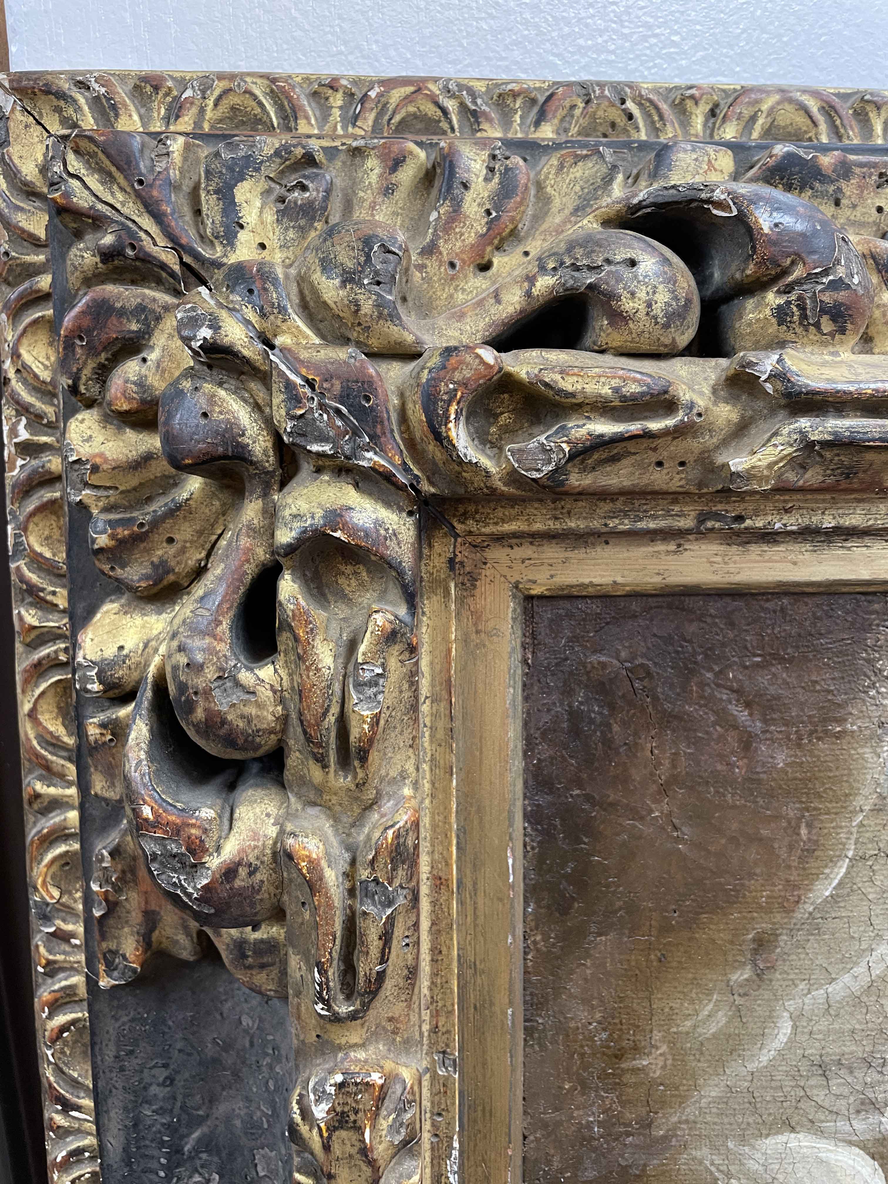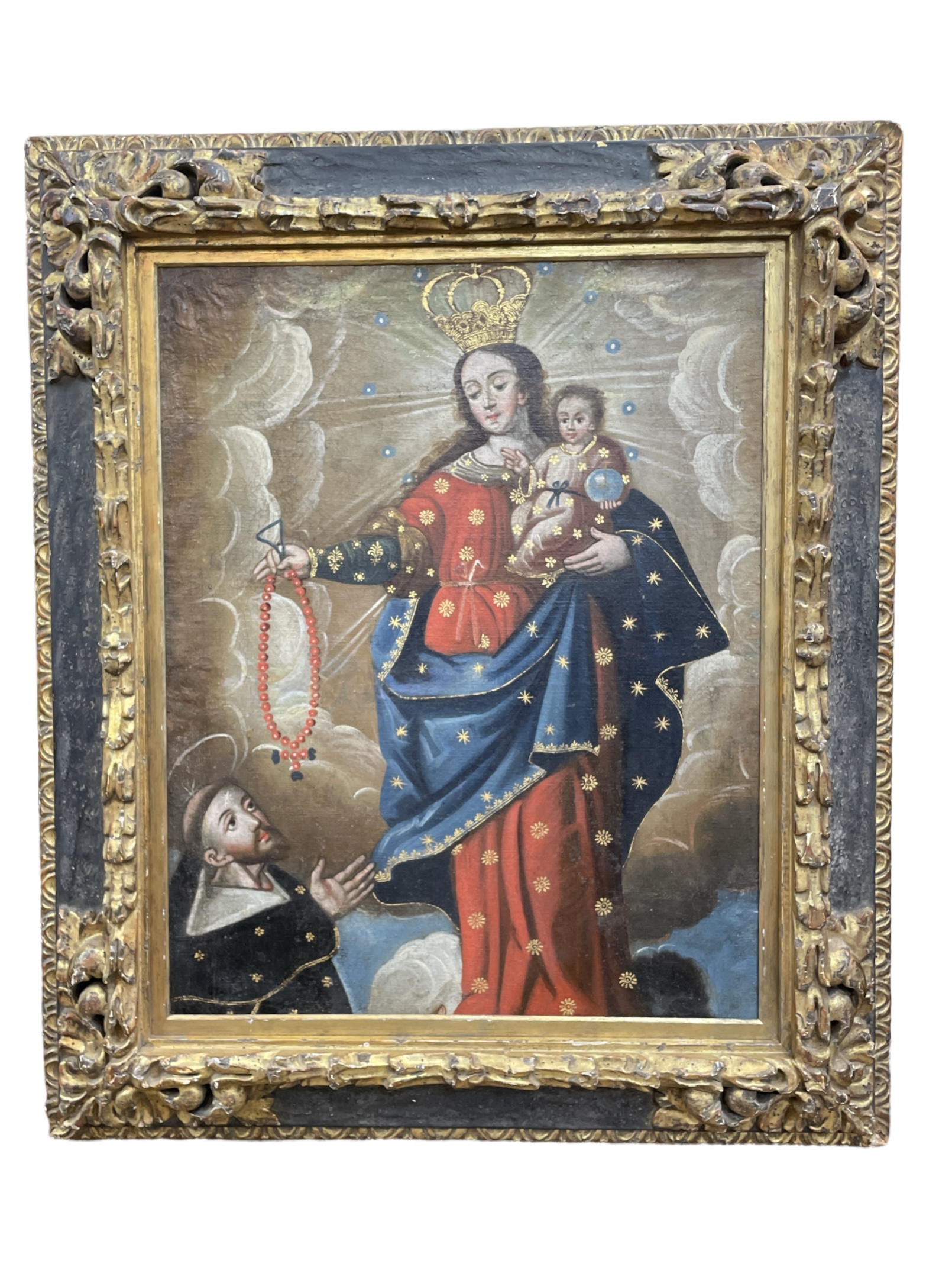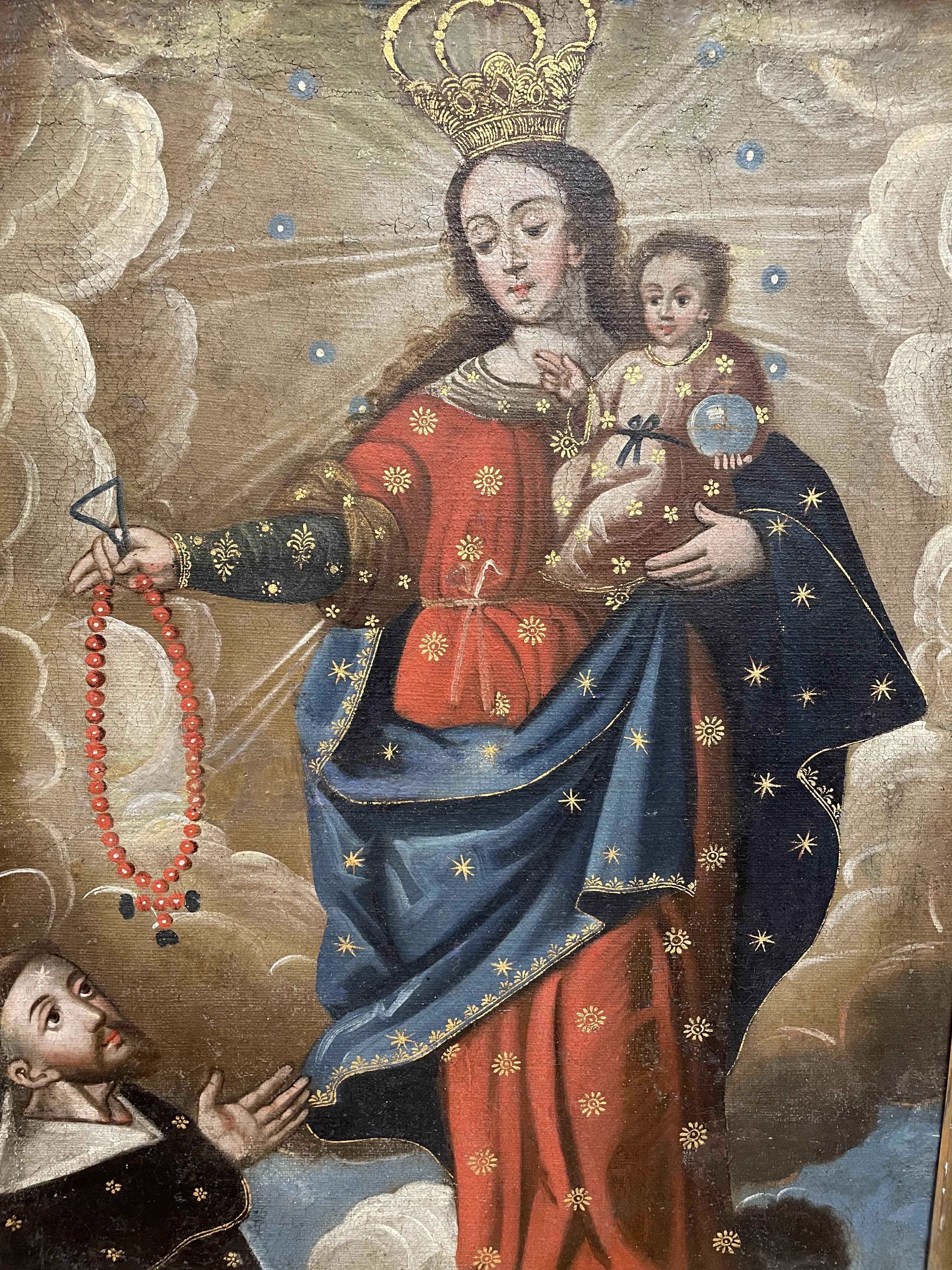 18th/ 19th C Spanish Colonial, Cusco School oil on canvas painting of Madonna w/ child holding crystal orb w/ St. Anthony of Padua at her feet. Unsigned. (Painting is framed in a late 17th C Italian Renaissance polychrome gilt frame, #6699.) The paired piece is $12,995.