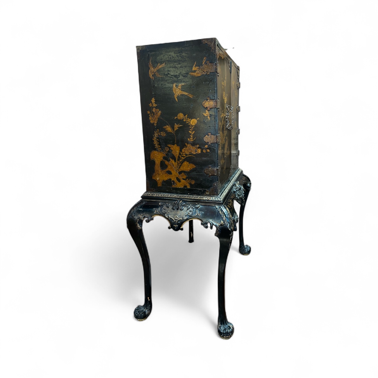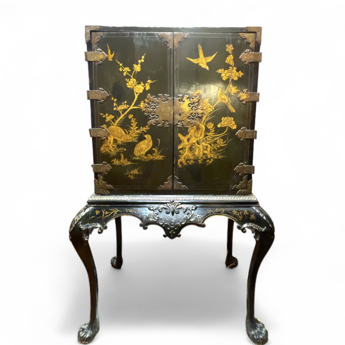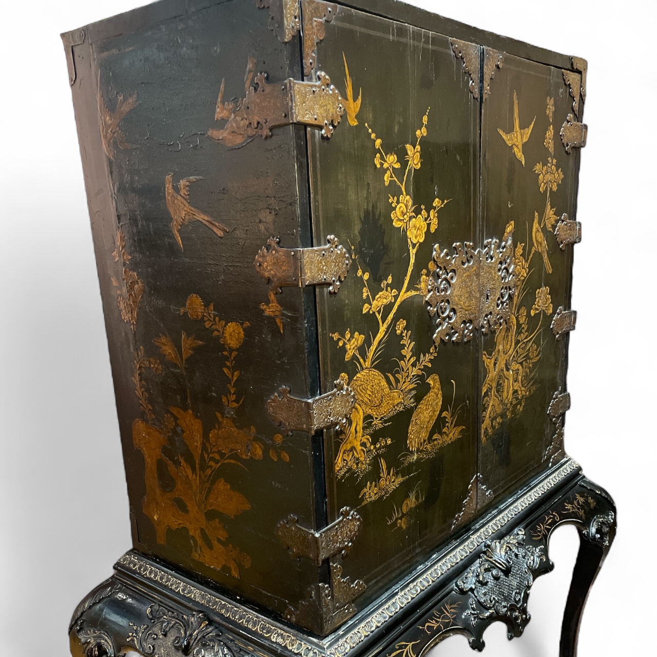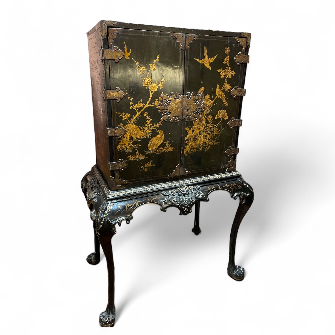 18th C cabinet on later stand; black chinoiserie Chinese lacquered and gilt decorated cabinet-England.