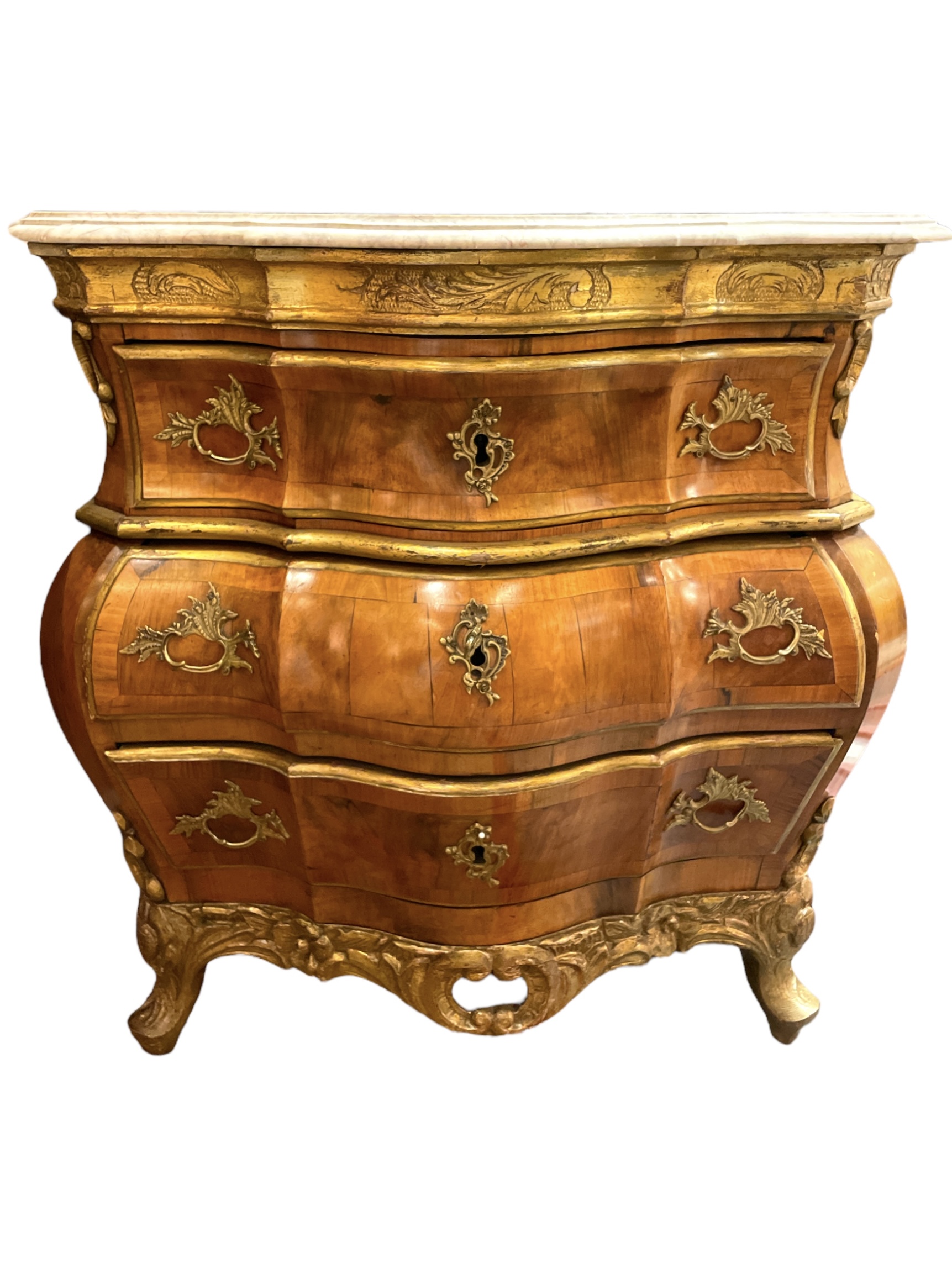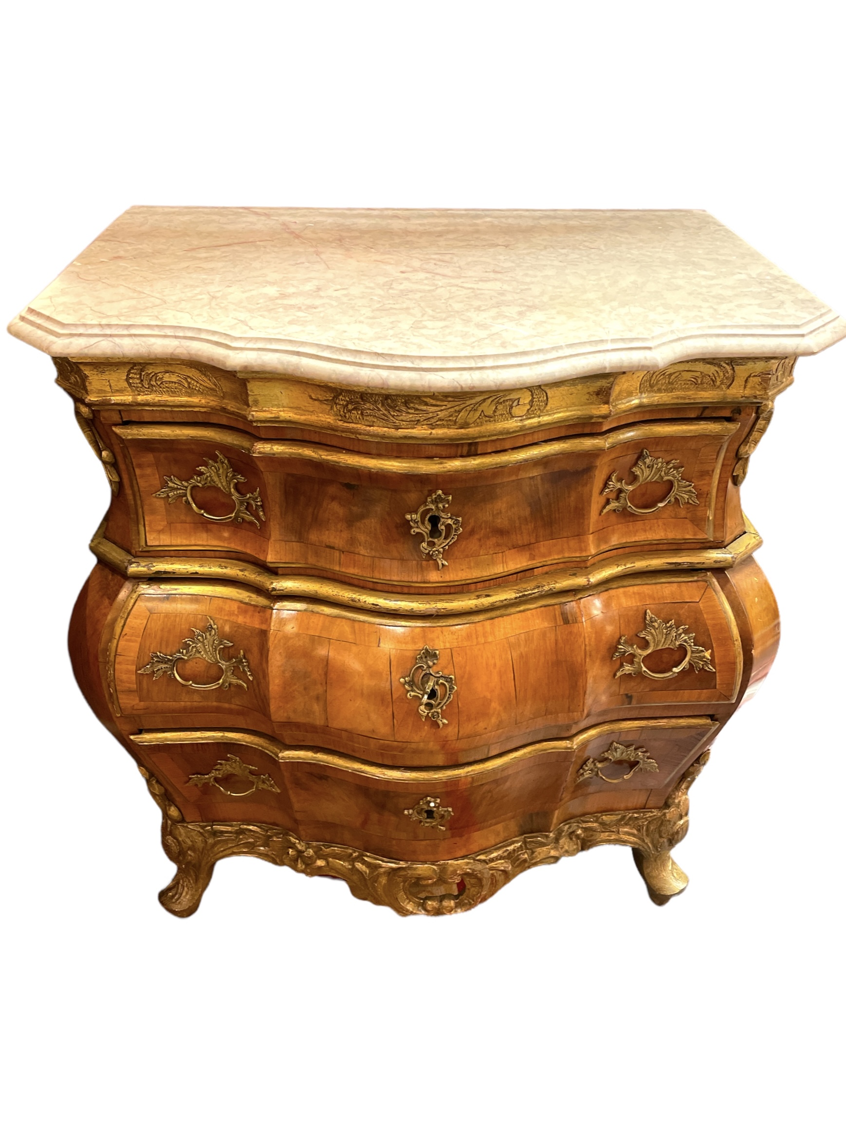 Mid-18th C diminutive Danish Rococo walnut commode with gold gilt detail in the manner of Matthias Ottomann with later marble top.