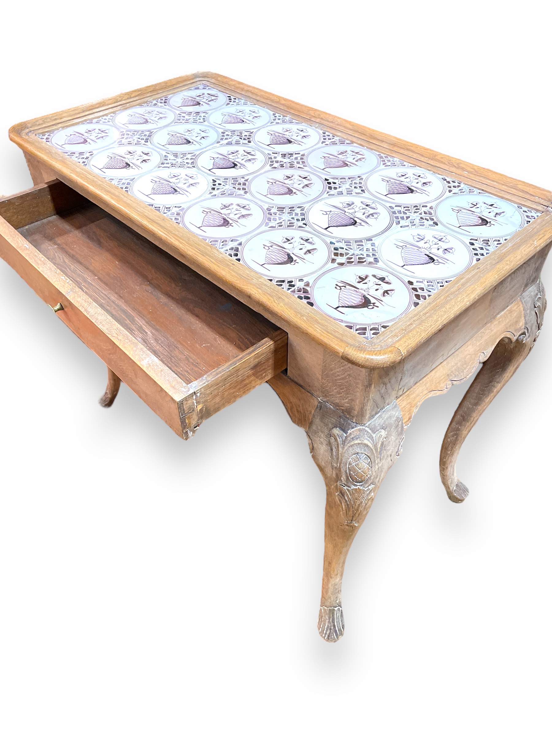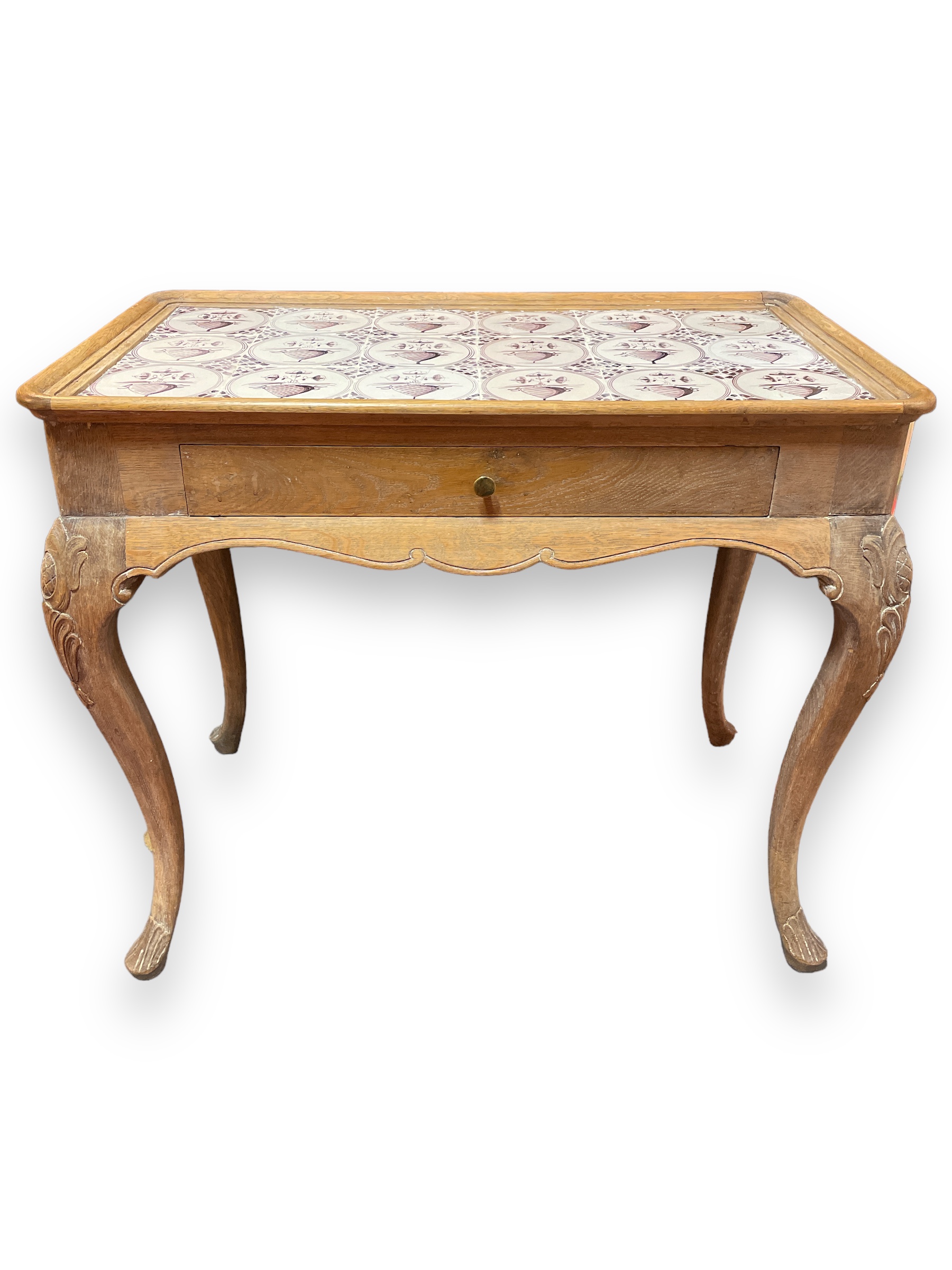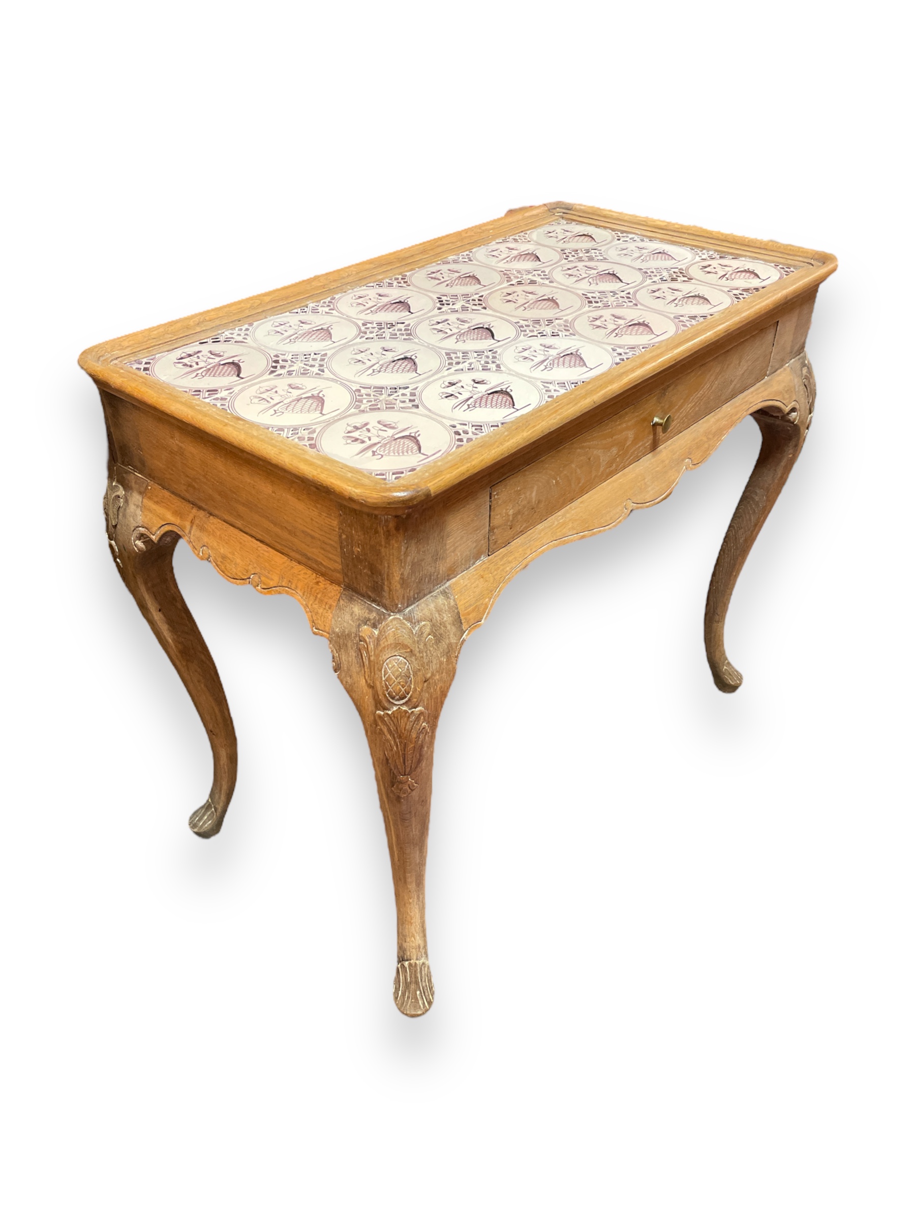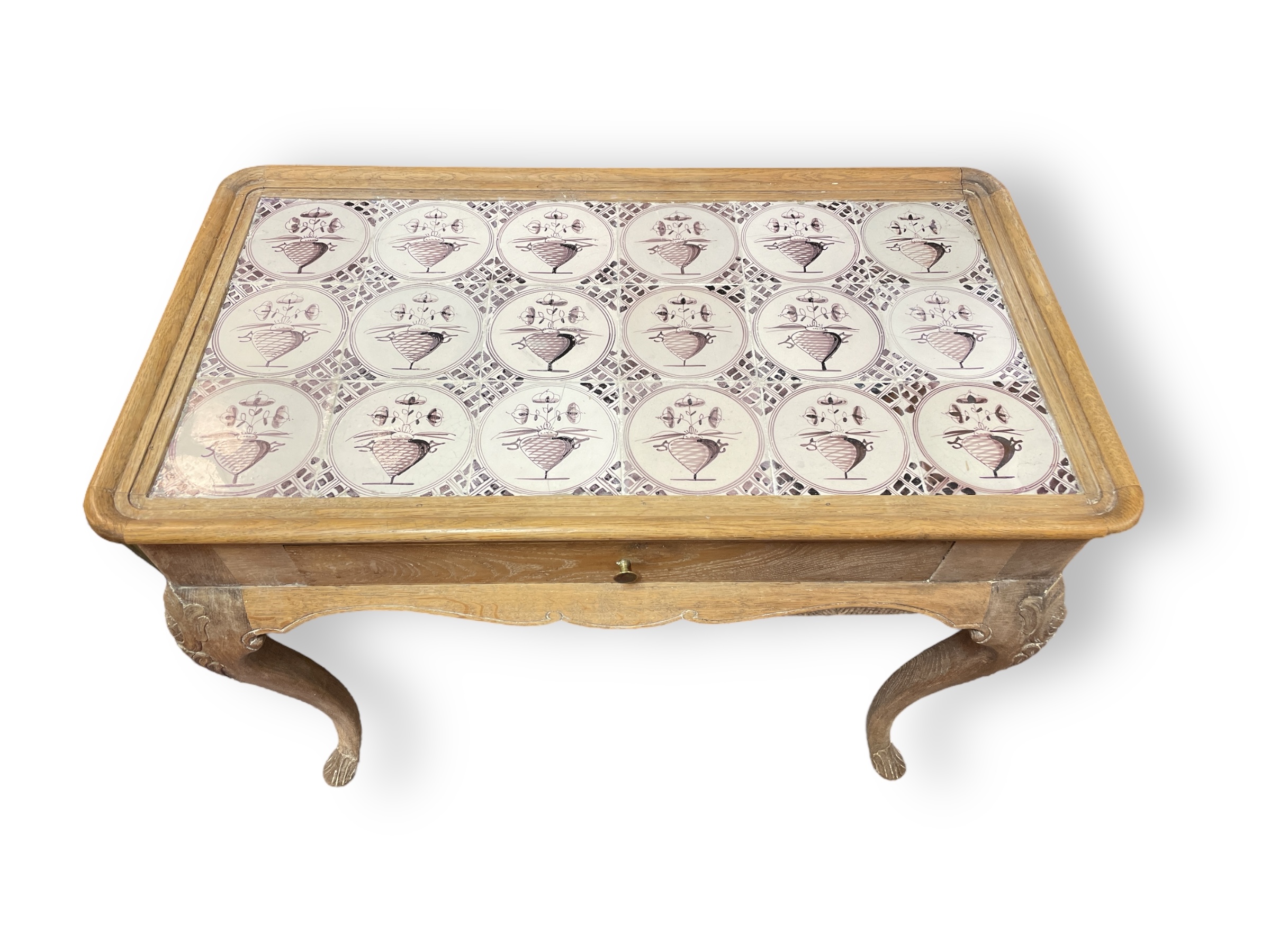 19th C Danish Rococo-style limed oak table with inset manganese Dutch Delft tile top (some tiles lifting, broken and cracked).