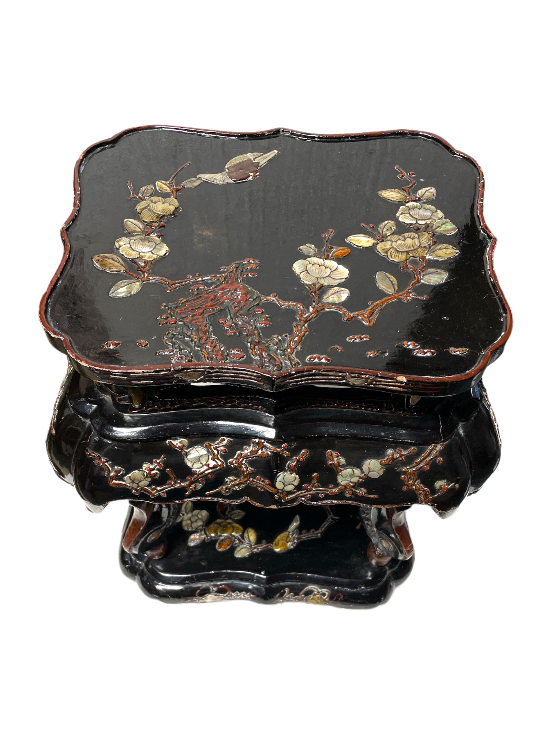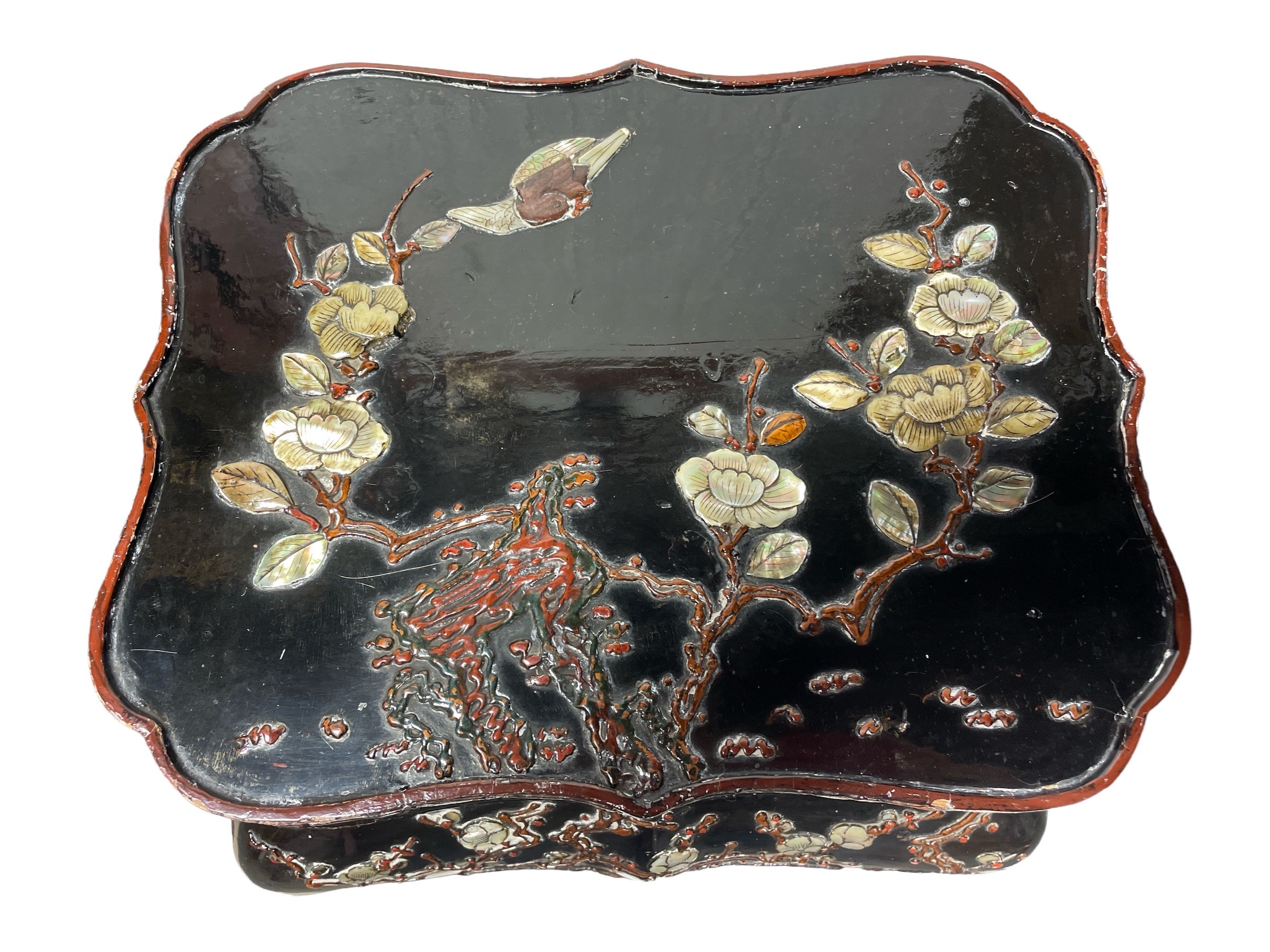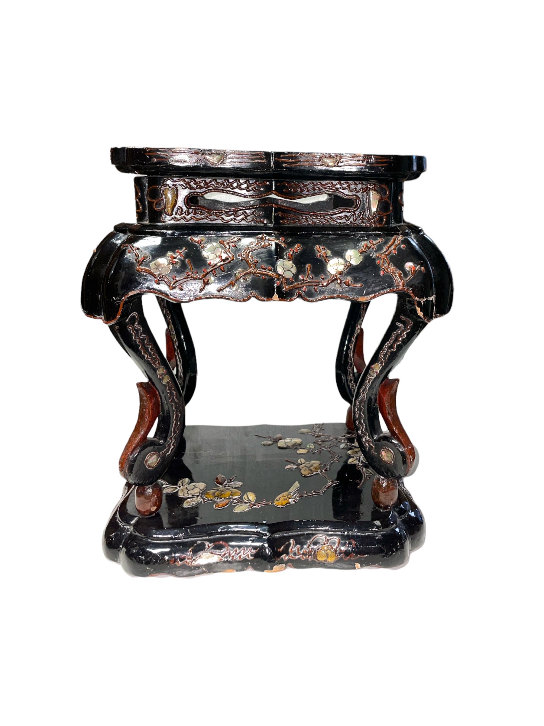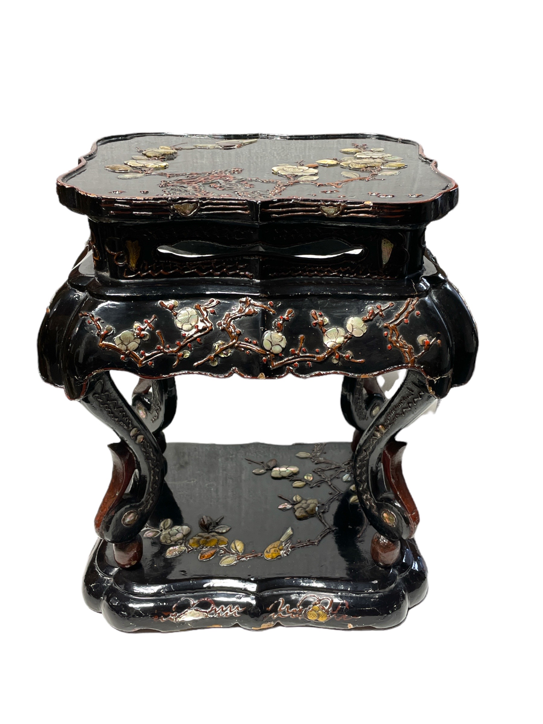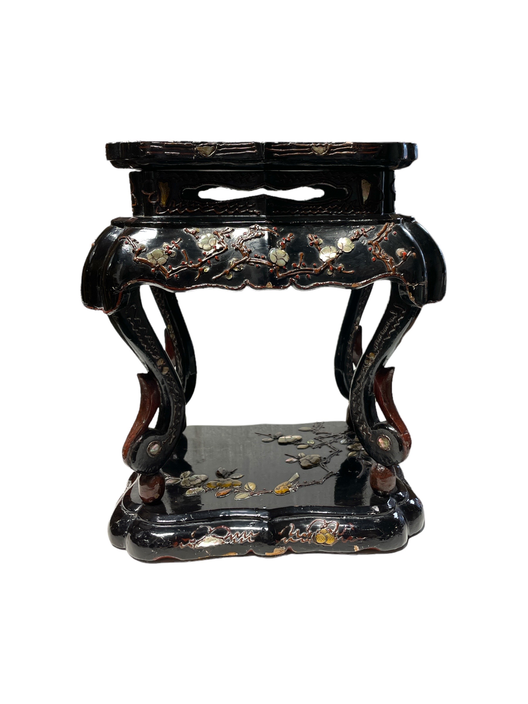 Late 19th C Chinese mother of pearl inlaid black lacquered stand.