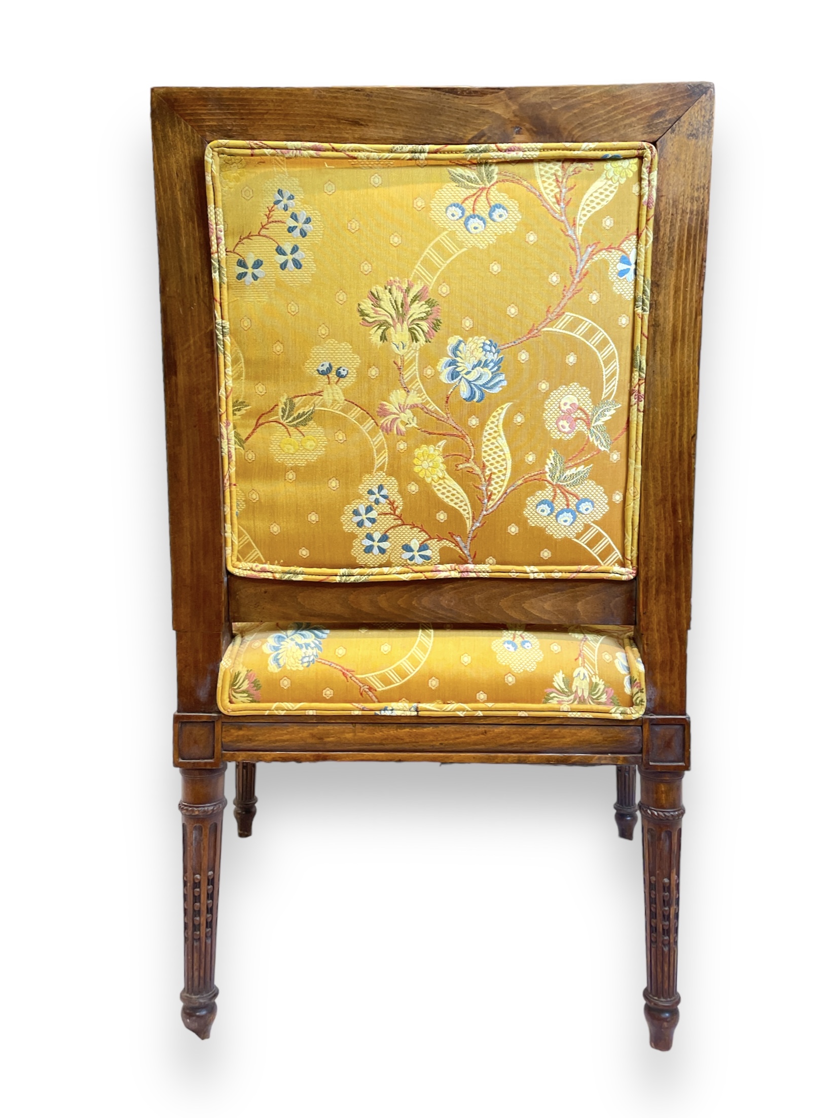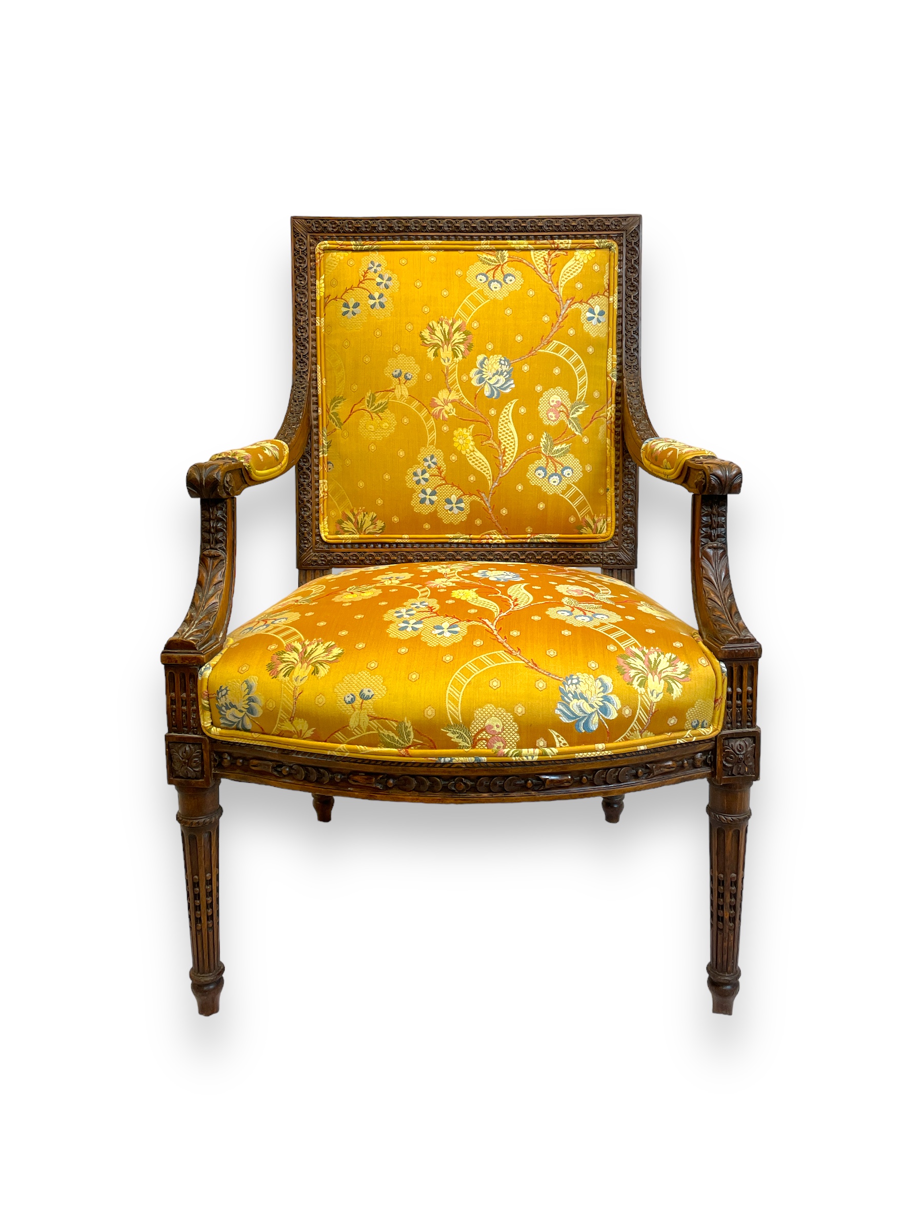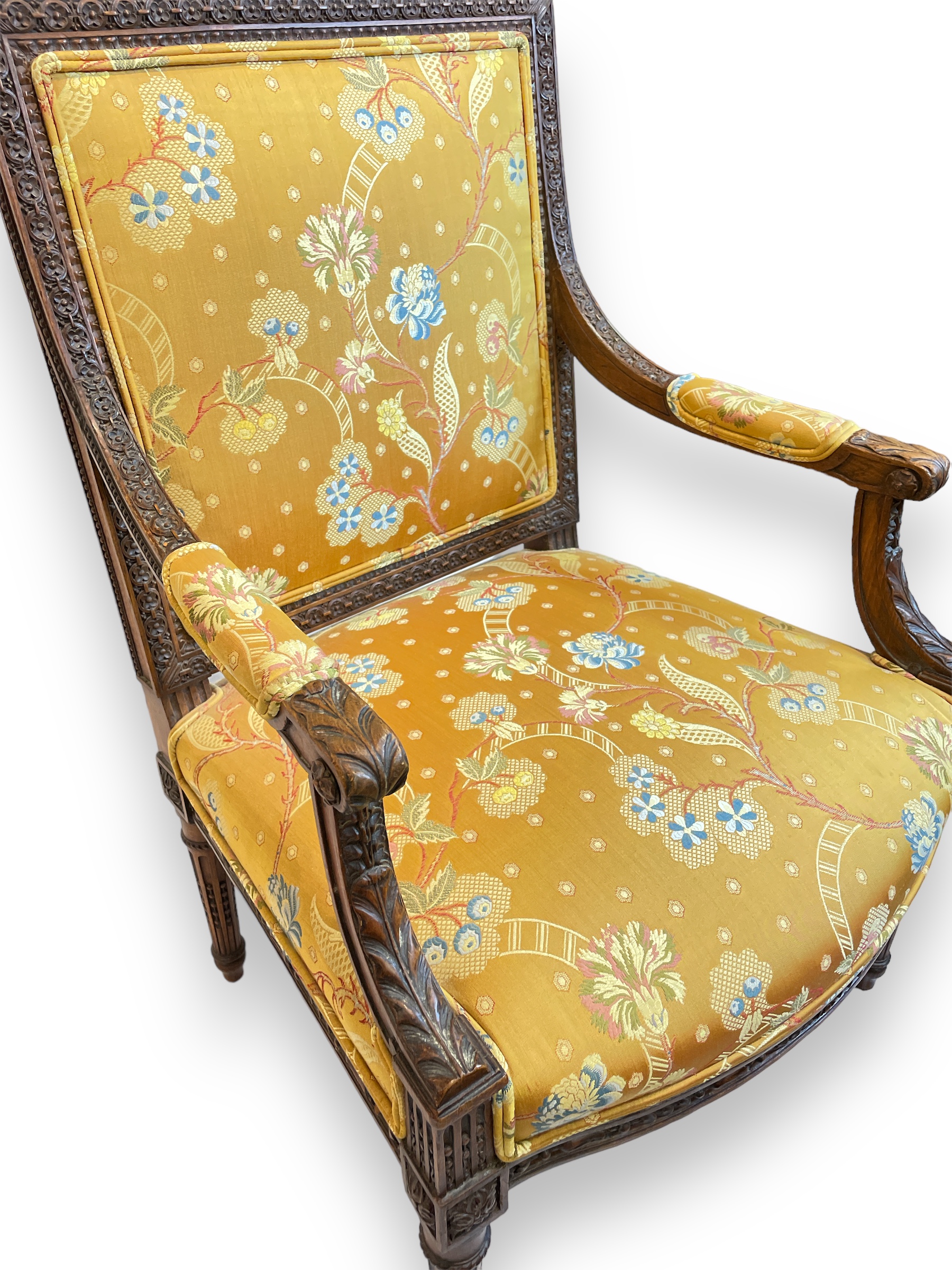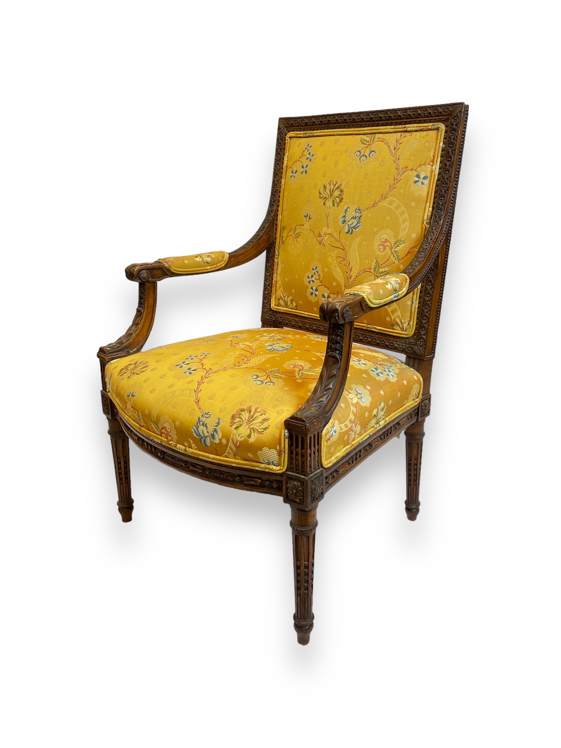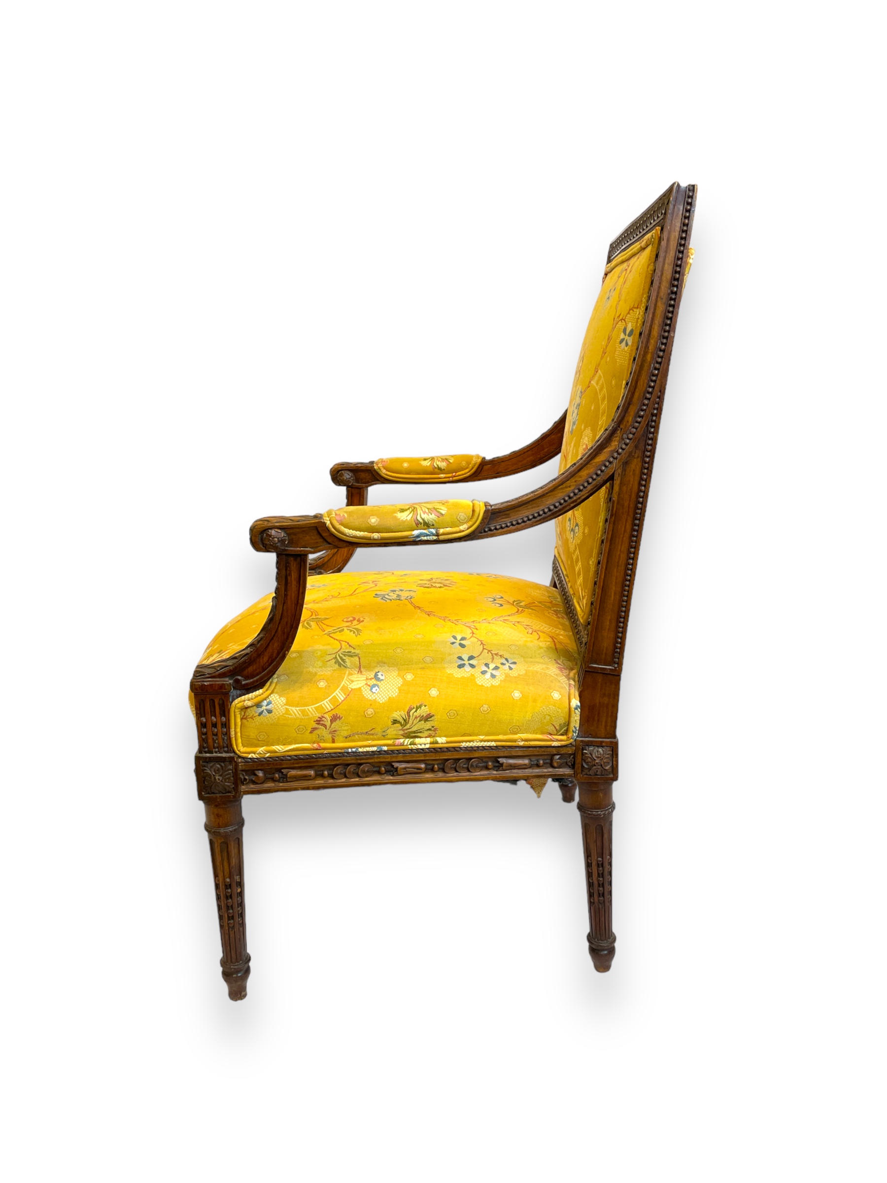 Louis XVI walnut fauteuil with silk fabric upholstery. (Living room)