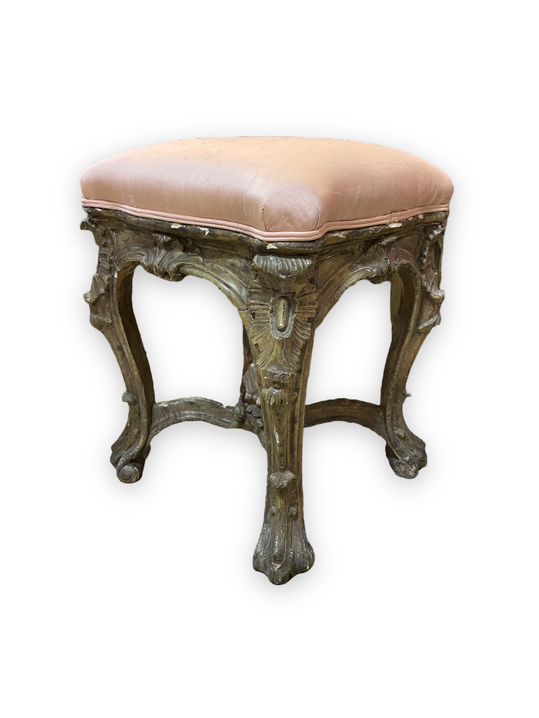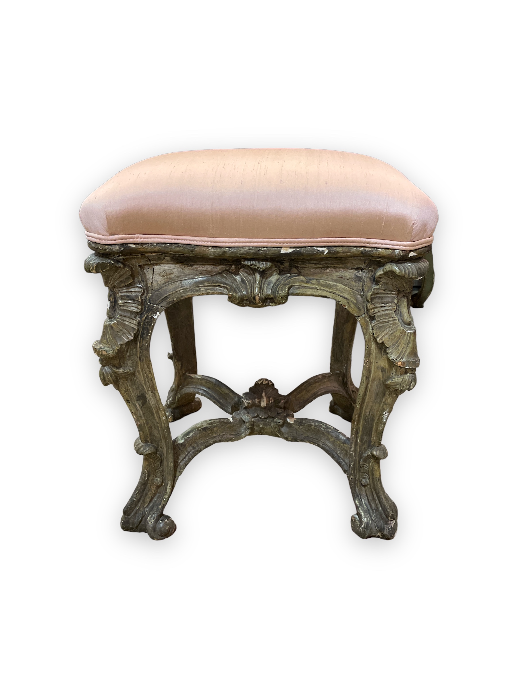 18th C Italian worn silver gilt footstool upholstered in light pink silk.