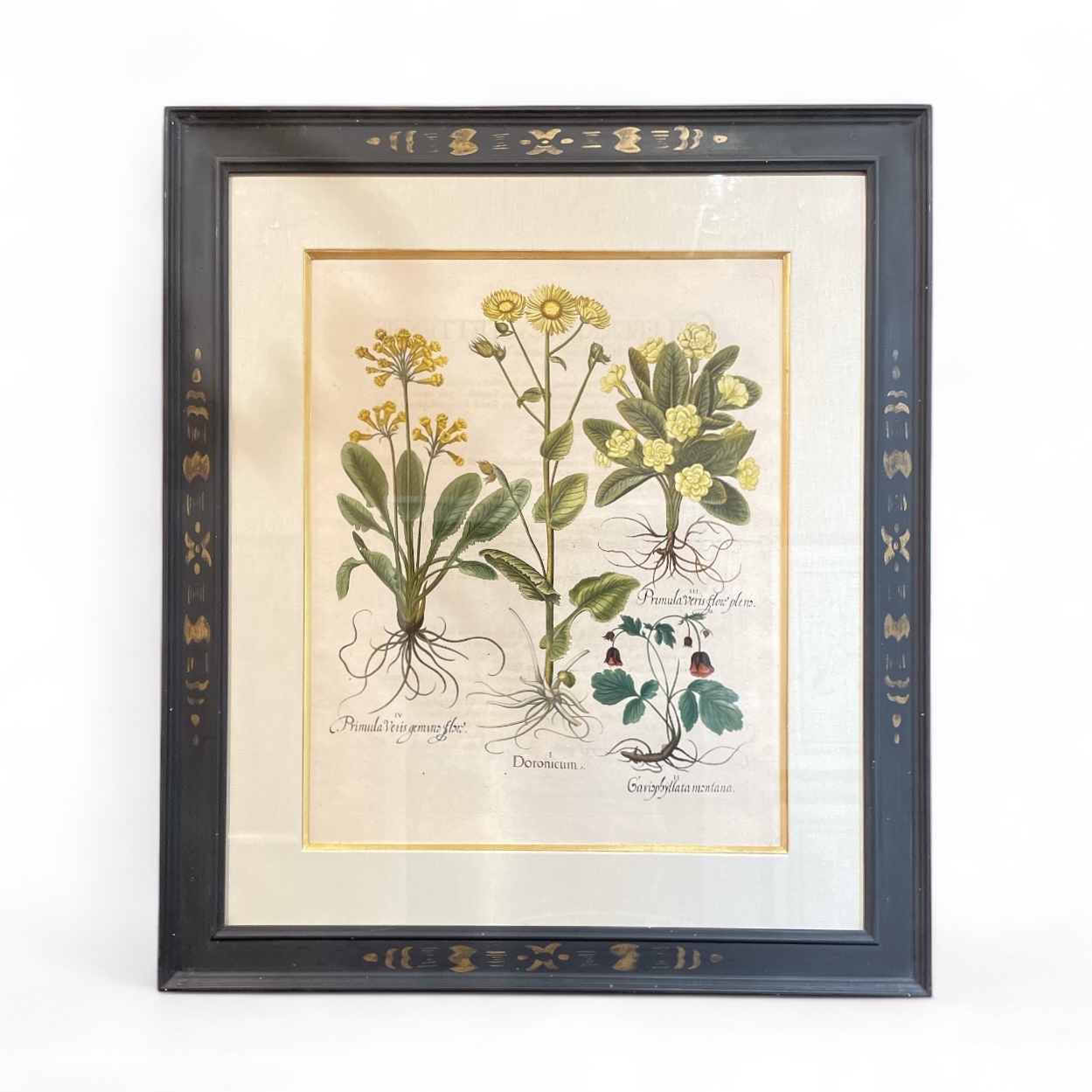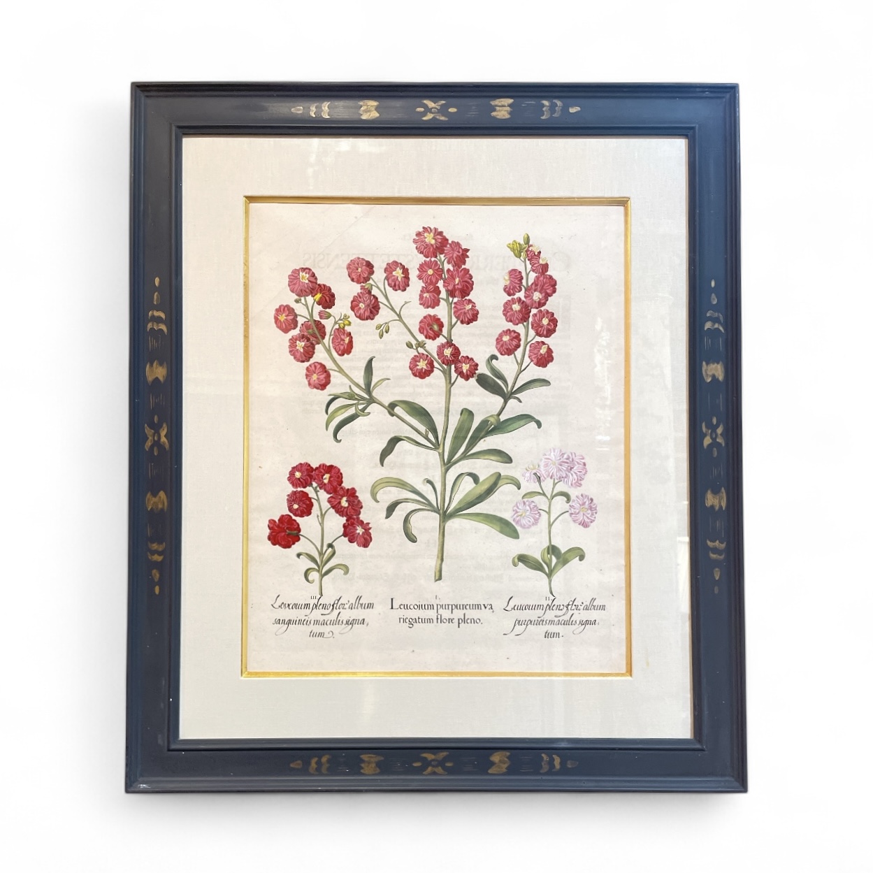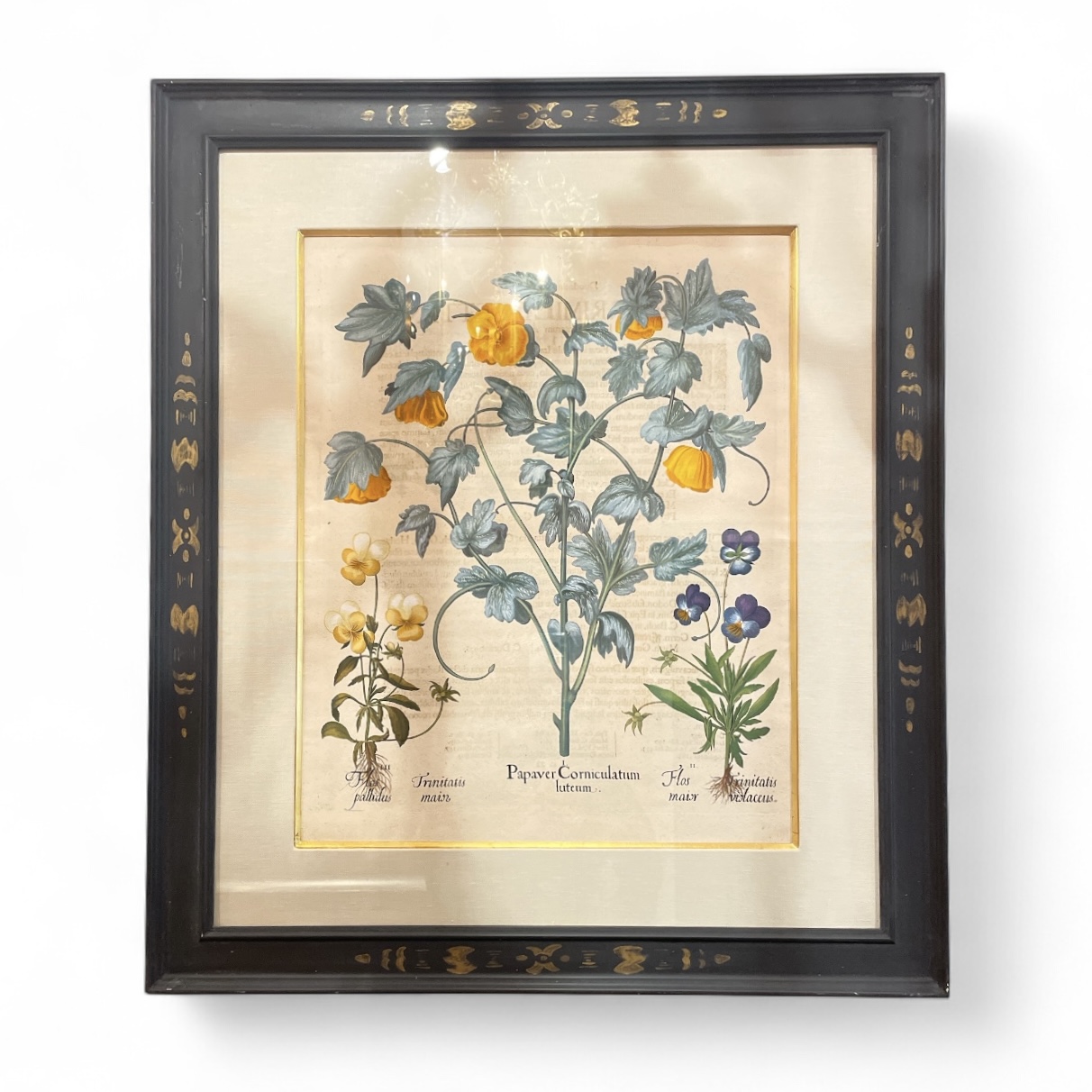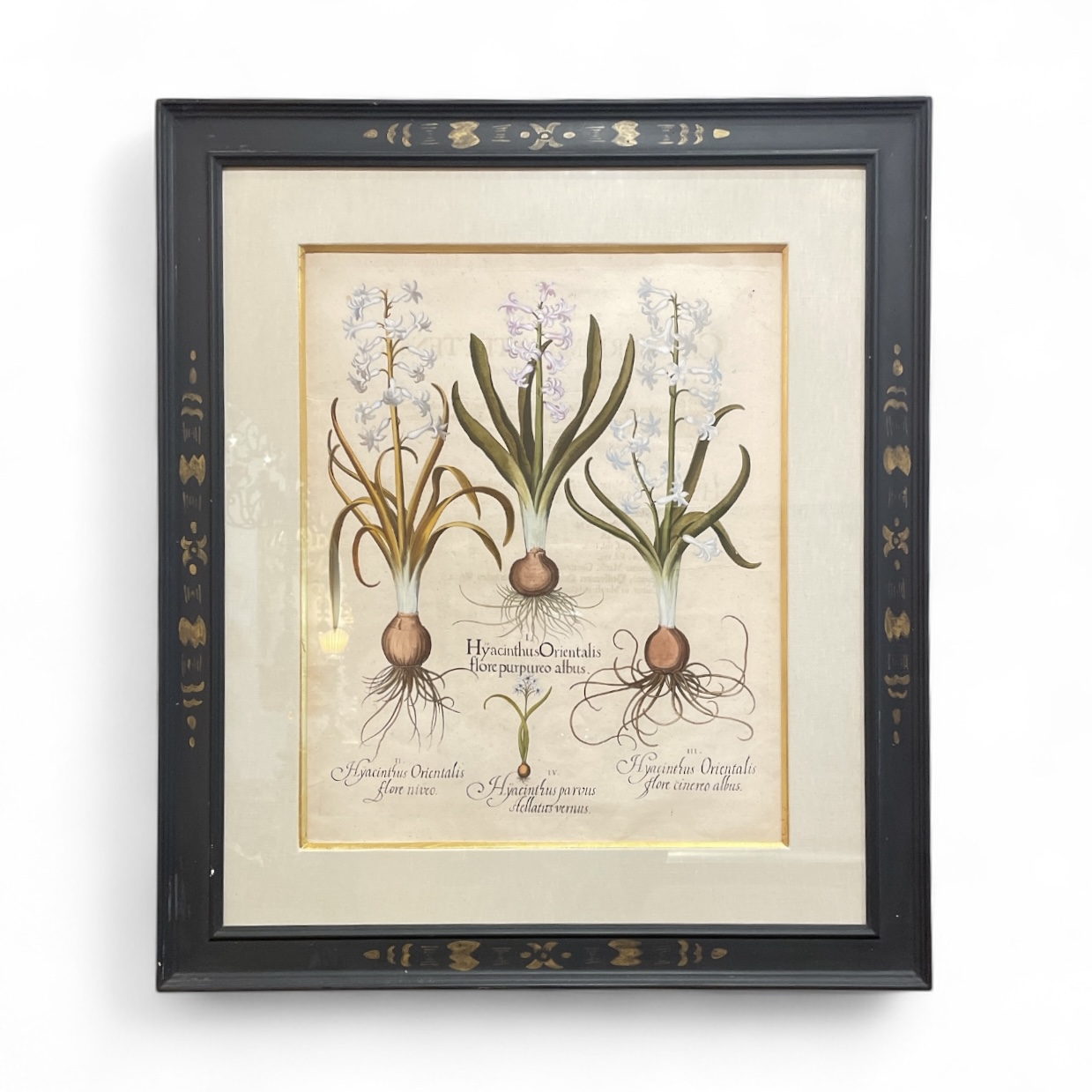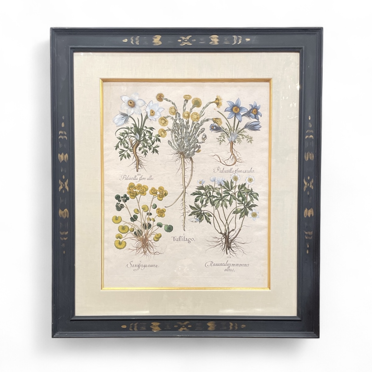 Five Basilus Besler (German 1561-1629) hand painted botanical copper engravings (c. 1720) in hand-painted custom frames.