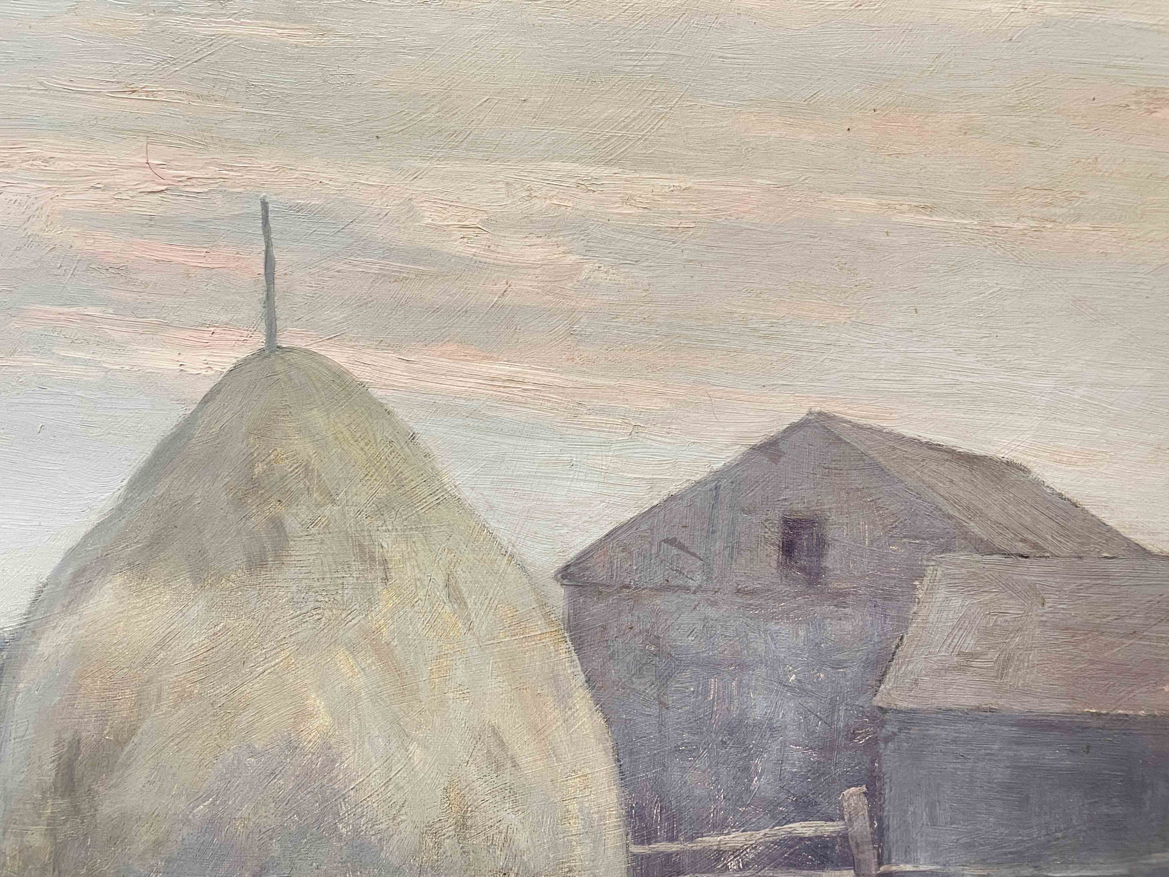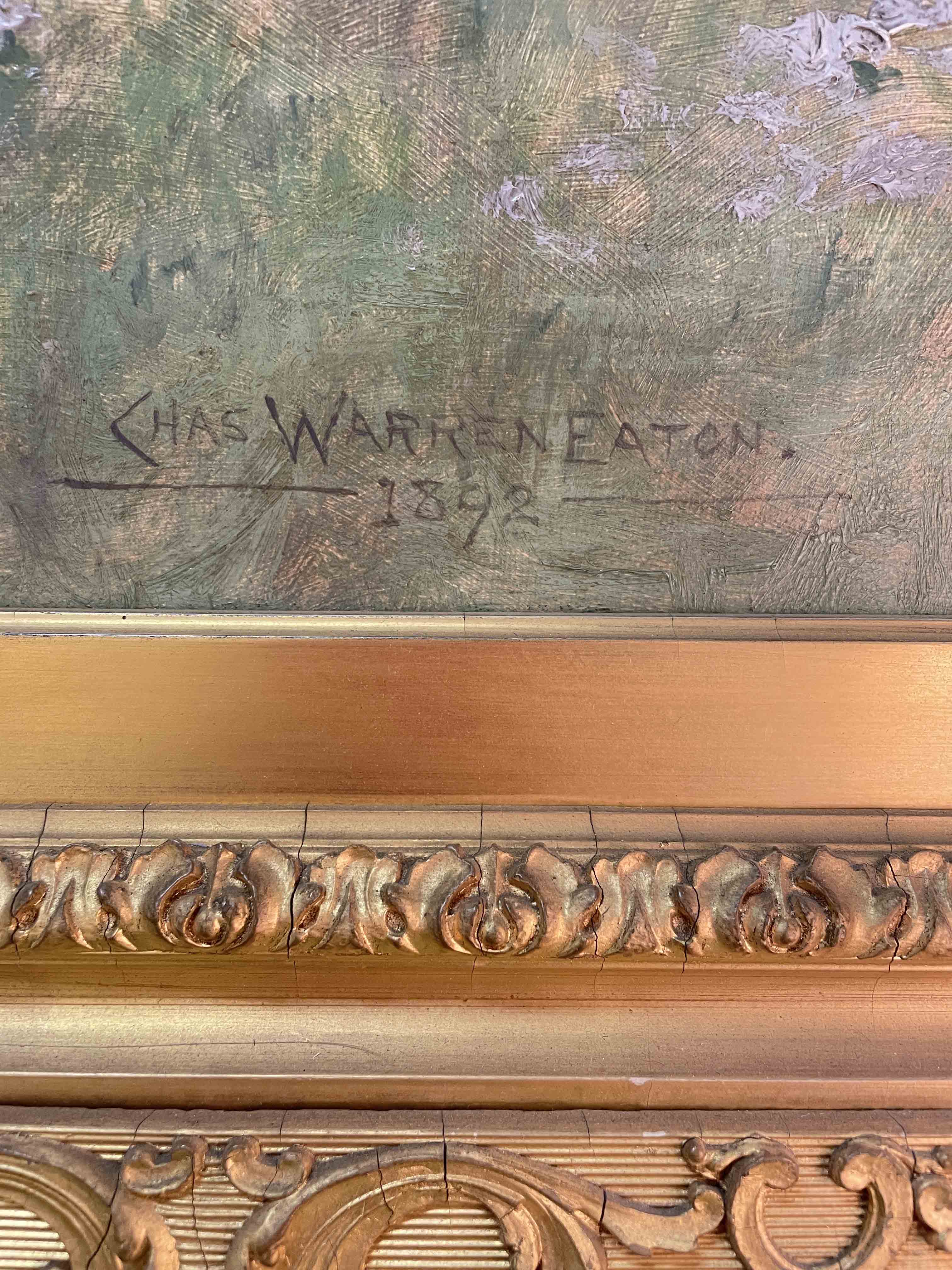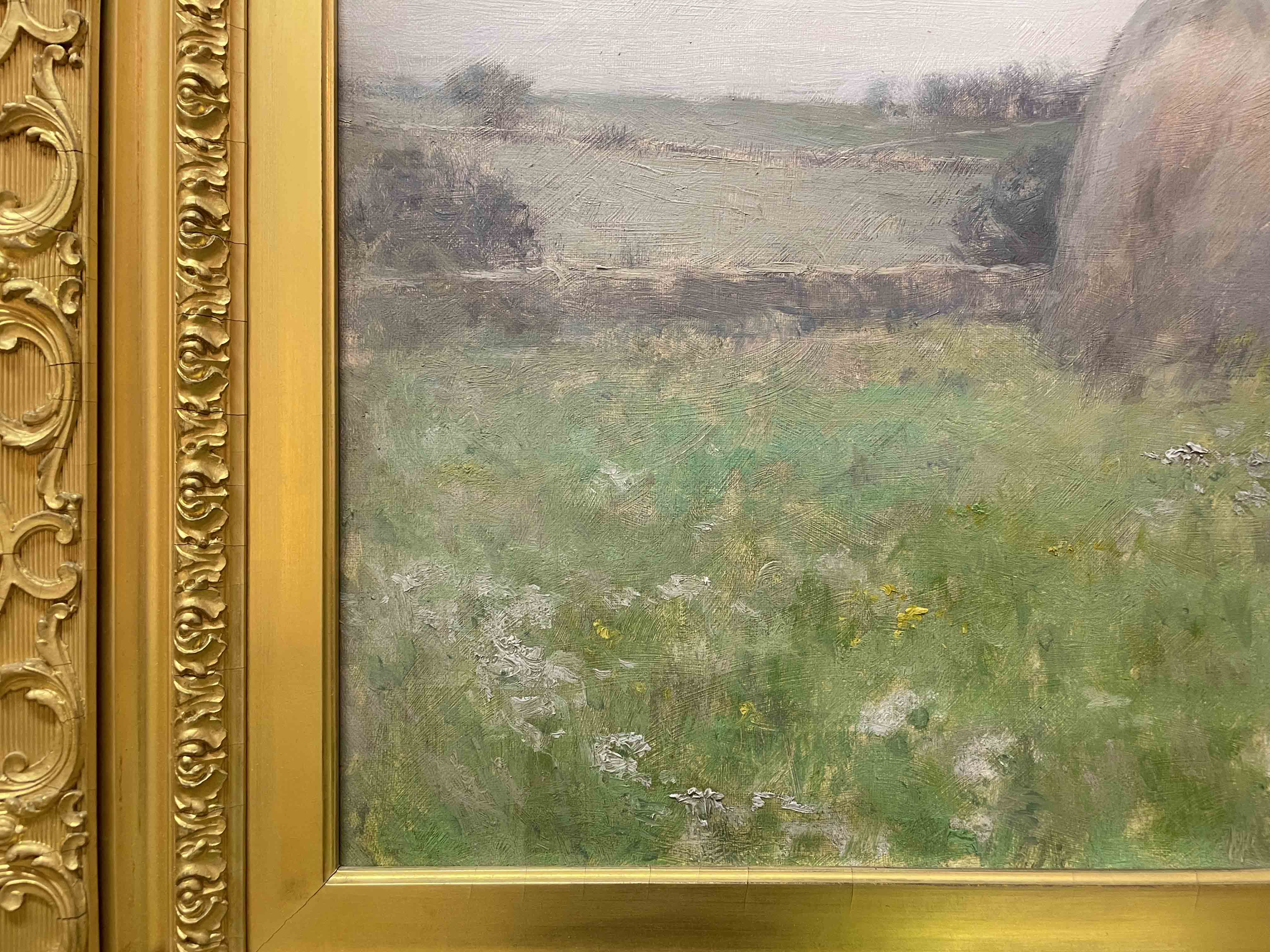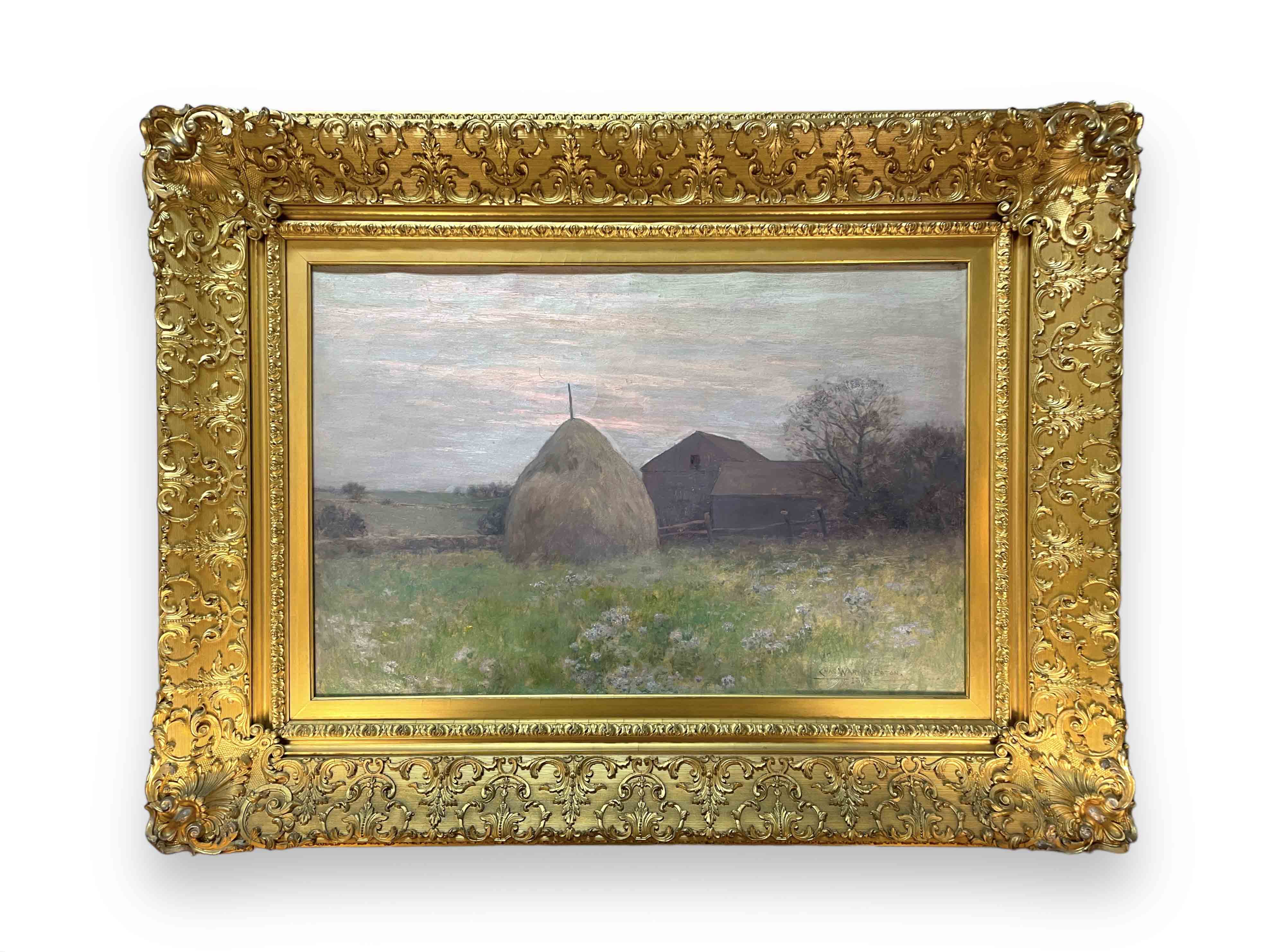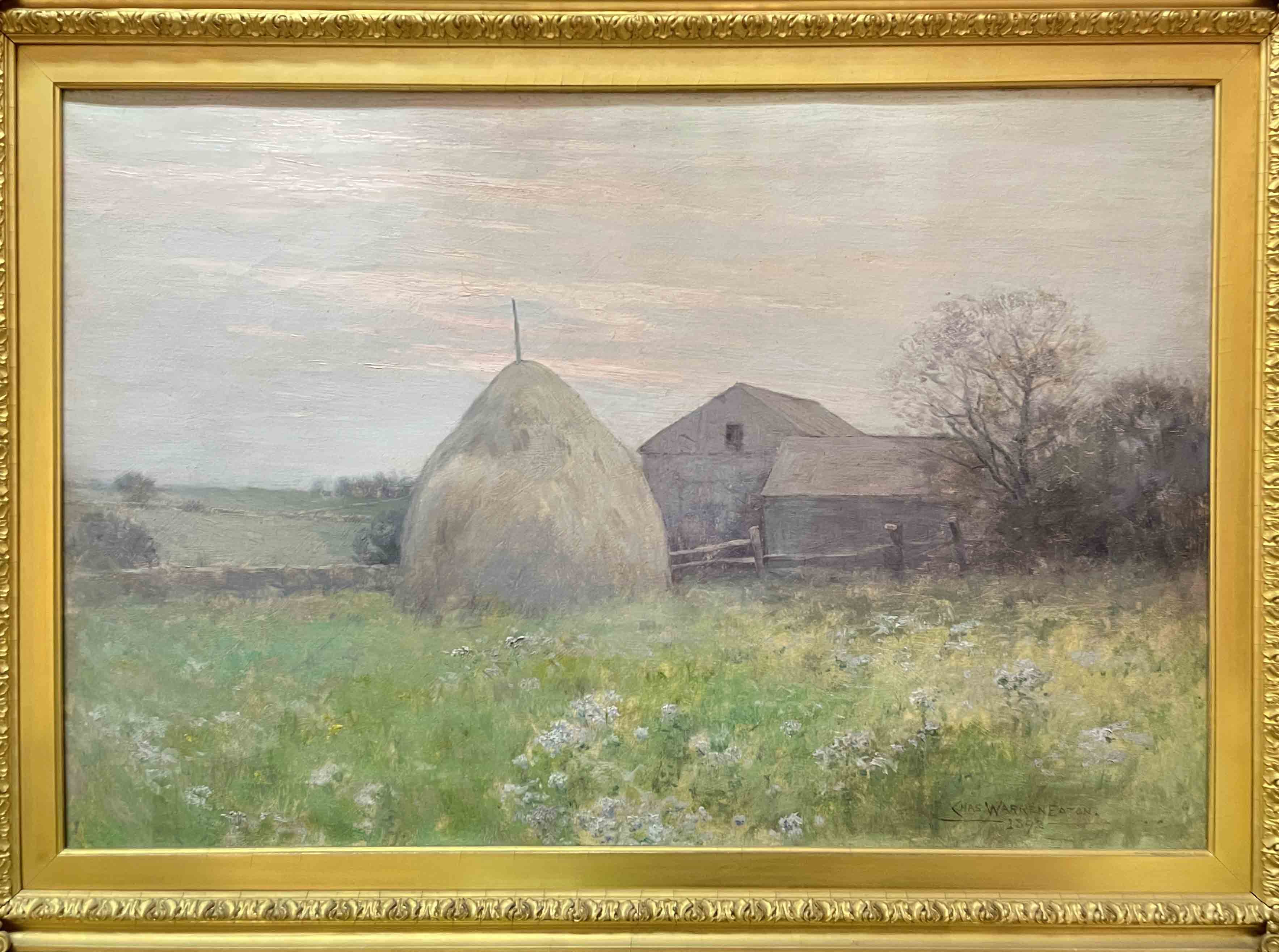 French Impressionist oil on canvas painting of a farm field w/ haystack and barn in gold gilt frame by Charles Warren Eaton, dated 1892.
