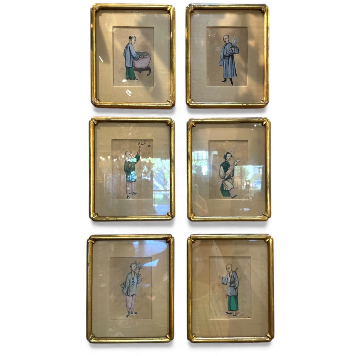 Set of 6 (c. 1840) Chinese Export watercolor paintings on pith paper of figures in traditional dress, framed.